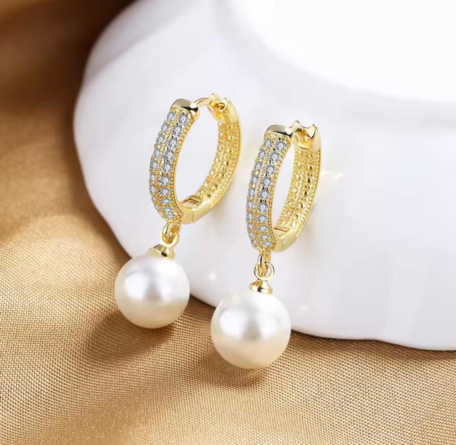 These stunning hoop earrings feature a rich gold-plated loop intricately set with brilliant micro-pave stones and finished with a dangling luminous faux pearl. They offer a perfect balance of dazzling sparkle and classic, creamy elegance.