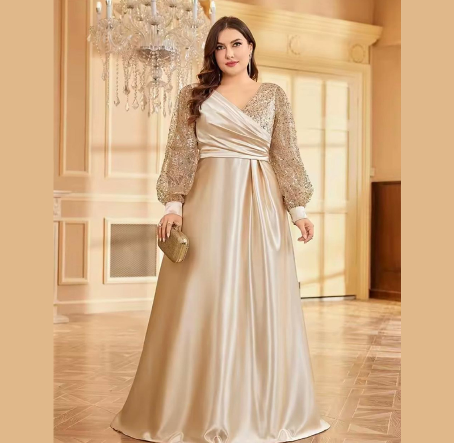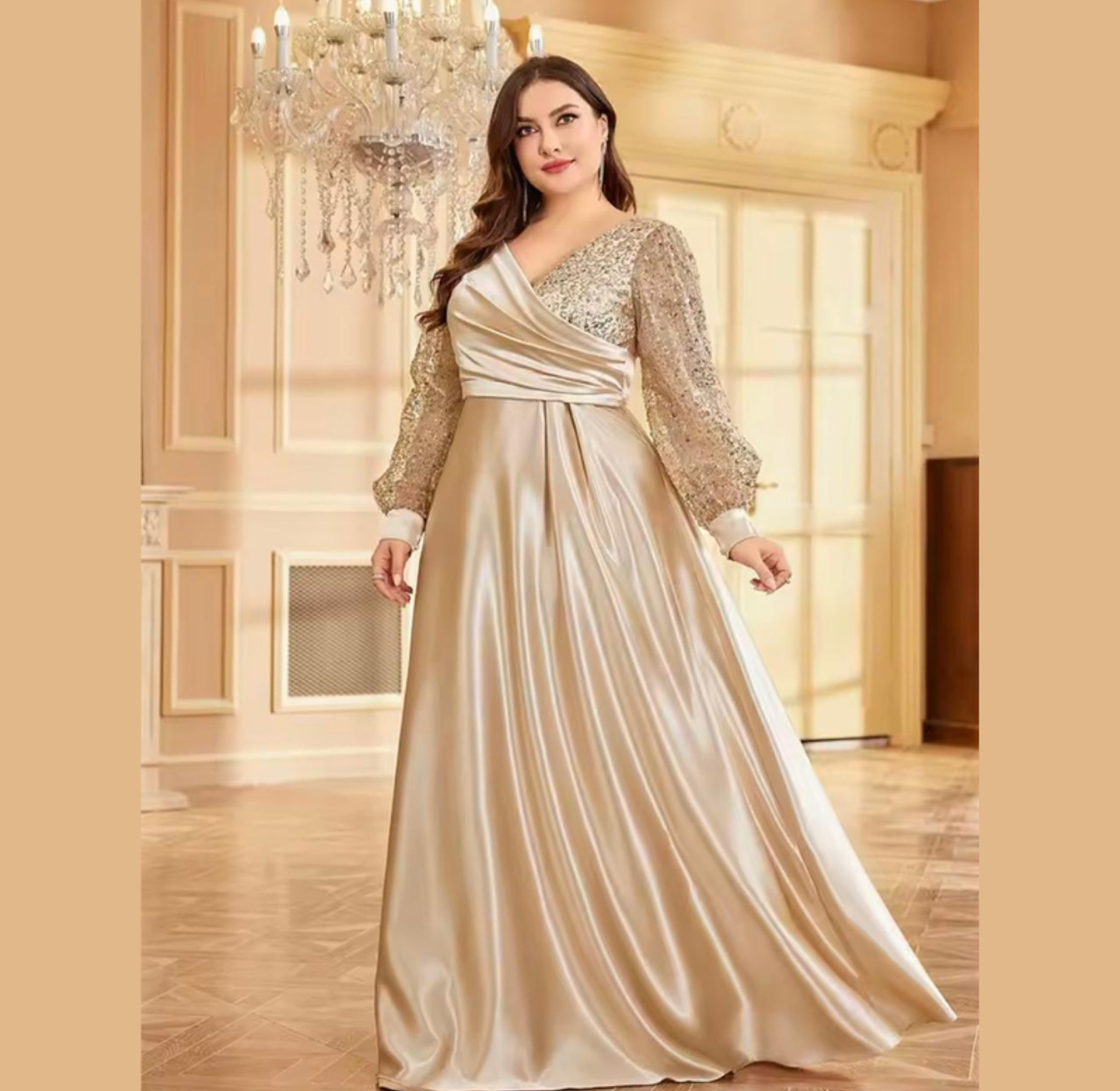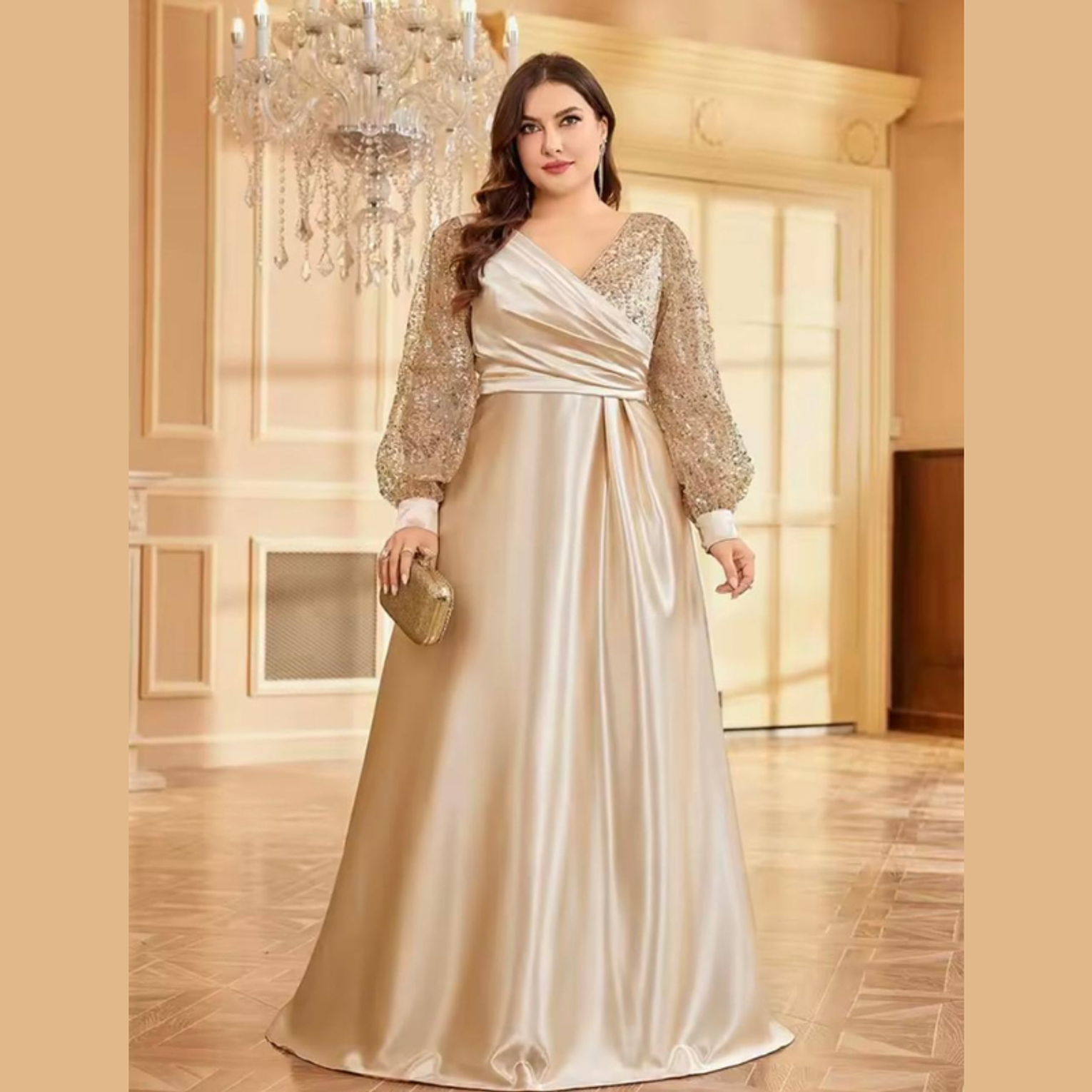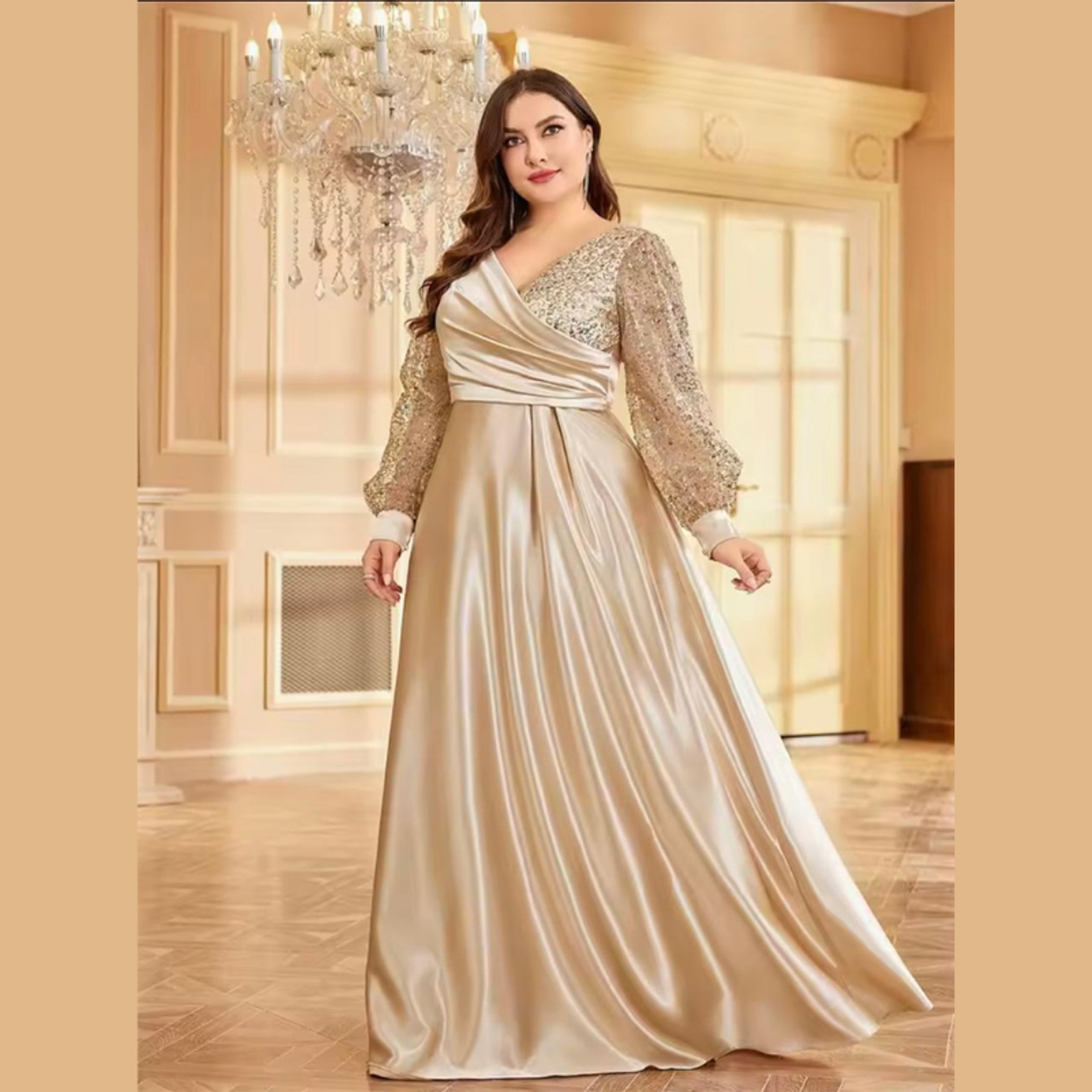 This opulent A-line gown features a sweeping, high-sheen satin skirt complemented by a crossover bodice and dazzling balloon sleeves fully covered in gold-toned sequins. It's a truly majestic dress, perfectly balancing smooth elegance with high-impact sparkle.