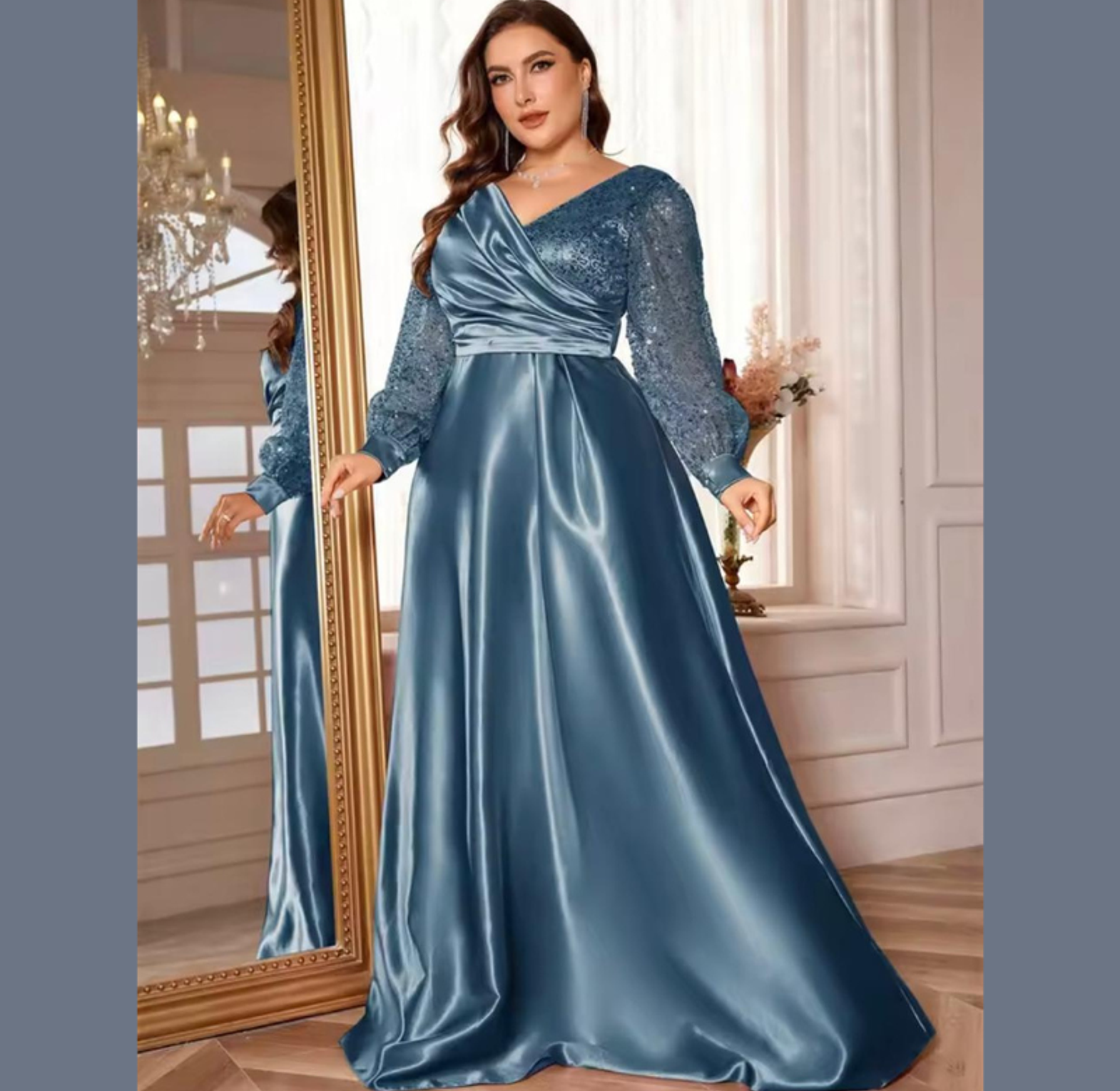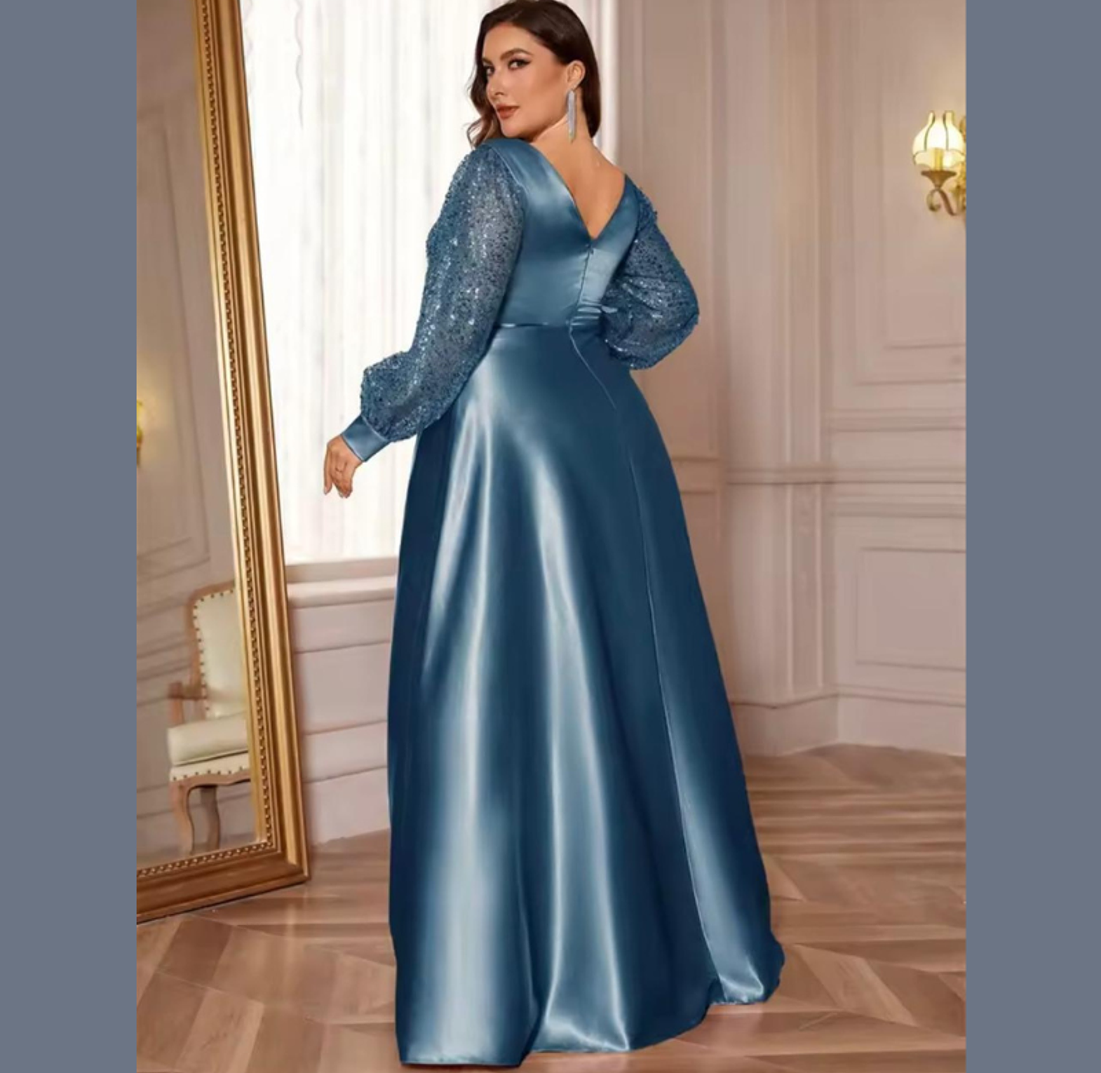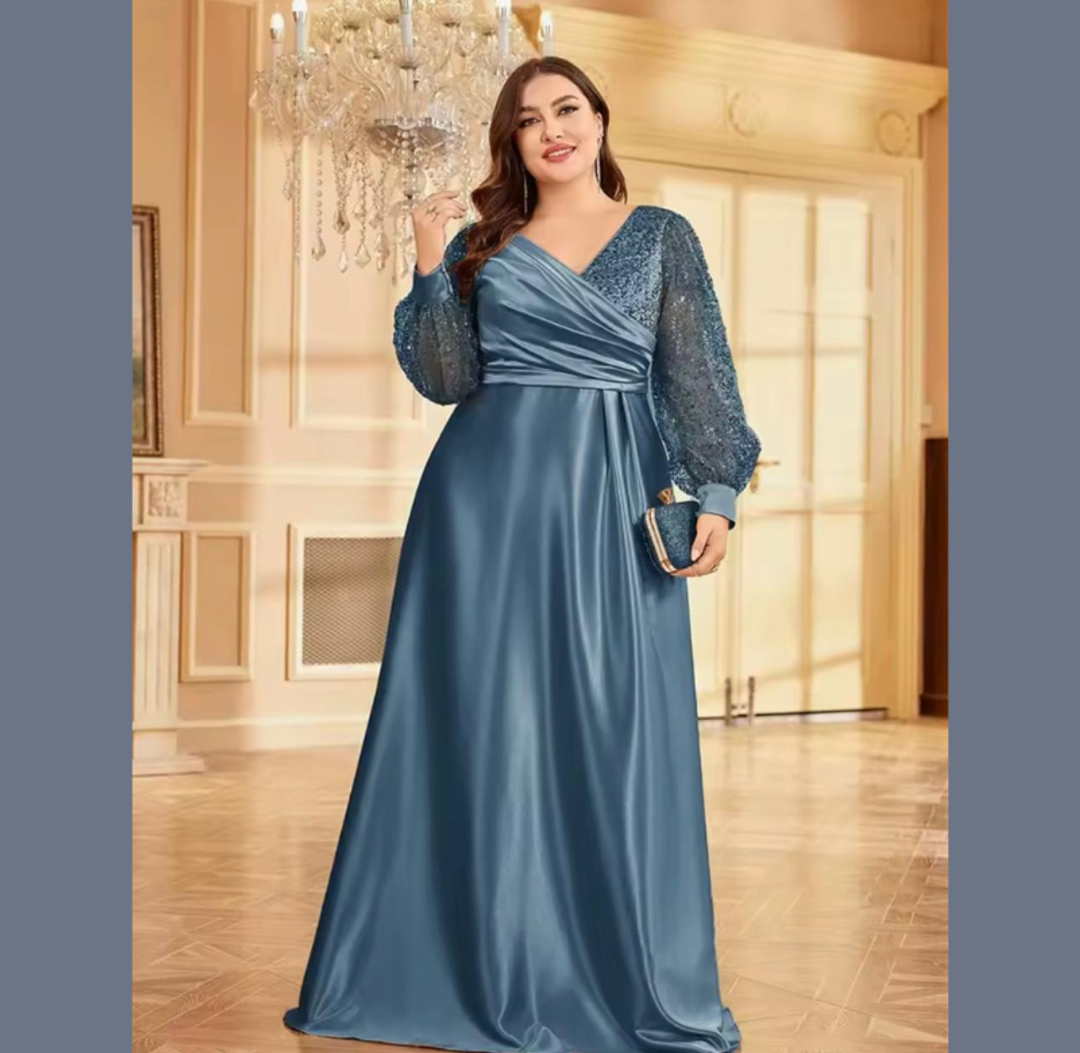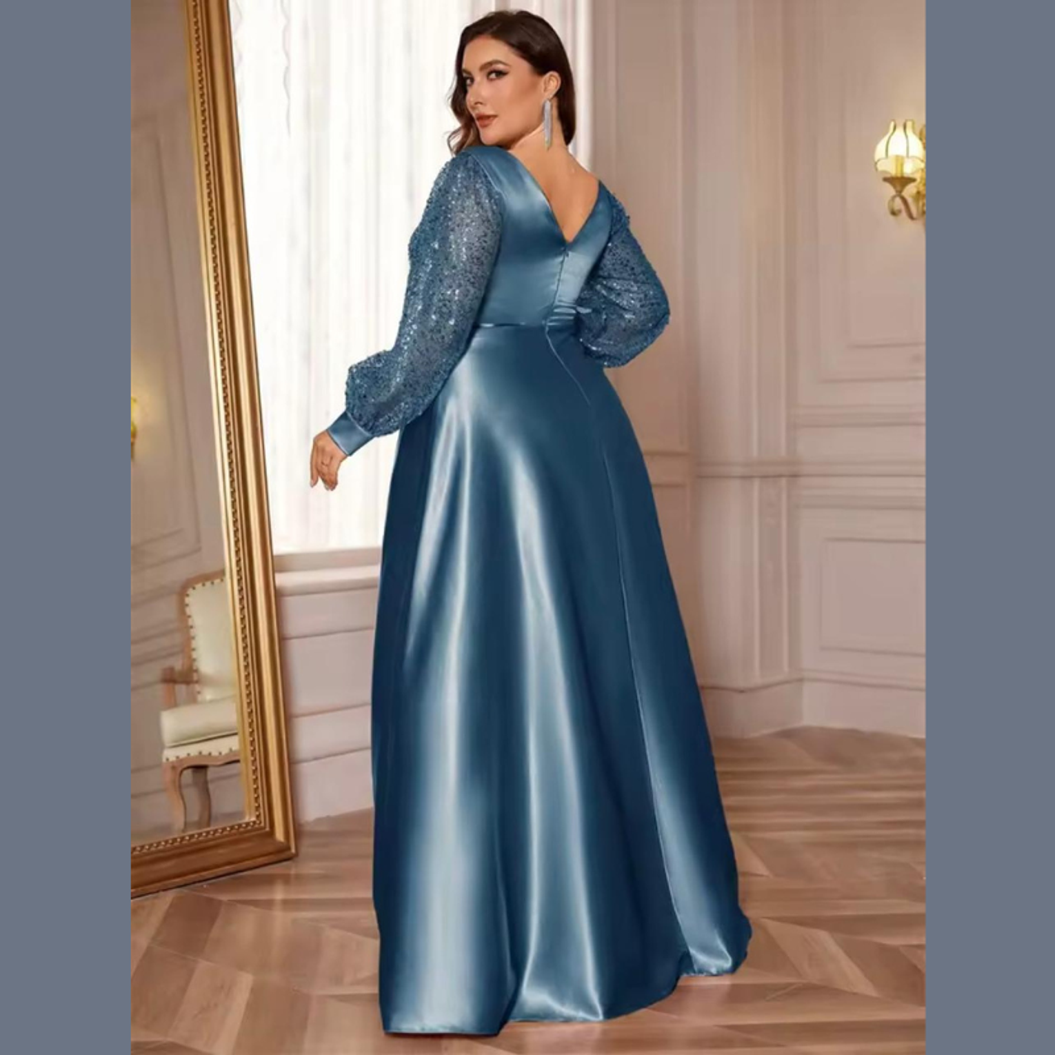 This opulent A-line gown features a sweeping, high-sheen satin skirt complemented by a crossover bodice and dazzling balloon sleeves fully covered in gold-toned sequins. It's a truly majestic dress, perfectly balancing smooth elegance with high-impact sparkle.