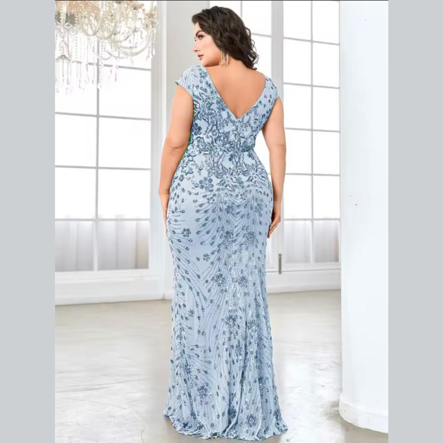 This luxurious plus-size gown features intricate, shimmering gold sequin embroidery set in an ornate vine pattern across a glamorous mermaid silhouette. The flattering V-neck and cap sleeves deliver a majestic, sophisticated look for any major formal occasion.