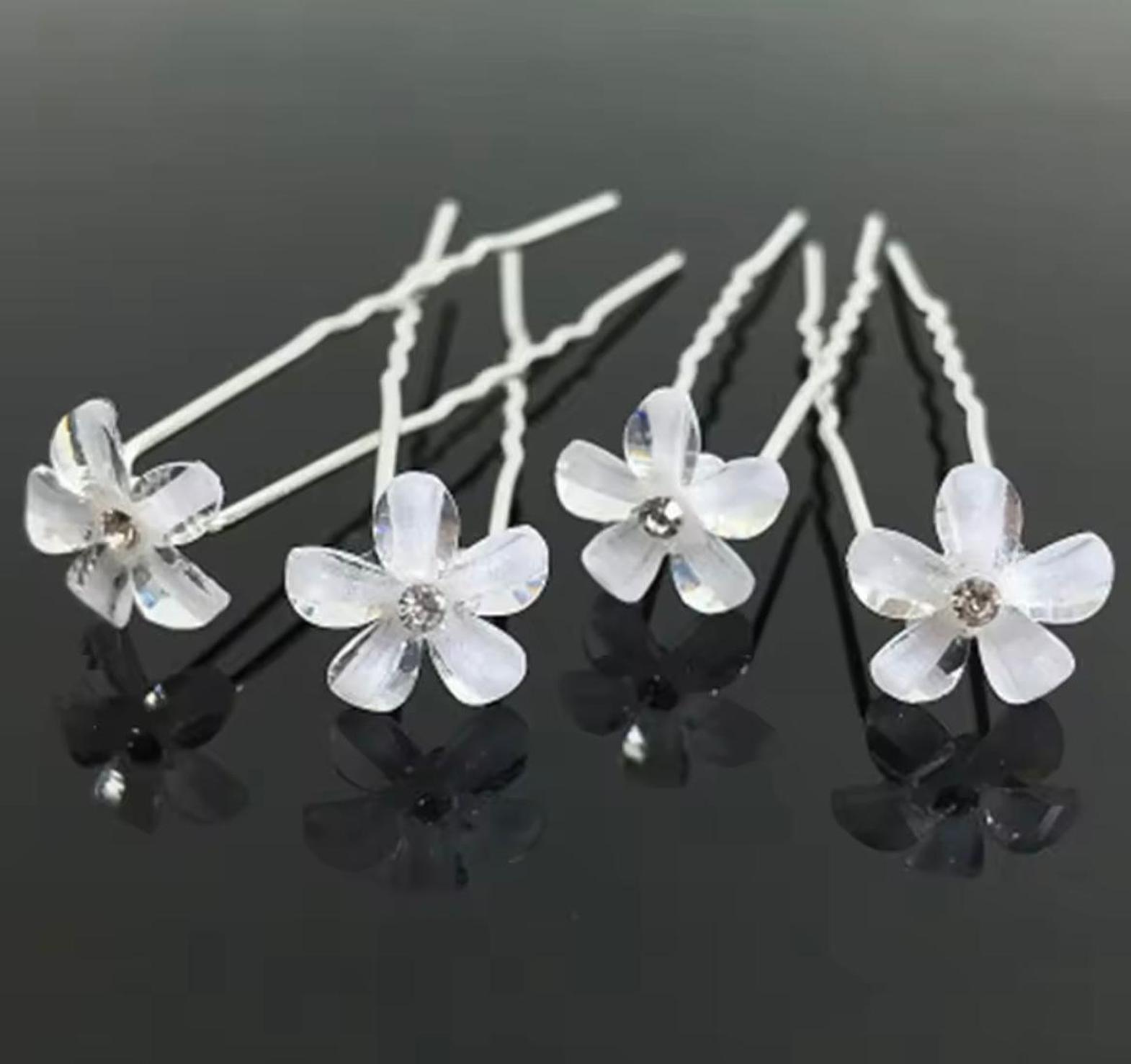 These striking hair pins showcase five finely faceted, clear acrylic petals centered with a dazzling accent crystal for maximum sparkle. The sophisticated, icy design makes them a subtle yet captivating addition to formal updos. 2 pins for 100