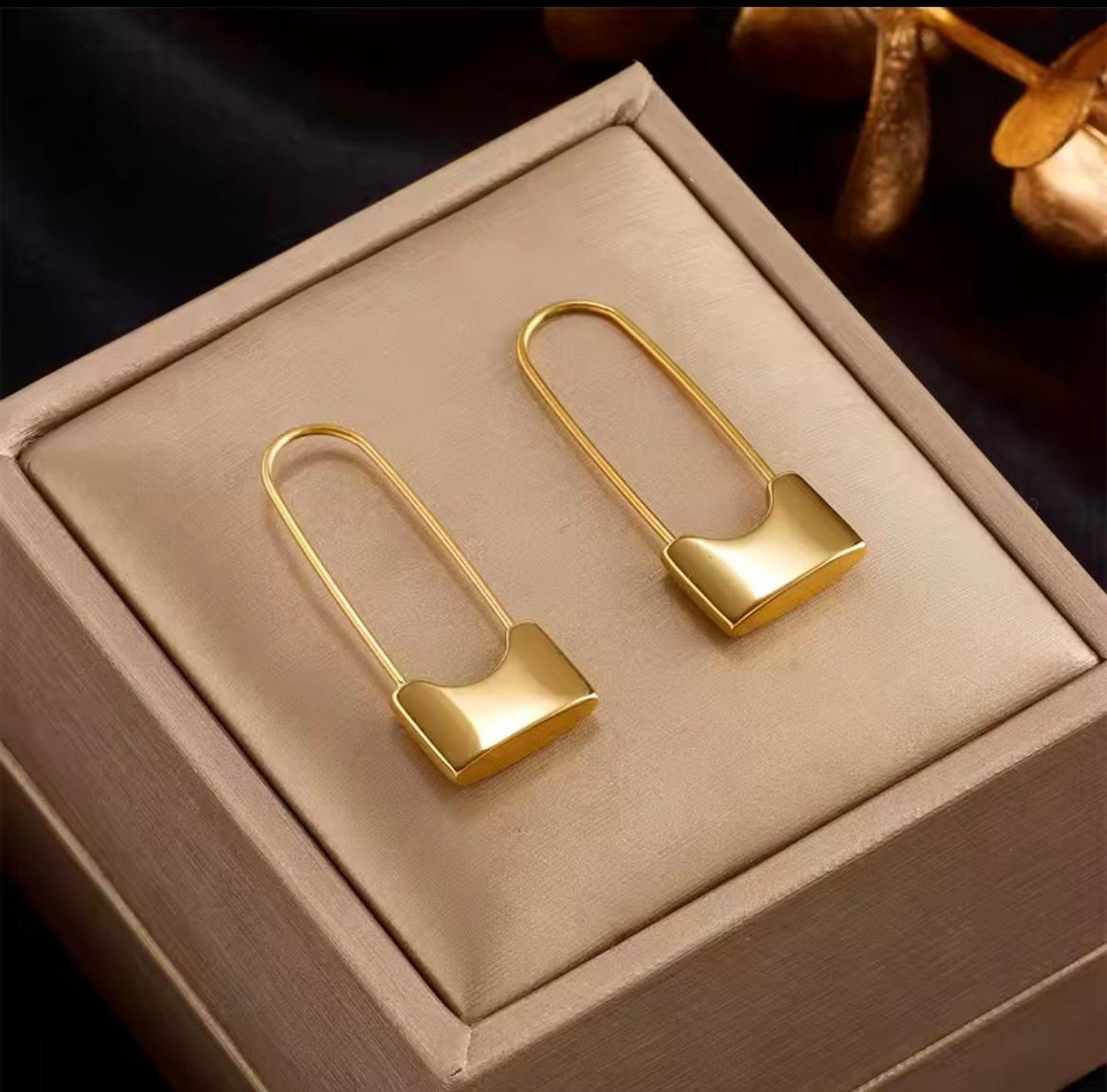 Make a bold, modern statement with these avant-garde gold-plated earrings, featuring a sleek safety-pin silhouette with a polished lock-charm base. This edgy yet sophisticated design offers a unique twist on contemporary streetwear fashion.