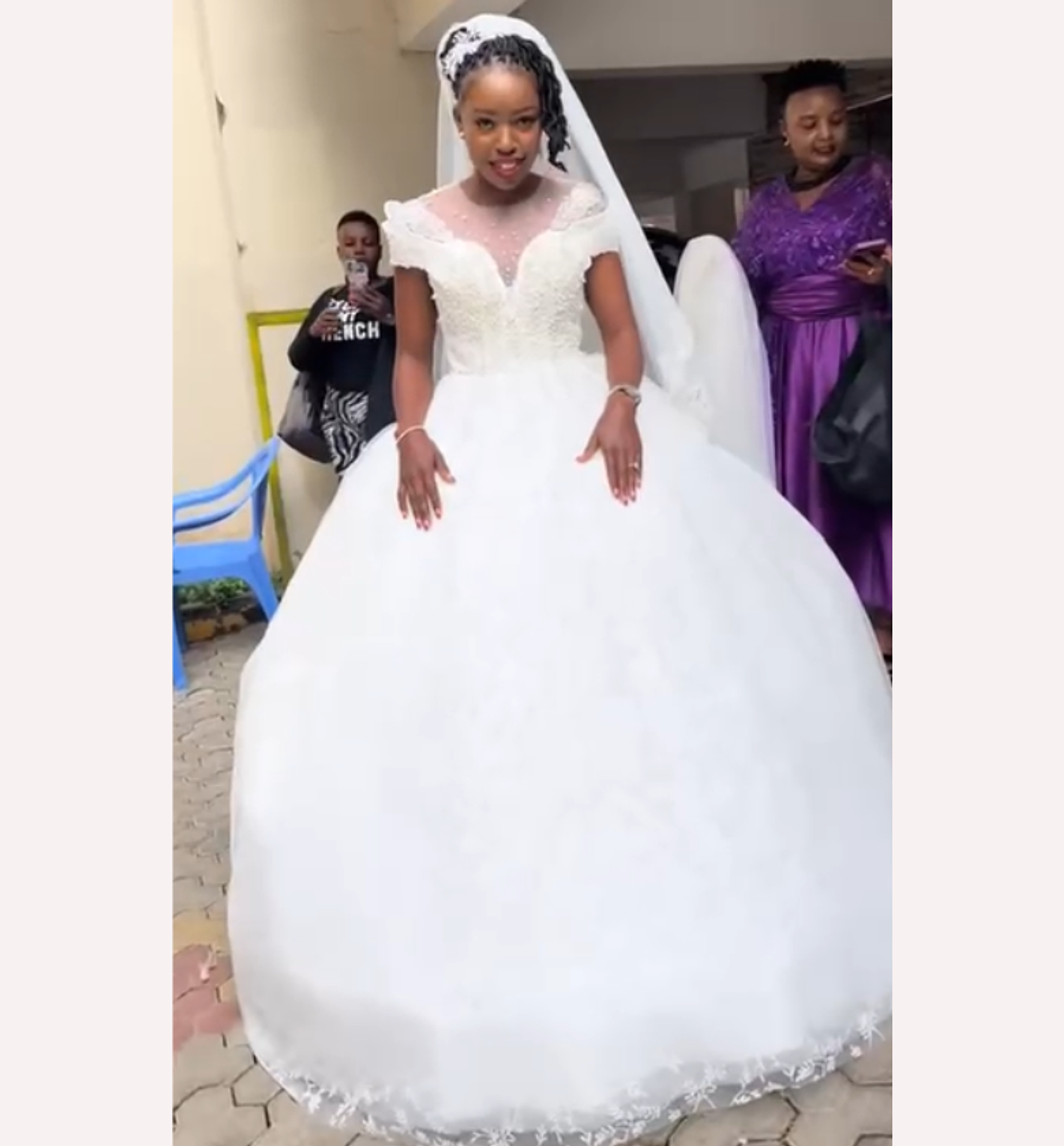 Prepare for a fairy-tale moment in this spectacular, ultra-voluminous white ball gown, featuring a delicate off-shoulder illusion neckline and a skirt made of thousands of dreamy tulle layers. This dress guarantees a breathtaking, celebrity-level entrance on your special day.