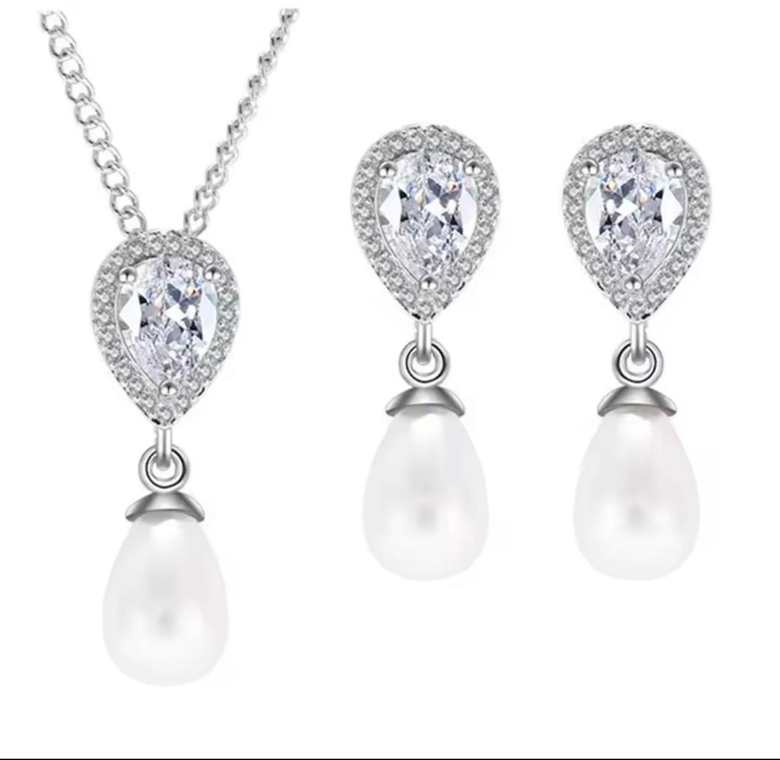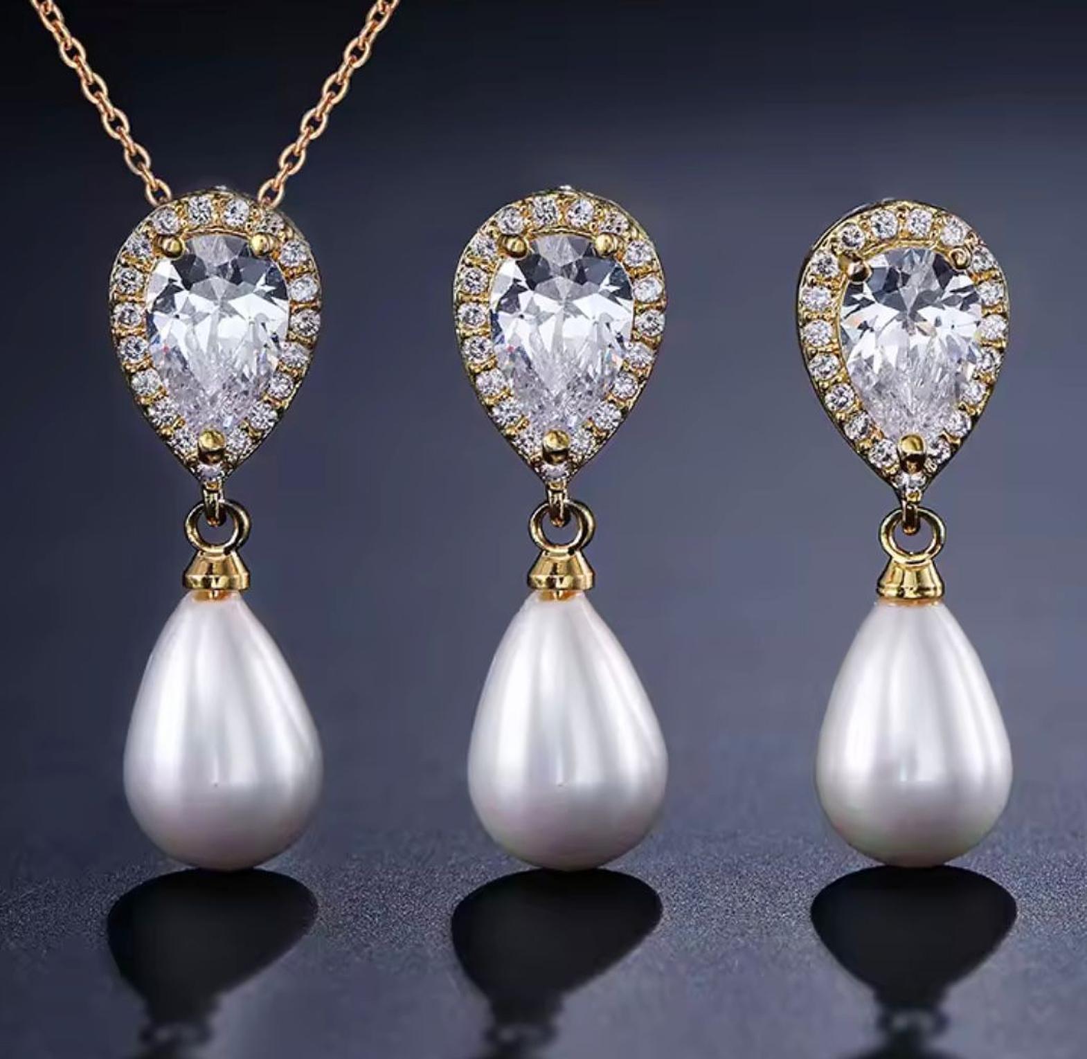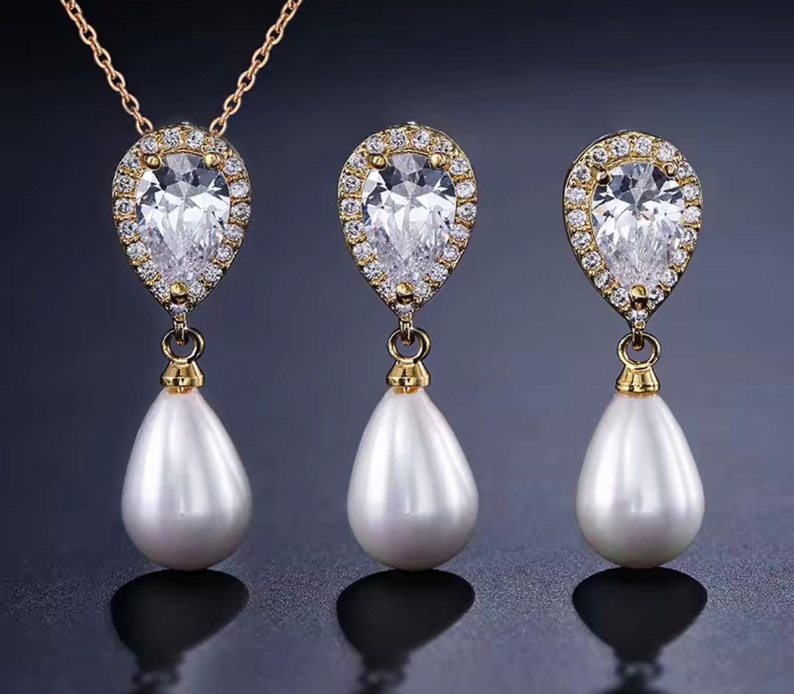 This magnificent set features a pear-cut brilliant stone surrounded by a sparkling pavé halo, from which a teardrop simulated pearl gracefully hangs. Available in both classic white and warm gold metal finishes, it offers a luxurious blend of sparkle and luster.