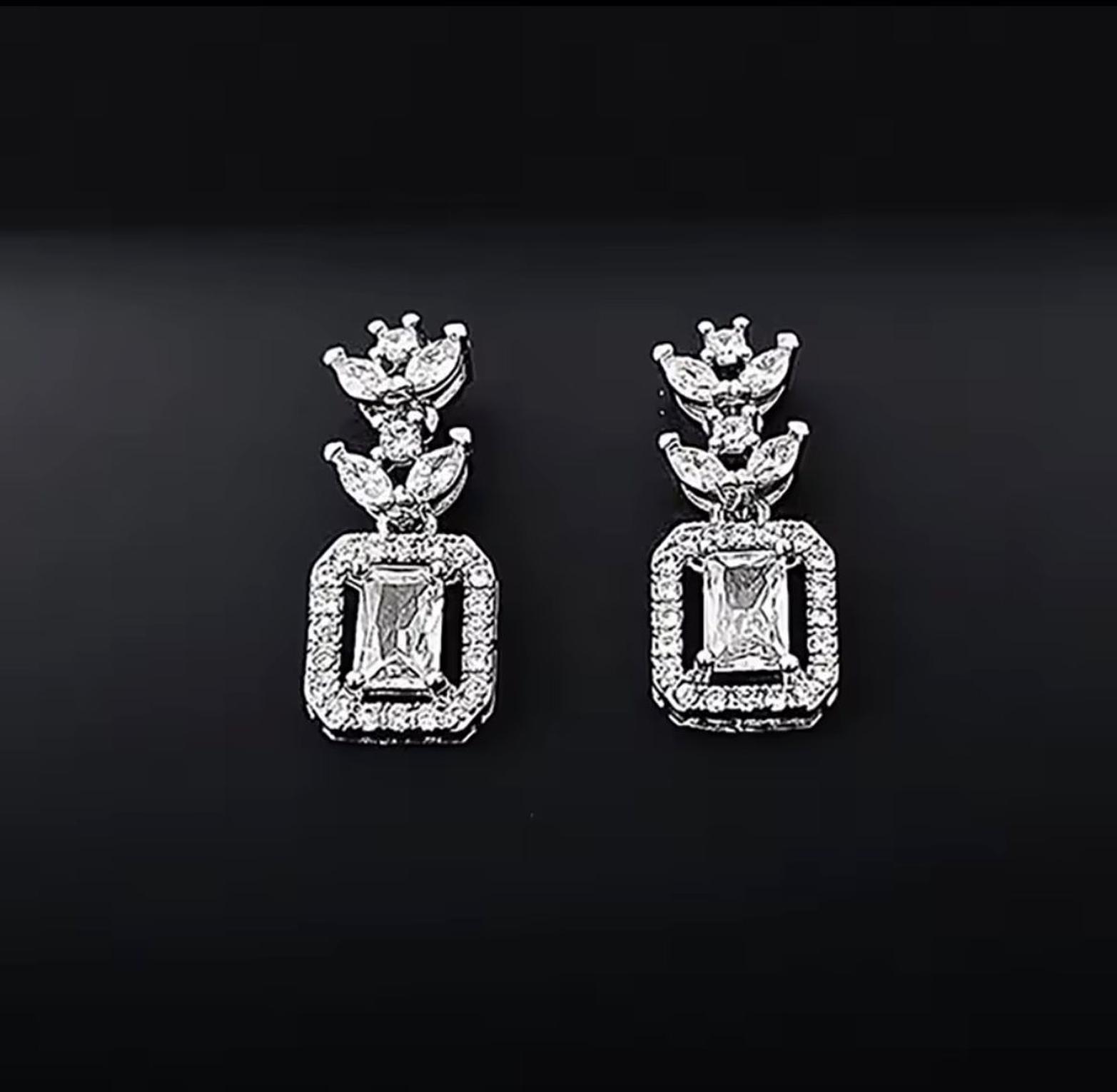 These exquisite drop earrings feature a central emerald-cut stone surrounded by a pave halo, suspended below a brilliant cluster of marquise and round accents. The structured, silver-plated design delivers a refined, vintage-inspired sparkle.