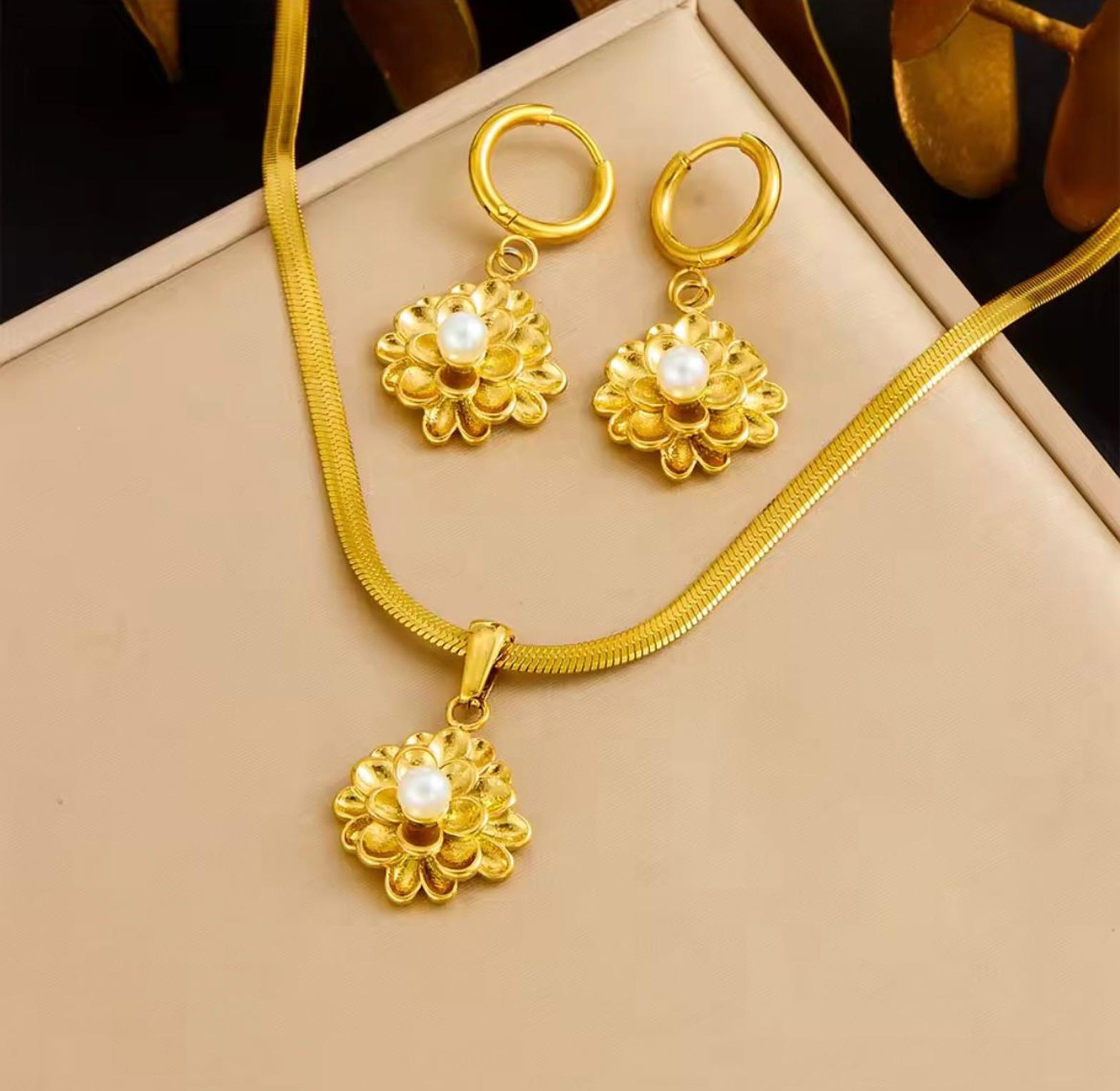 Embrace a look of sun-drenched luxury with this masterfully crafted jewelry ensemble, designed to celebrate classic botanical beauty. The set includes a striking pendant and matching hoop-style drop earrings, each showcasing a meticulously detailed, multi-tiered flower crafted from vibrant gold-plated petals. At the heart of each golden blossom sits a luminous, high-shine pearl, providing a soft, iridescent contrast to the rich, reflective metallic finish. The pendant is suspended from a sleek, flat snake chain that rests comfortably against the skin, ensuring the floral centerpiece remains the focal point of your attire.