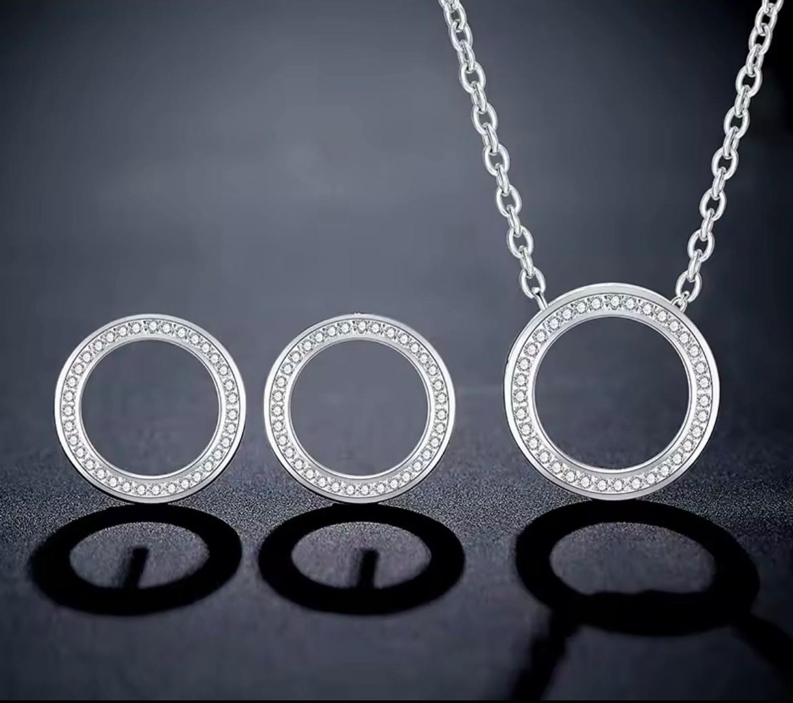 This modern and elegant jewelry set features perfectly symmetrical open circles bordered with brilliant micro-pavé stones for continuous sparkle. The coordinated look is available in both a luminous gold finish and a sleek, contemporary silver variant.