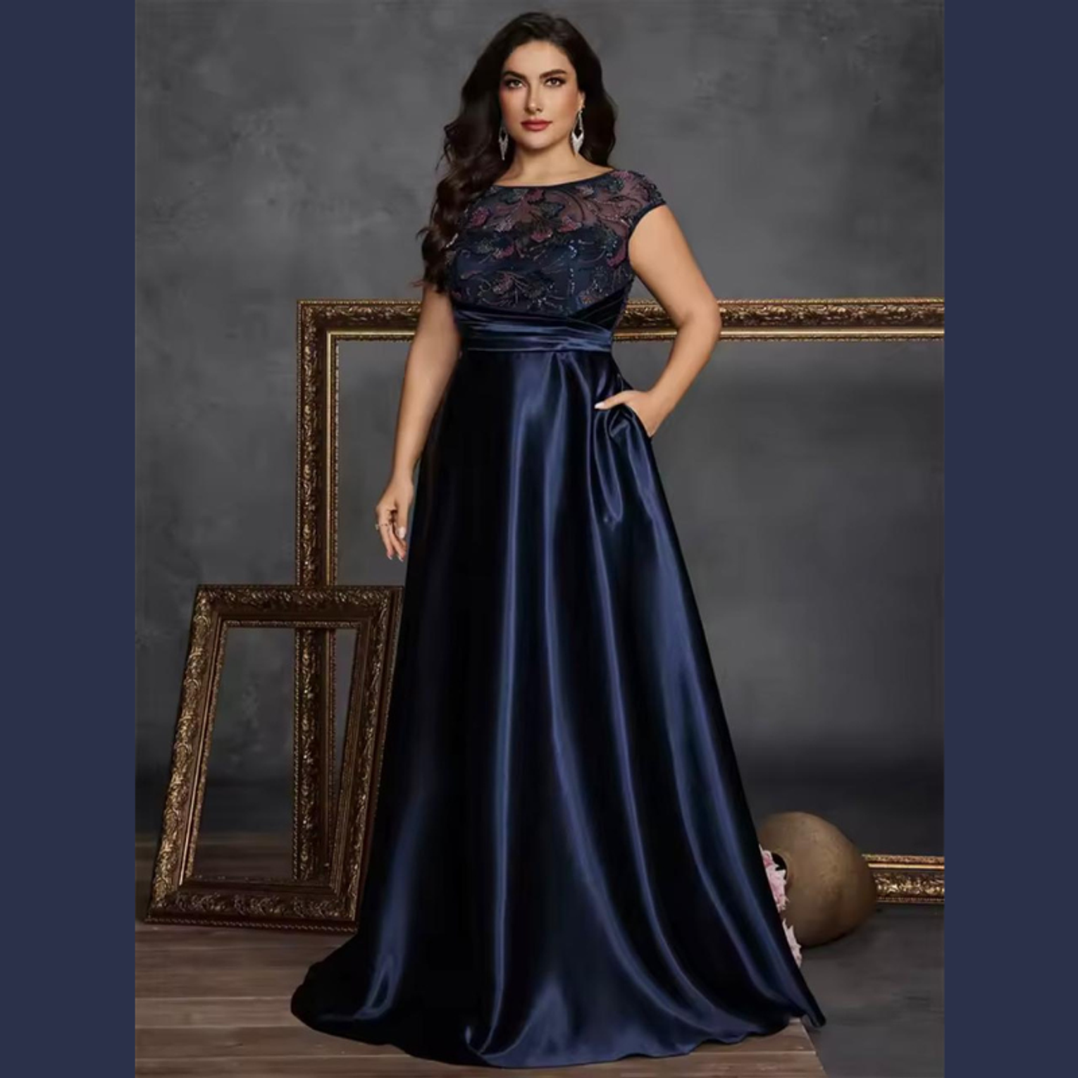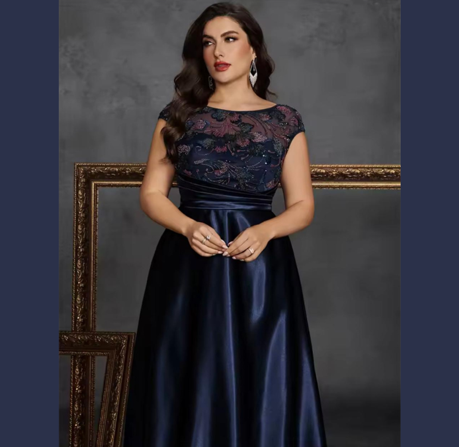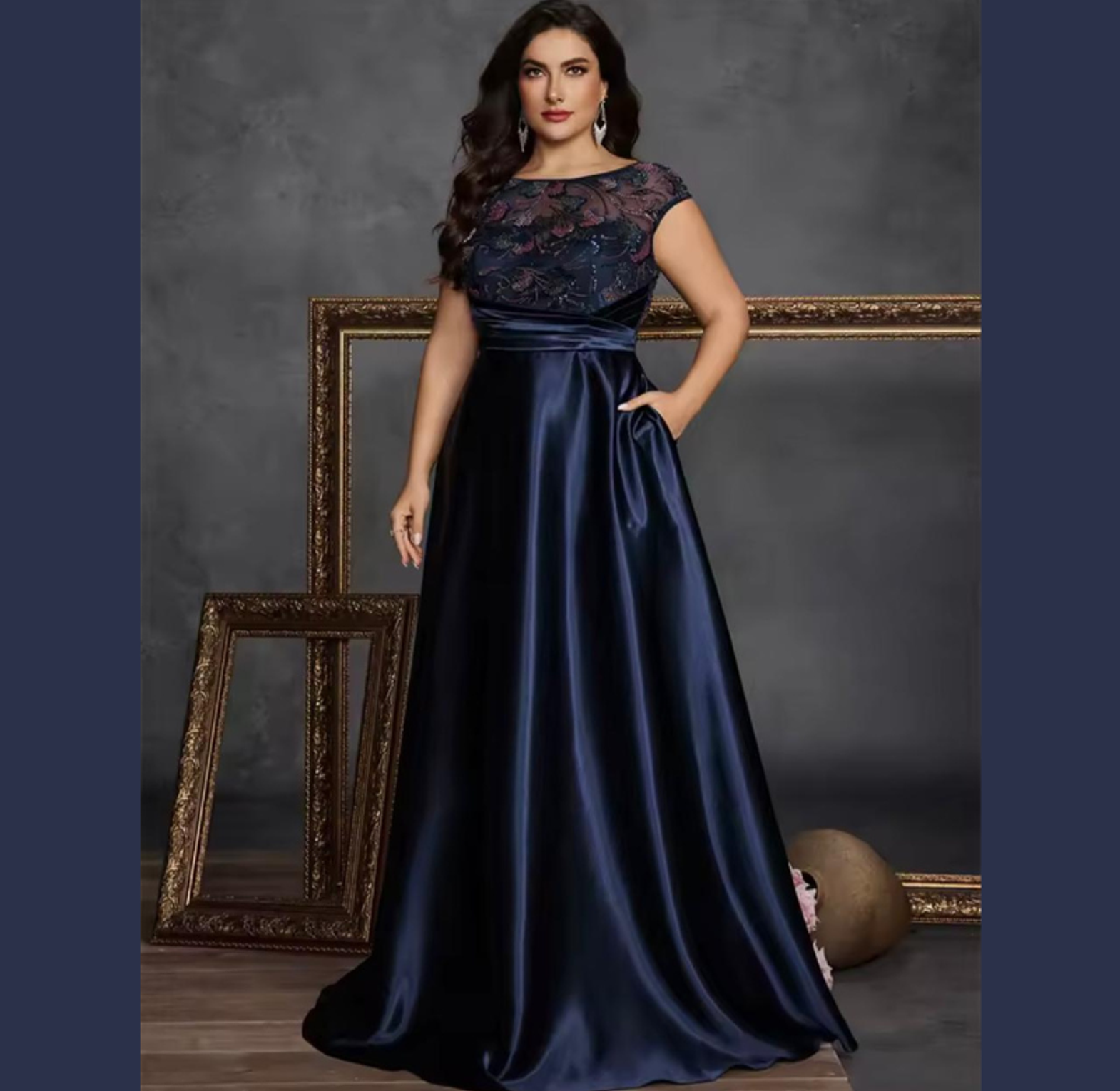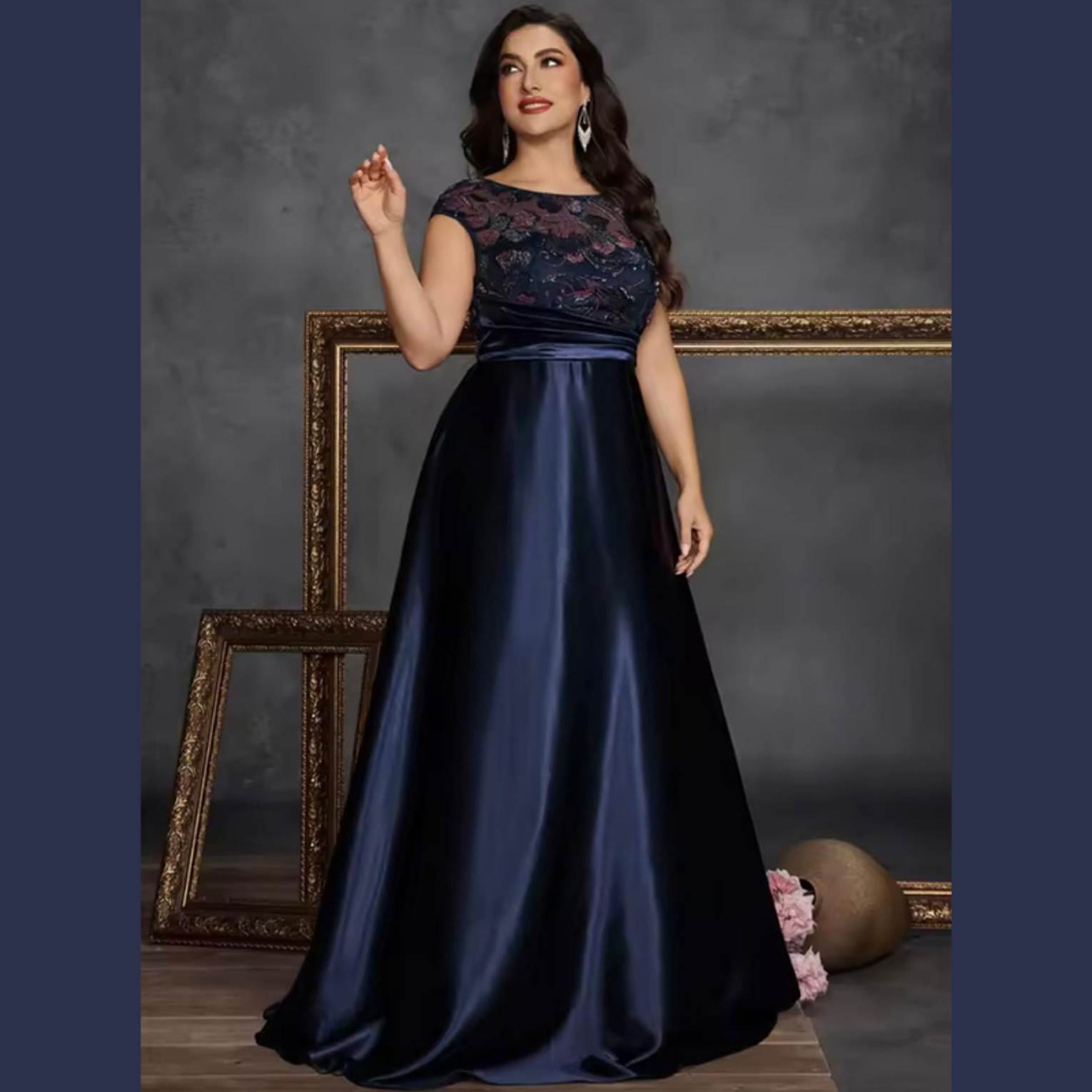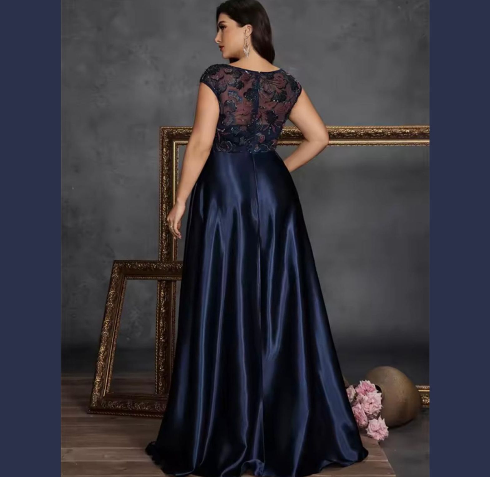 This elegant 2XL gown features a structured, glossy satin skirt beautifully contrasted with a refined mesh bodice and delicate floral embroidery. The sophisticated navy color and mixed textures create a timeless, regal look perfect for any grand occasion.