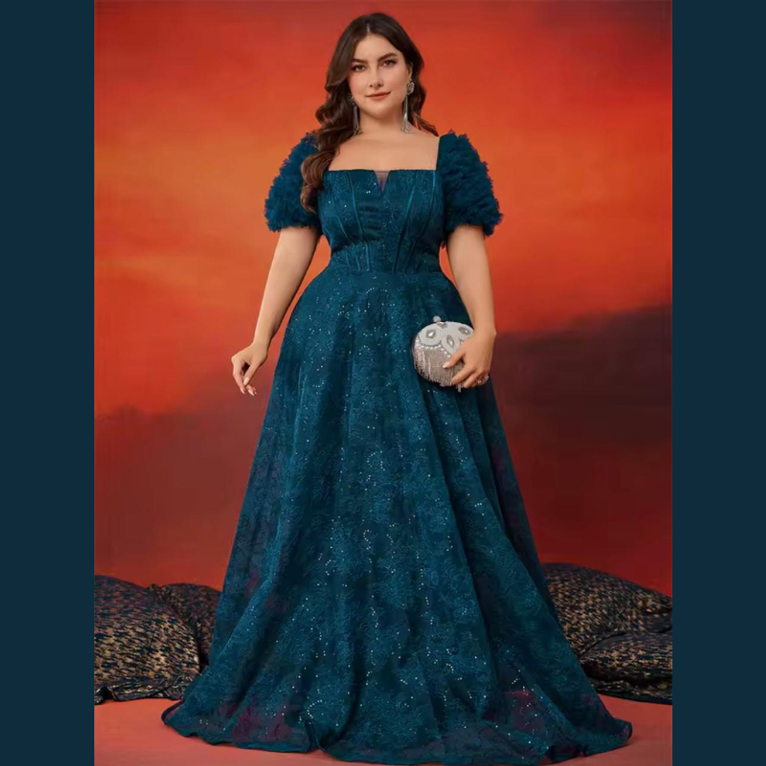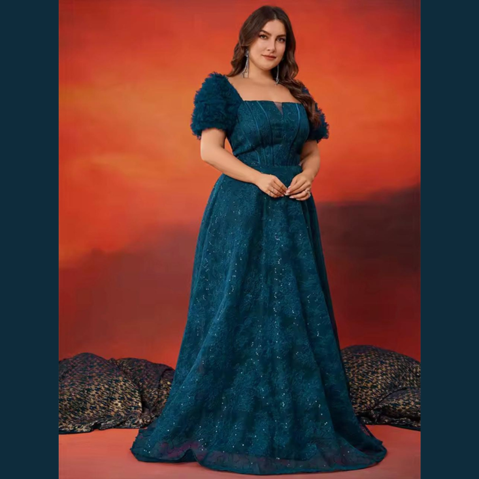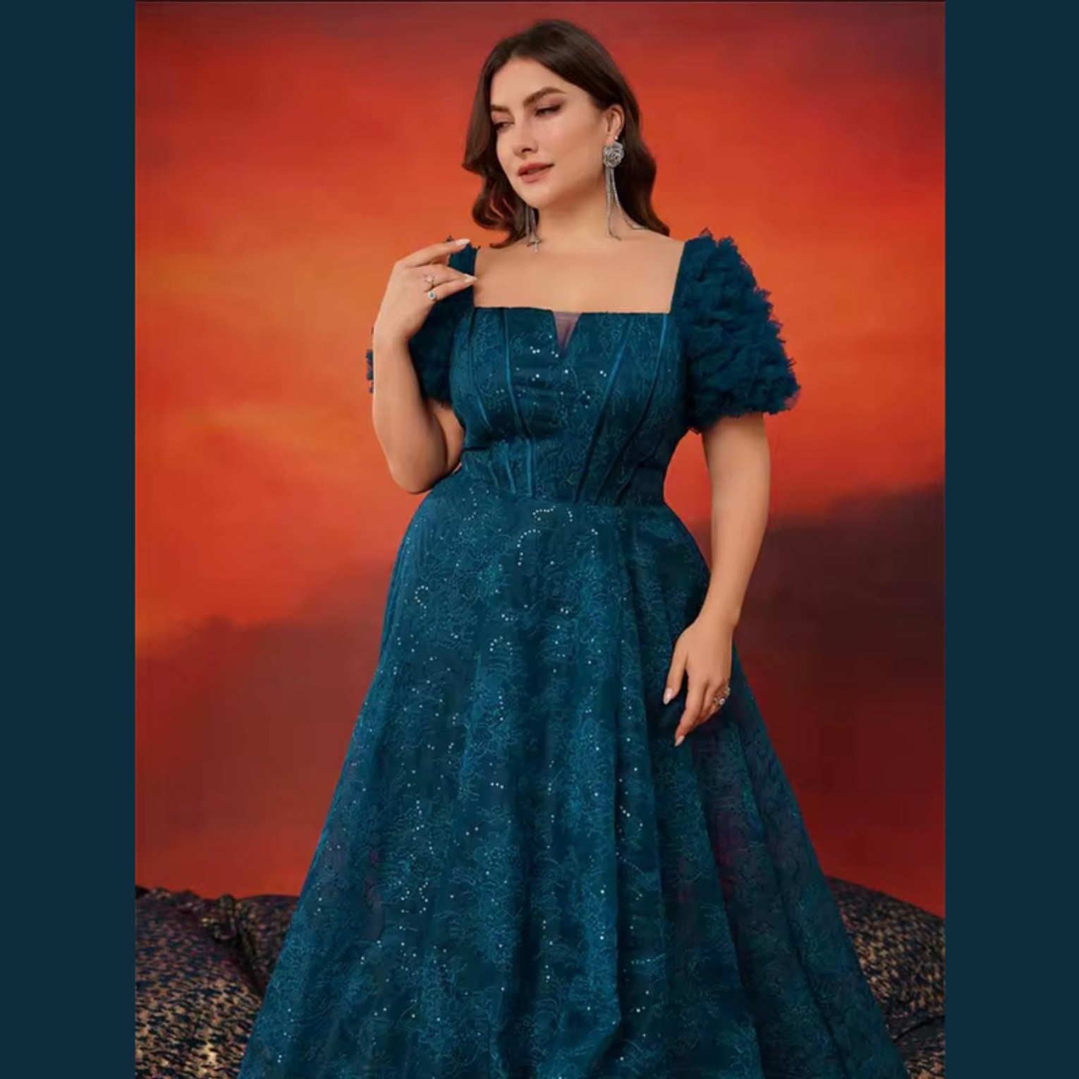 This magnificent navy blue A-line gown features a striking, full satin skirt complemented by a delicate mesh bodice adorned with intricate, tonal embroidery. The combination of rich color and contrasting textures creates a sophisticated and timelessly regal evening look.