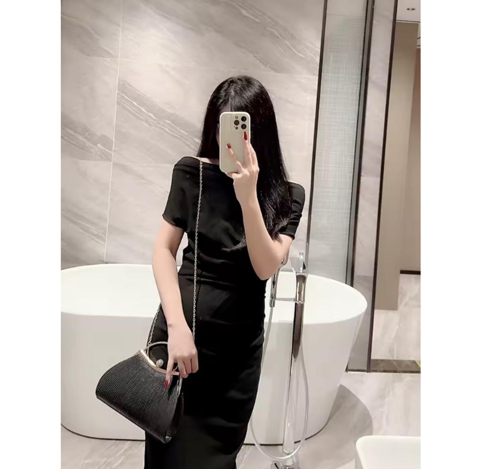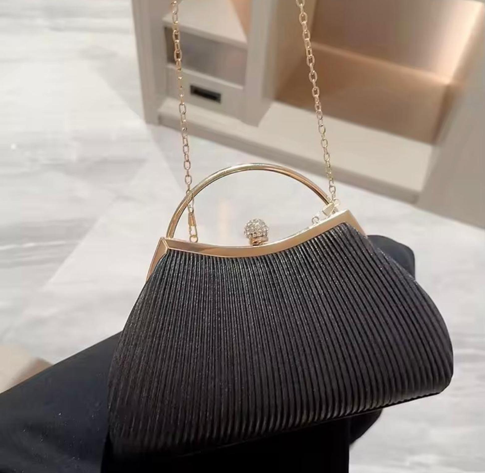 This chic, compact black clutch features an elegant pleated exterior, a curved gold-toned frame, and a dazzling crystal-studded clasp. It's the perfect accessory for adding a refined, sophisticated finish to any formal evening ensemble.