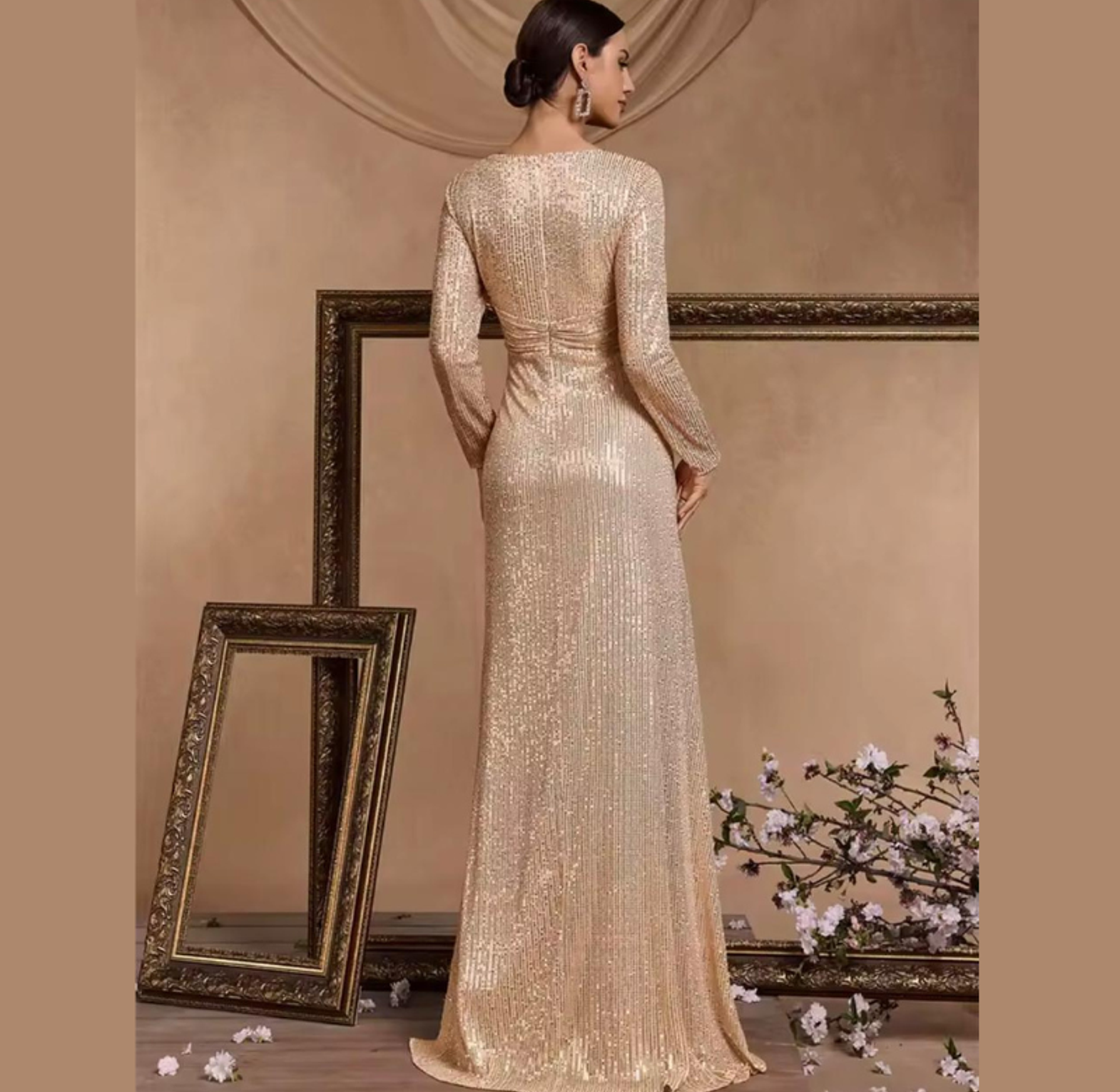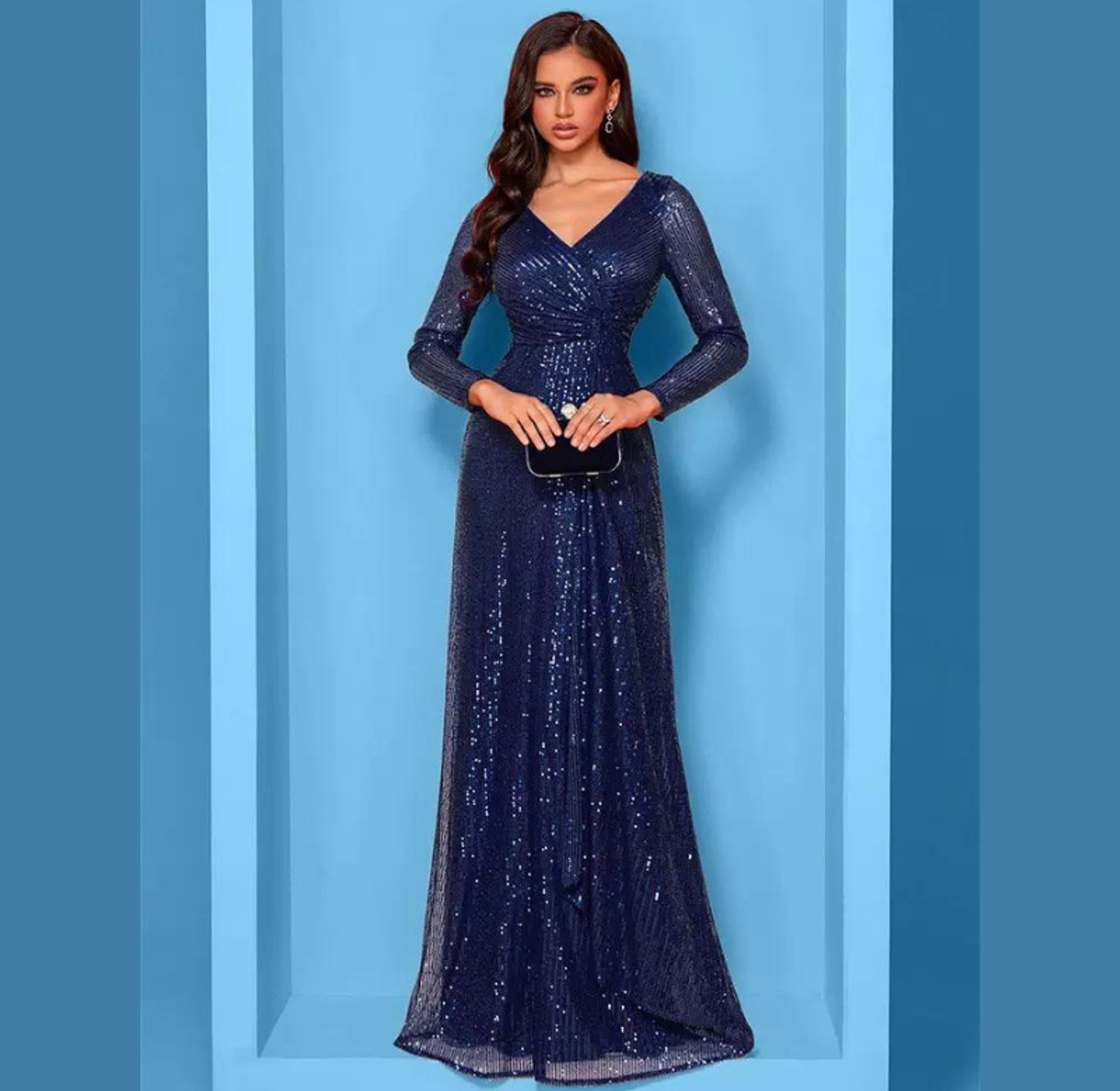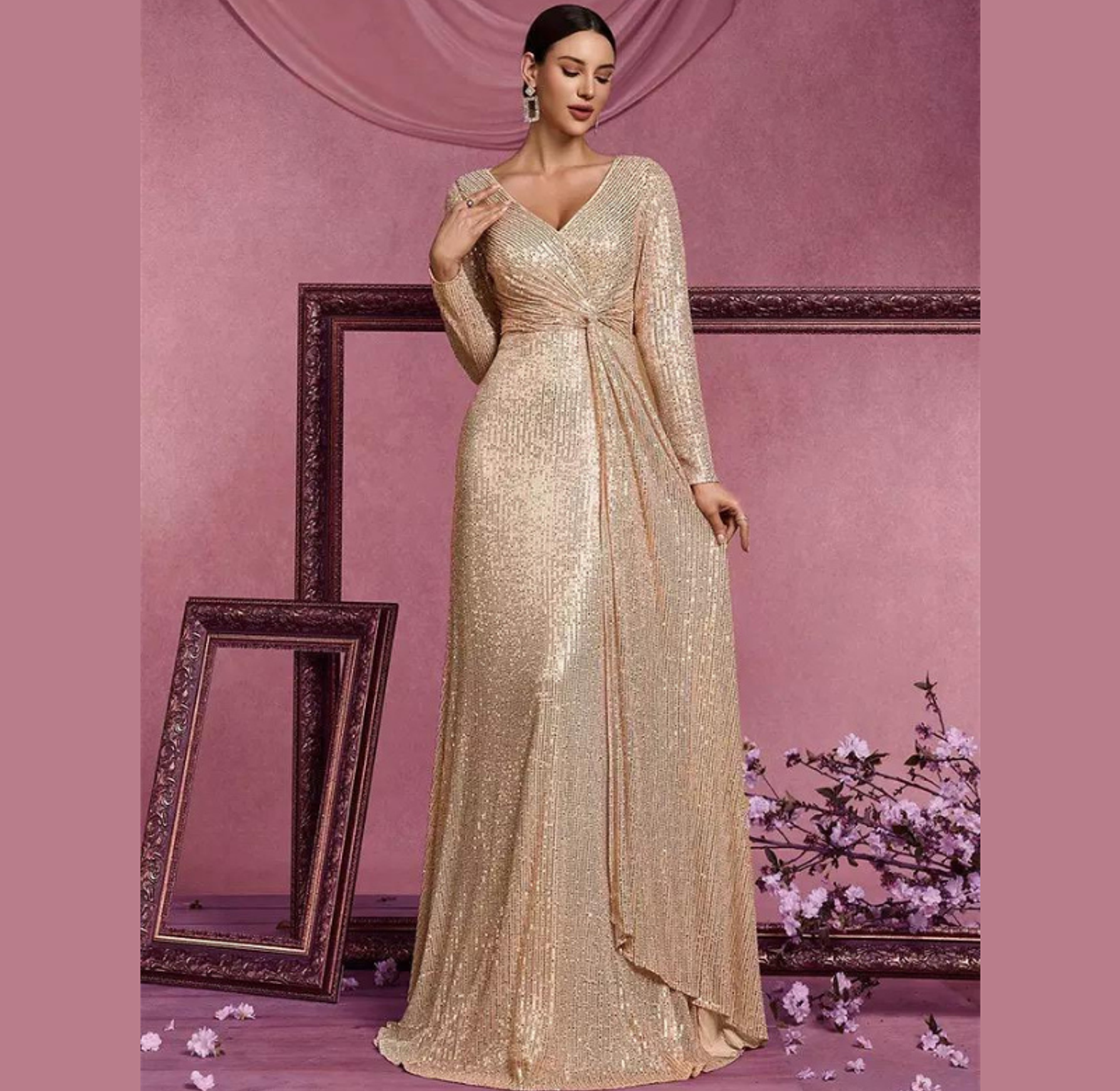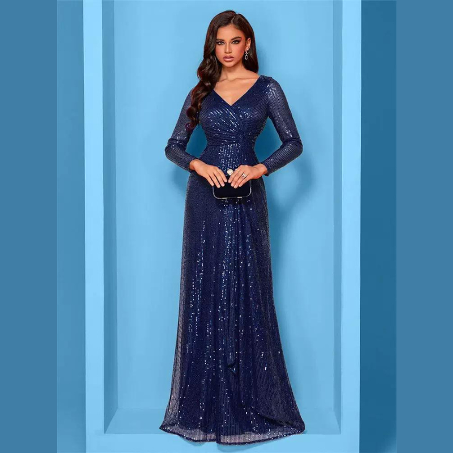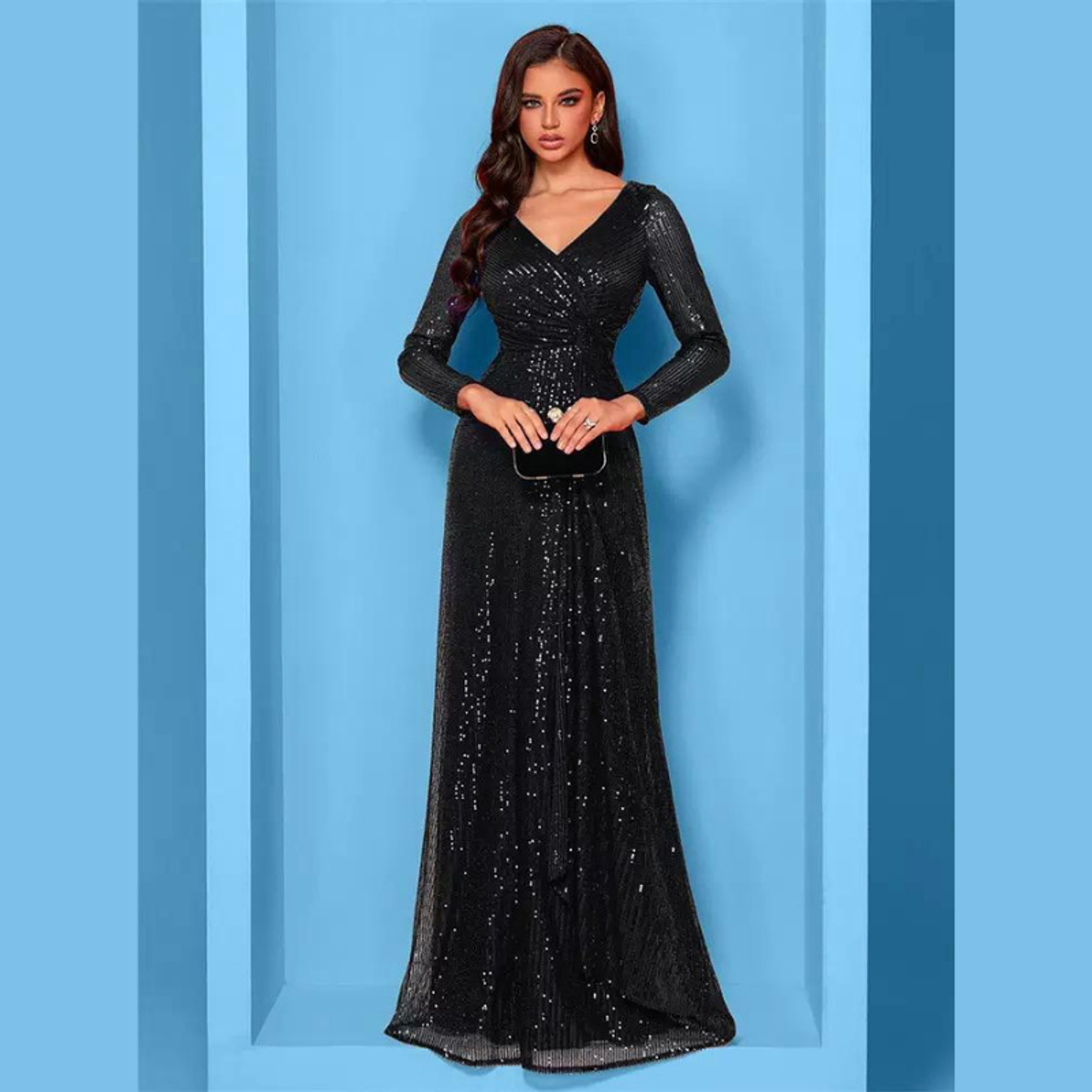 This dazzling maxi dress is entirely covered in radiant sequins, featuring a sophisticated deep V-neck and flattering long sleeves for a sleek silhouette. It's the ultimate choice for injecting high-voltage glamour and sparkle into any evening event.
