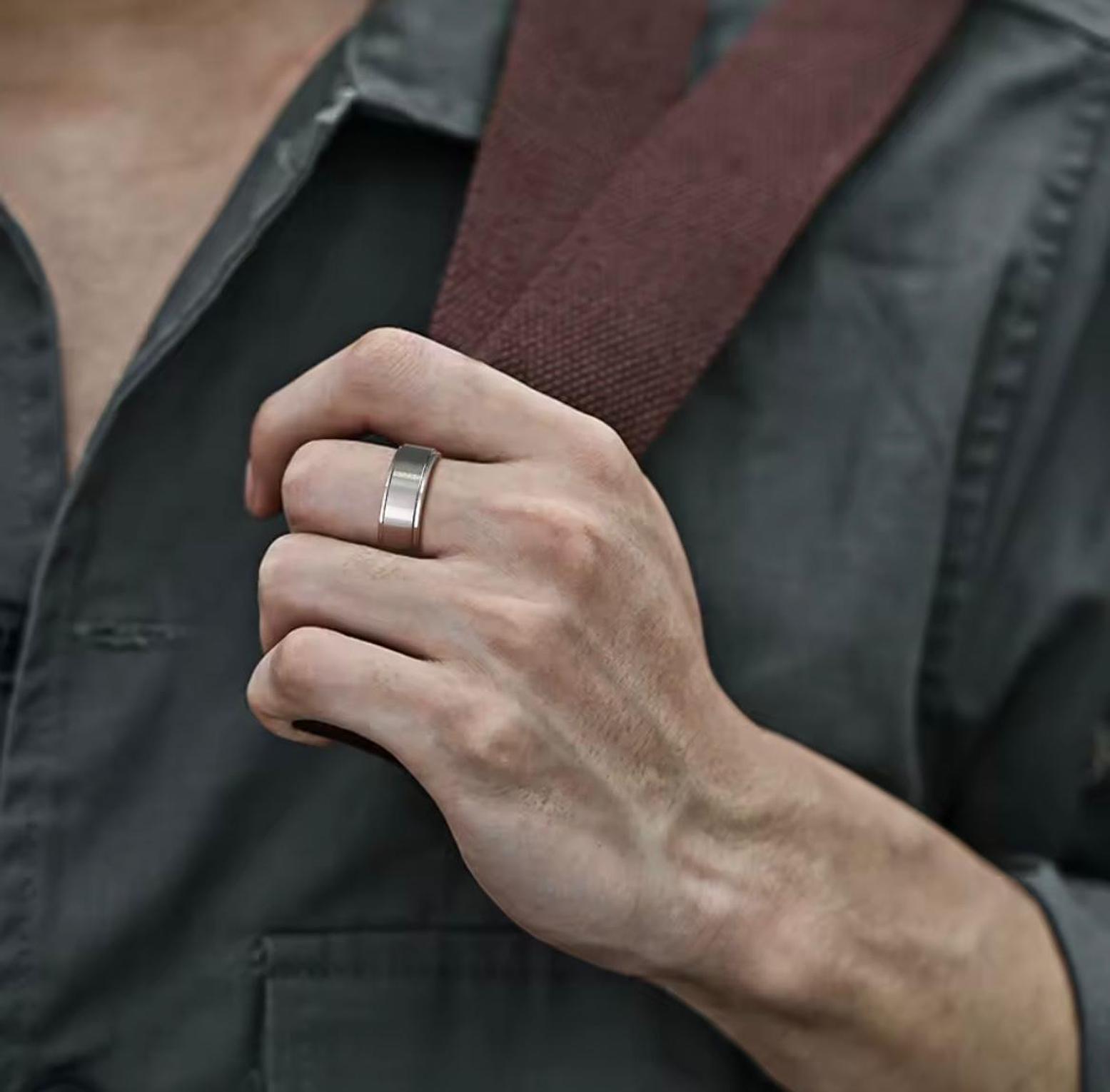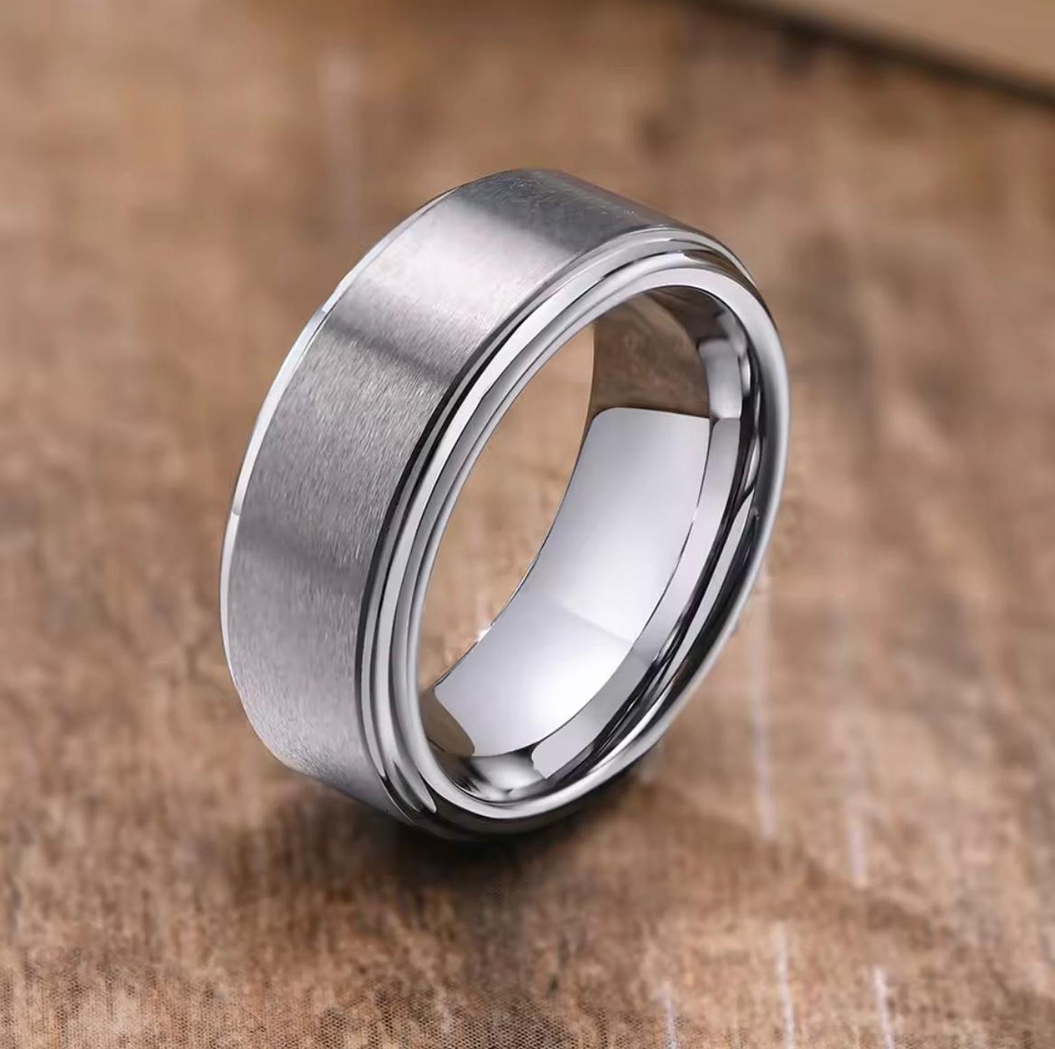 Durable 8mm Tungsten Carbide men's ring with a matte finish center and polished beveled edges. Available in sleek Silver or bold Black.