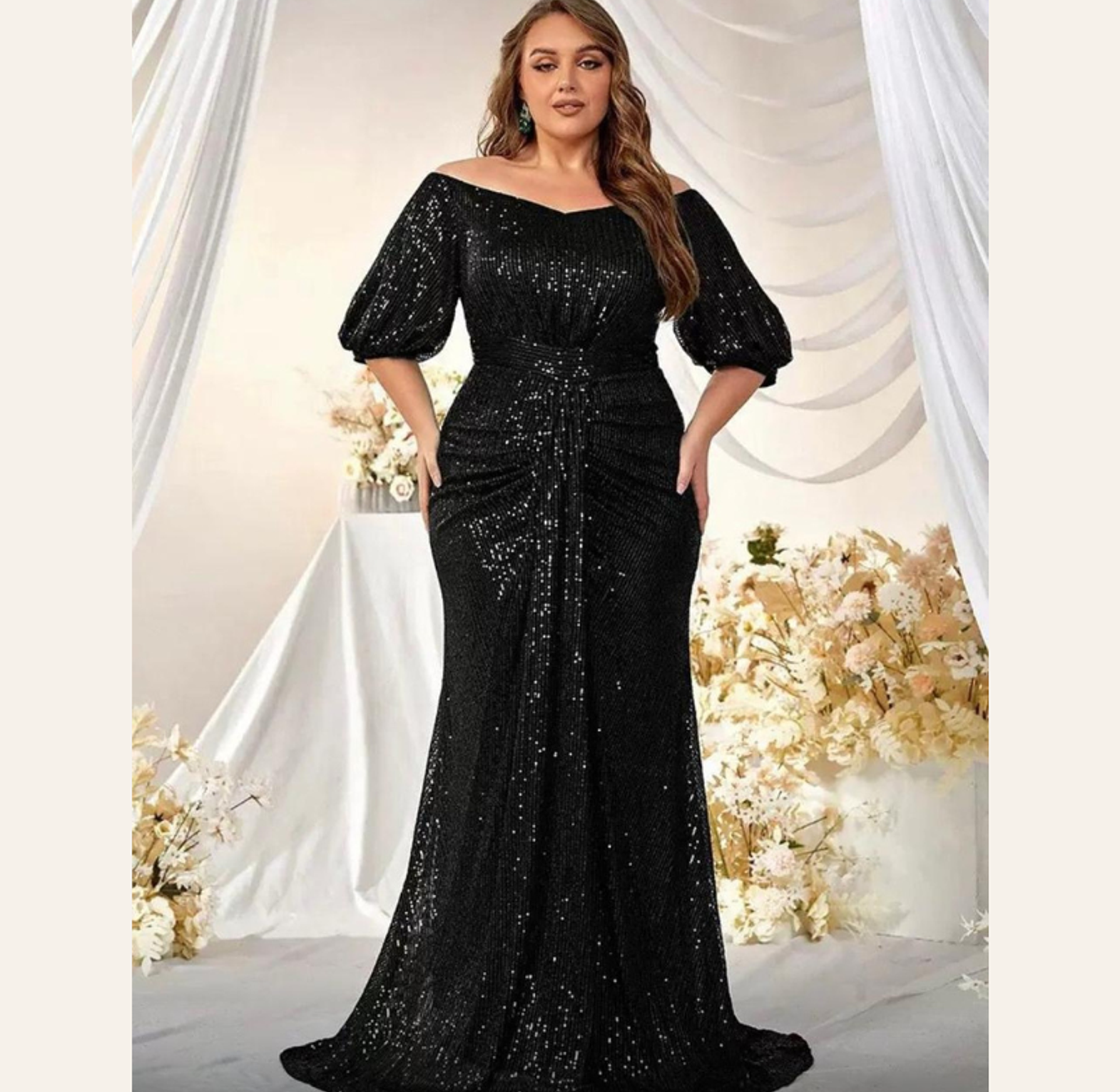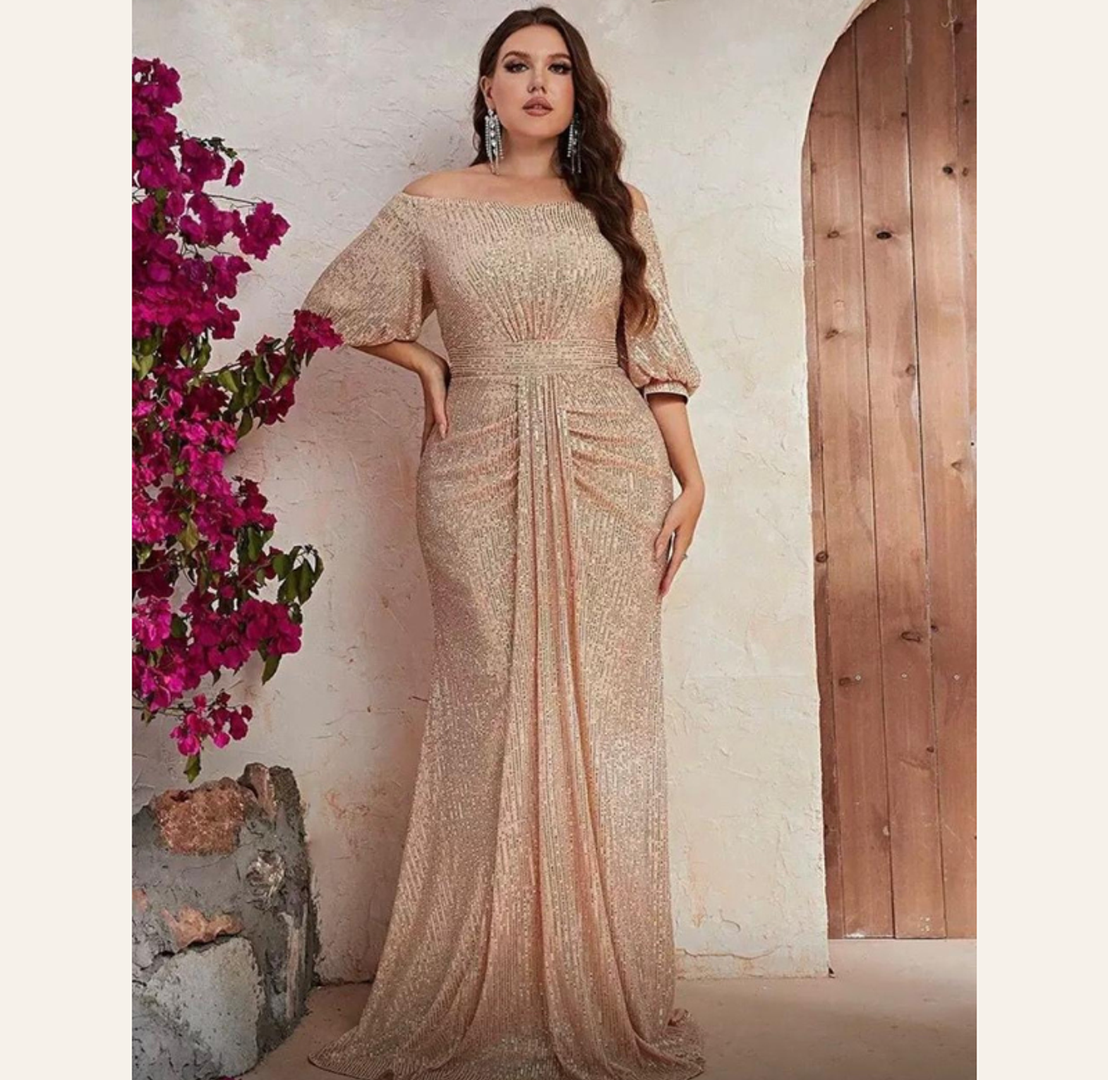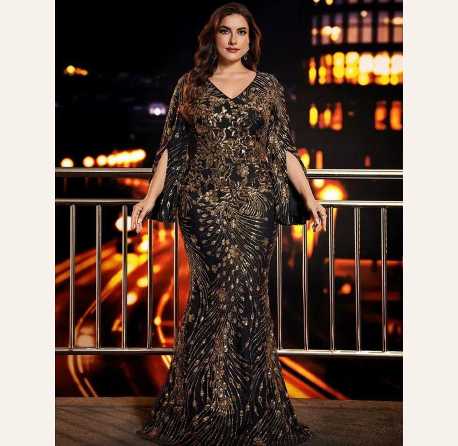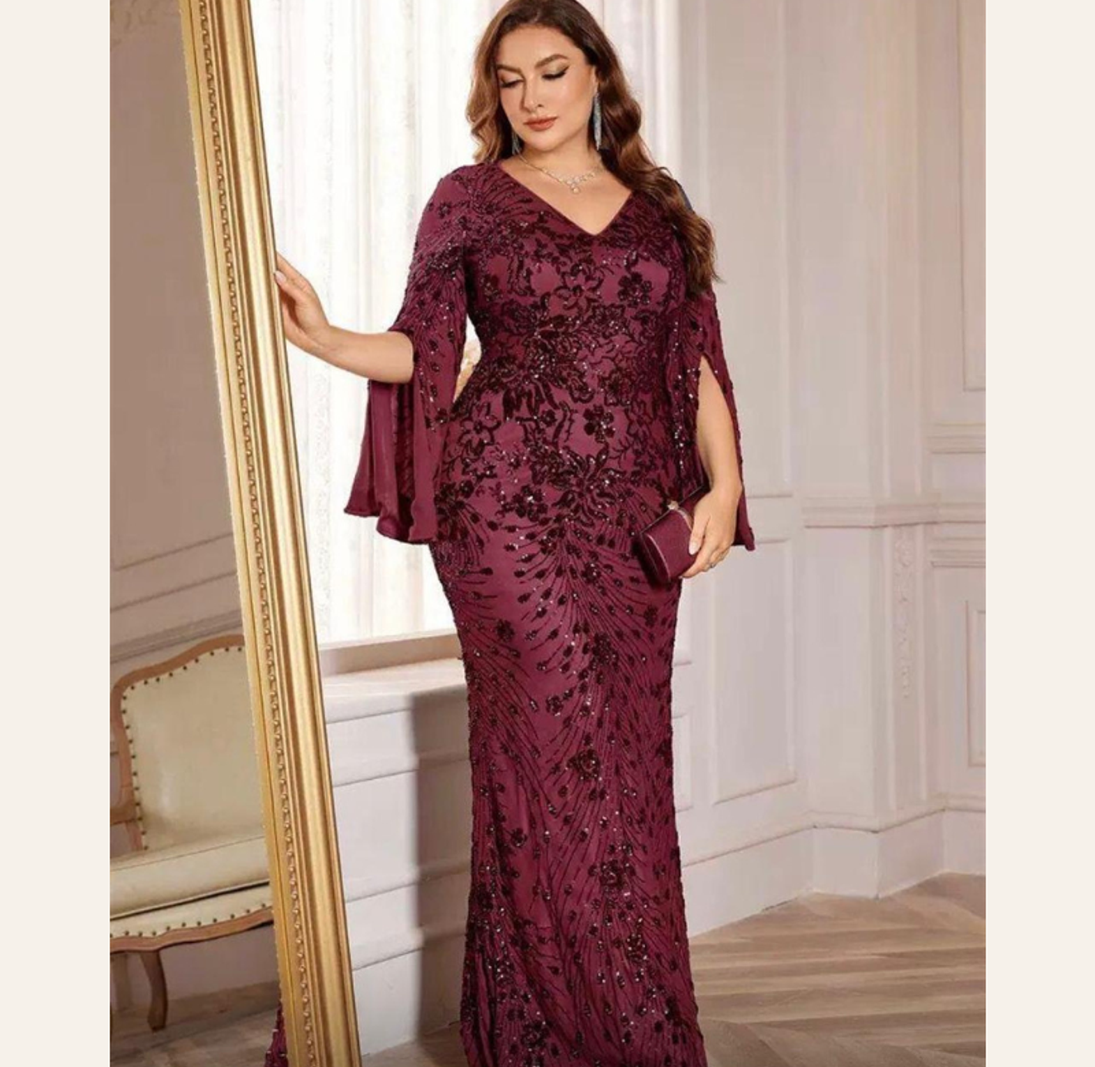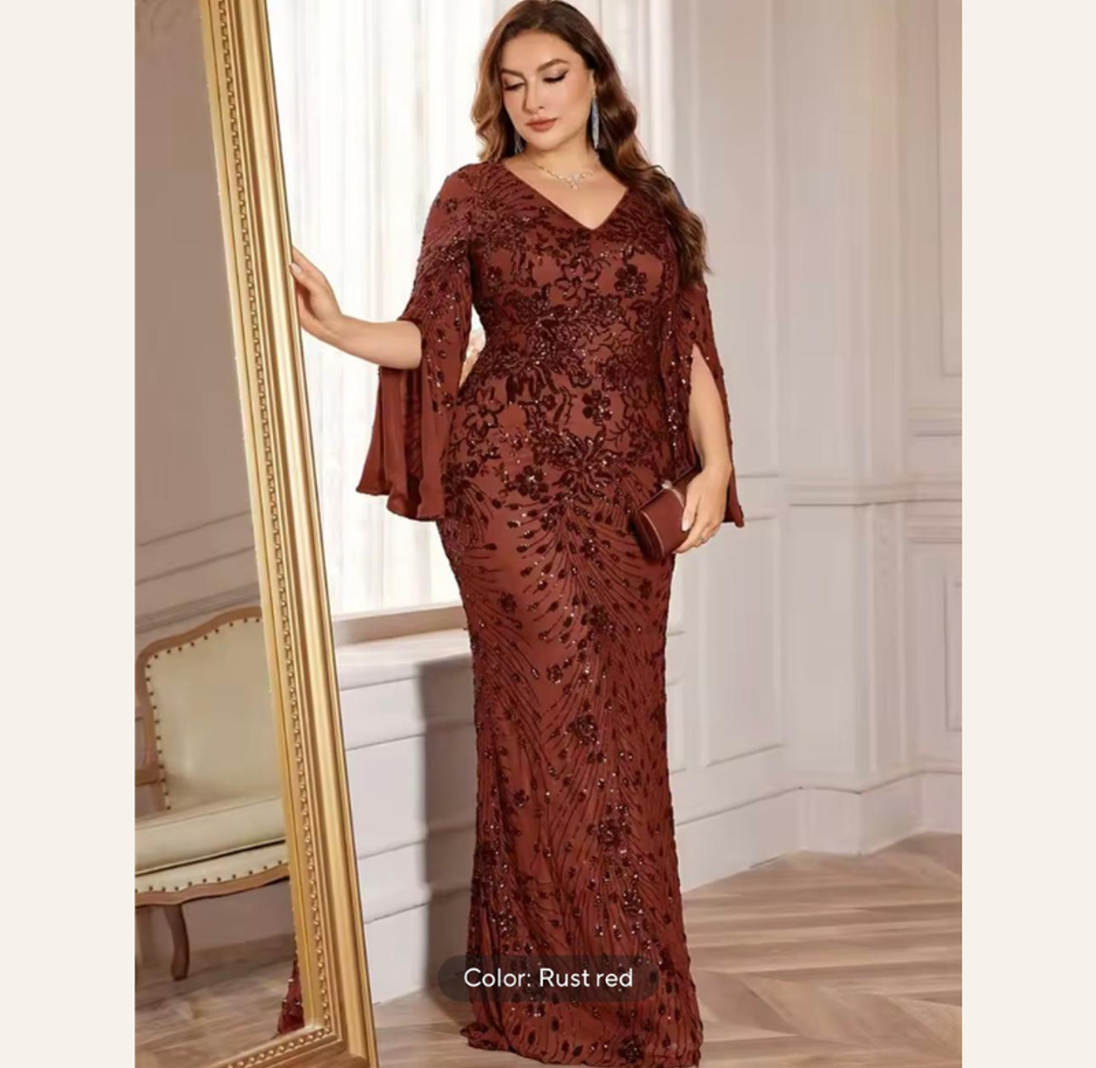 This breathtaking plus-size gown features a sophisticated rust-red sequin embroidery in a figure-flattering mermaid cut, complete with elegant, flowing slit sleeves. It offers luxurious texture and dramatic movement, perfect for the most exclusive of events.