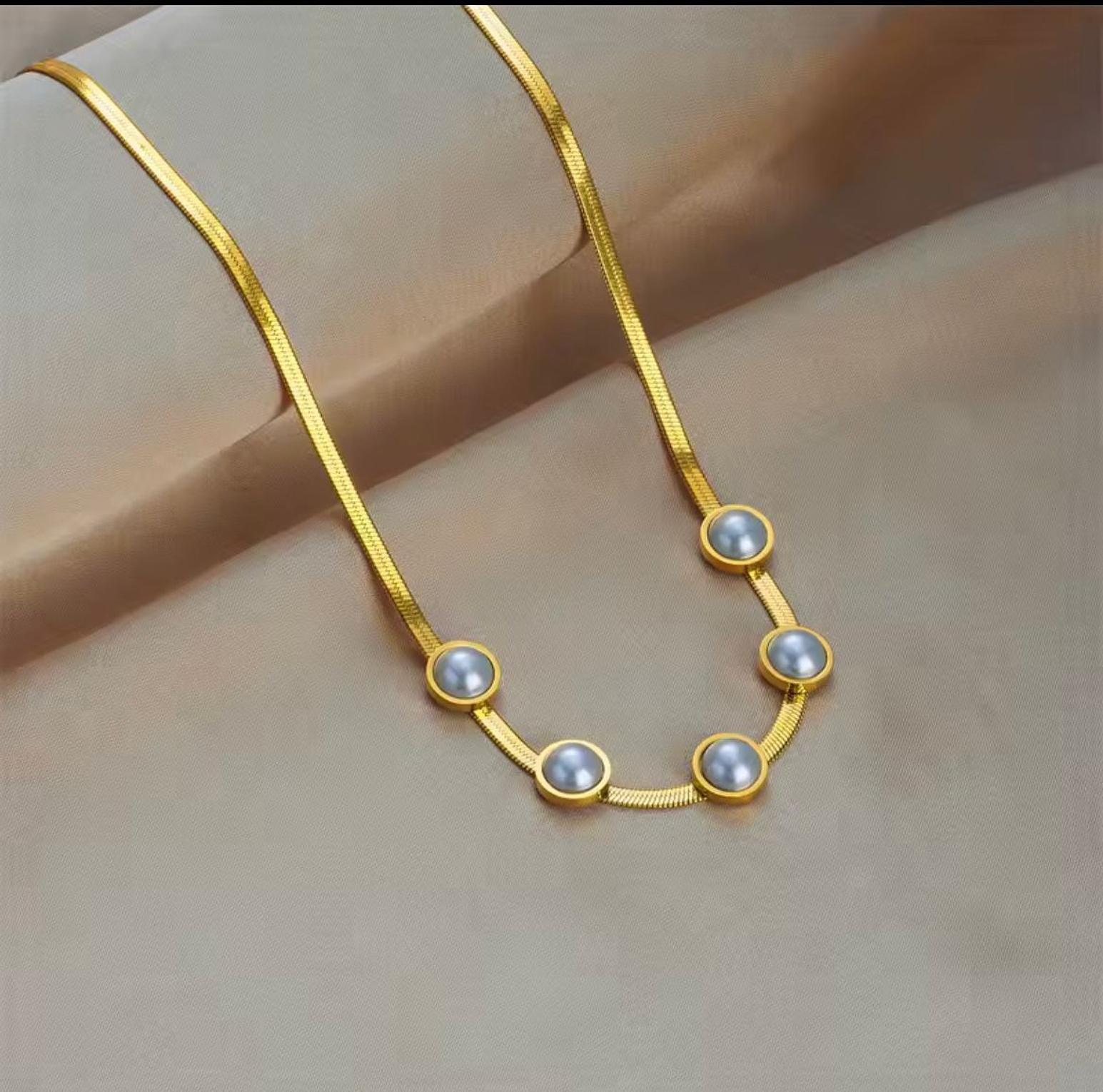 This elegant choker features a liquid-smooth herringbone chain interrupted by five captivating, grey-blue faux pearls set in polished gold bezels. The durable, gold-plated stainless steel construction offers a luxurious drape and lasting shine.