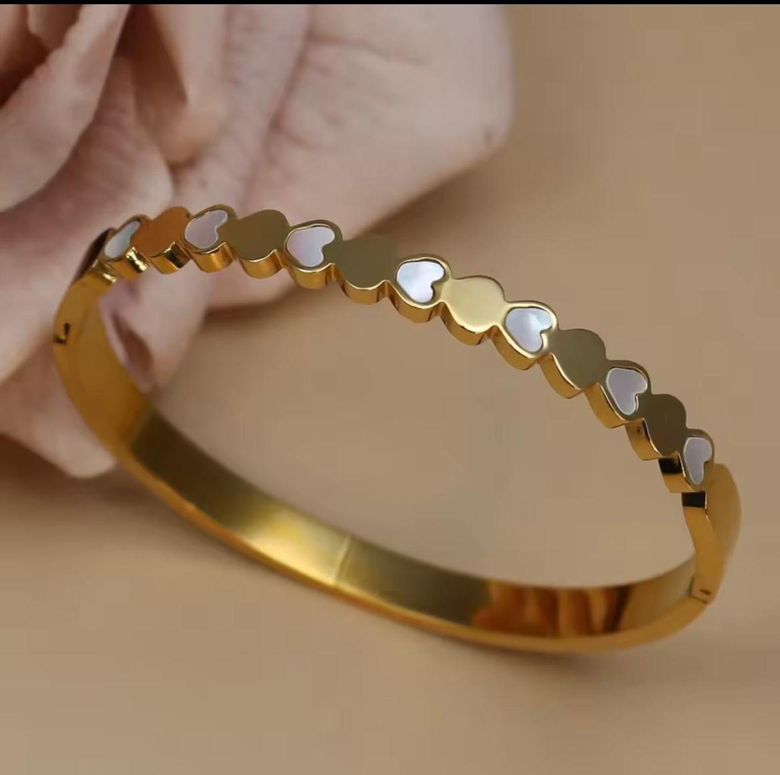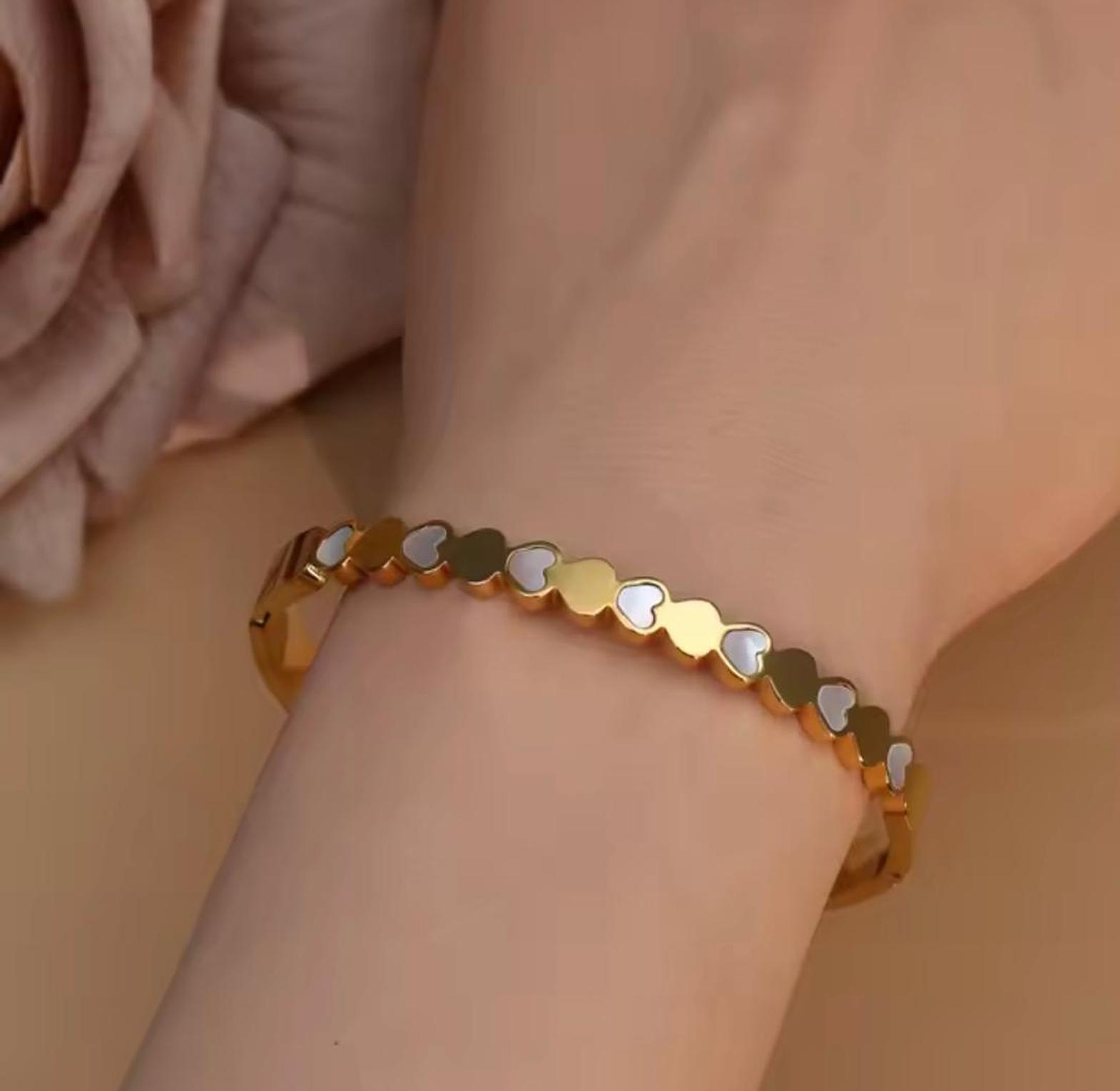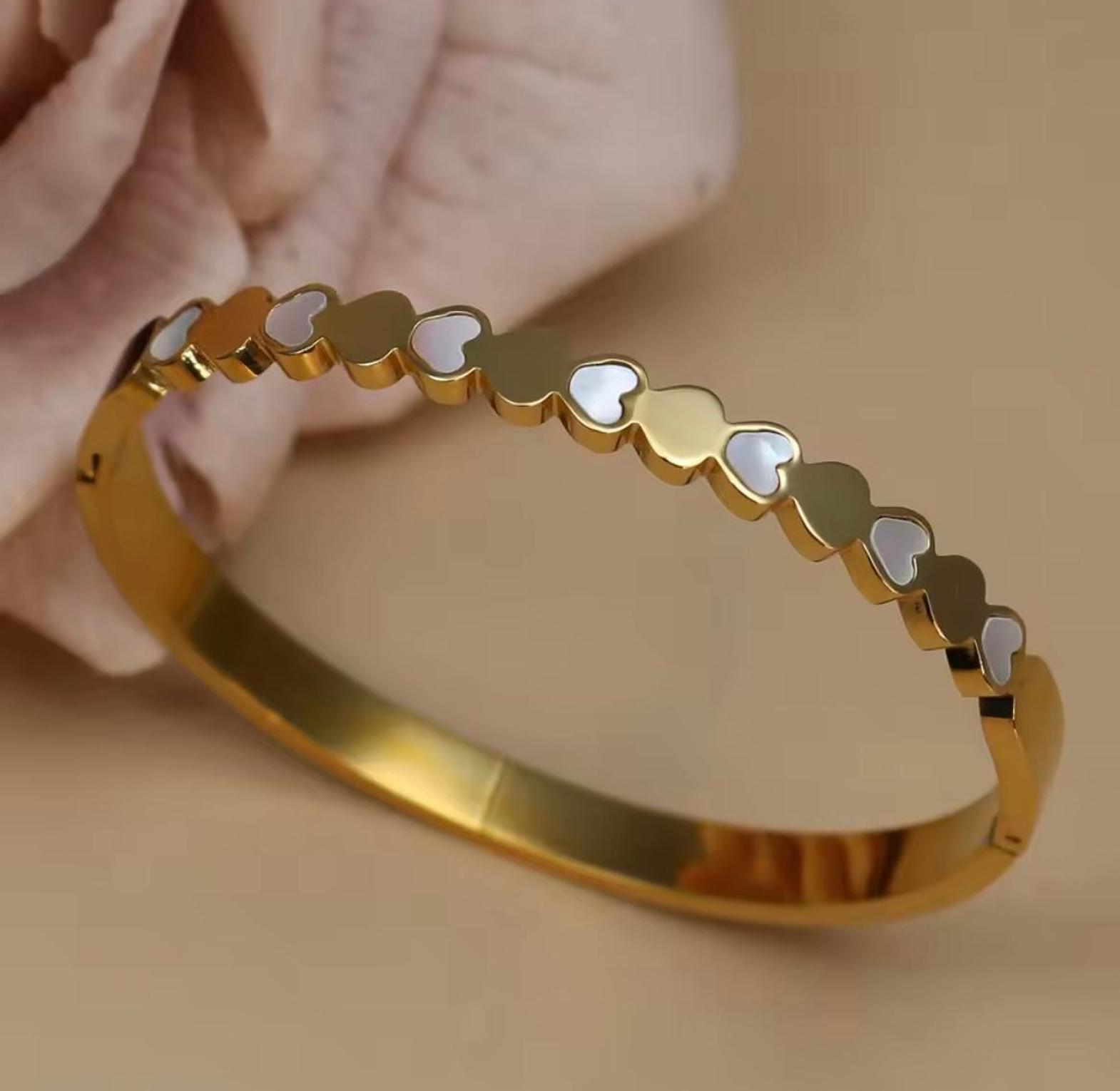 This charming gold-polished bangle features a continuous, alternating motif of polished metal hearts and delicate mother-of-pearl heart inlays. The design offers a romantic, luxurious texture and a touch of subtle luminosity.