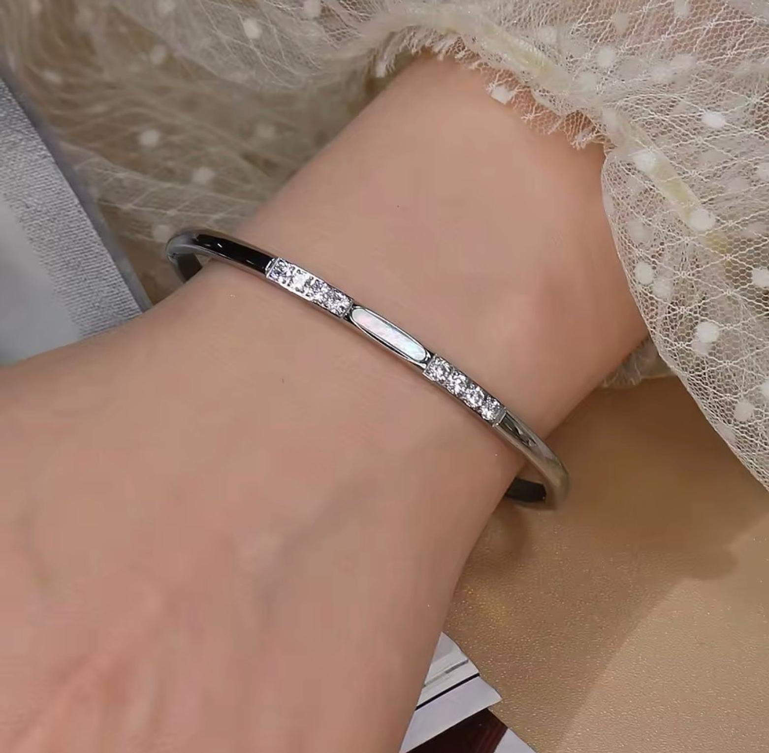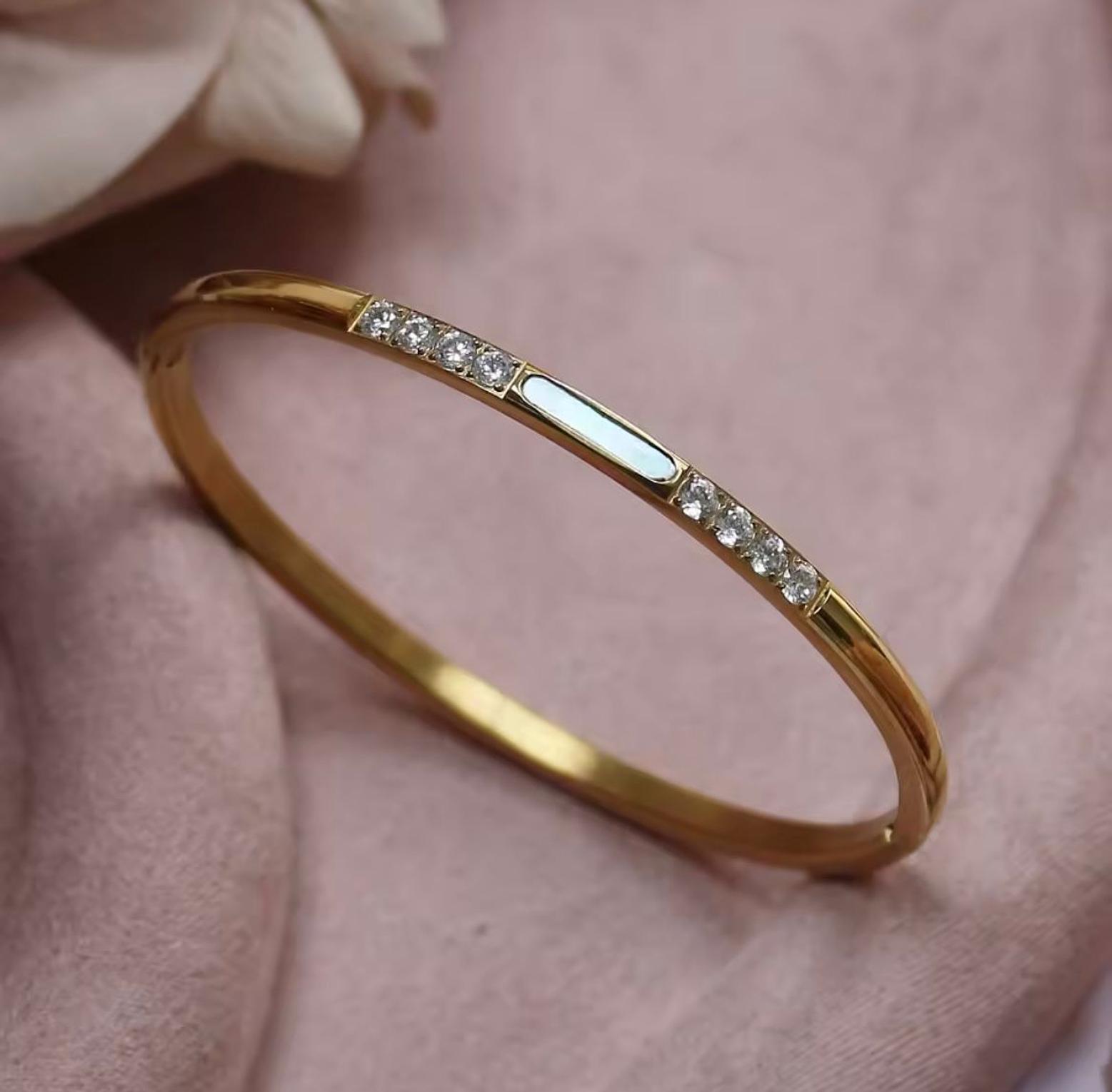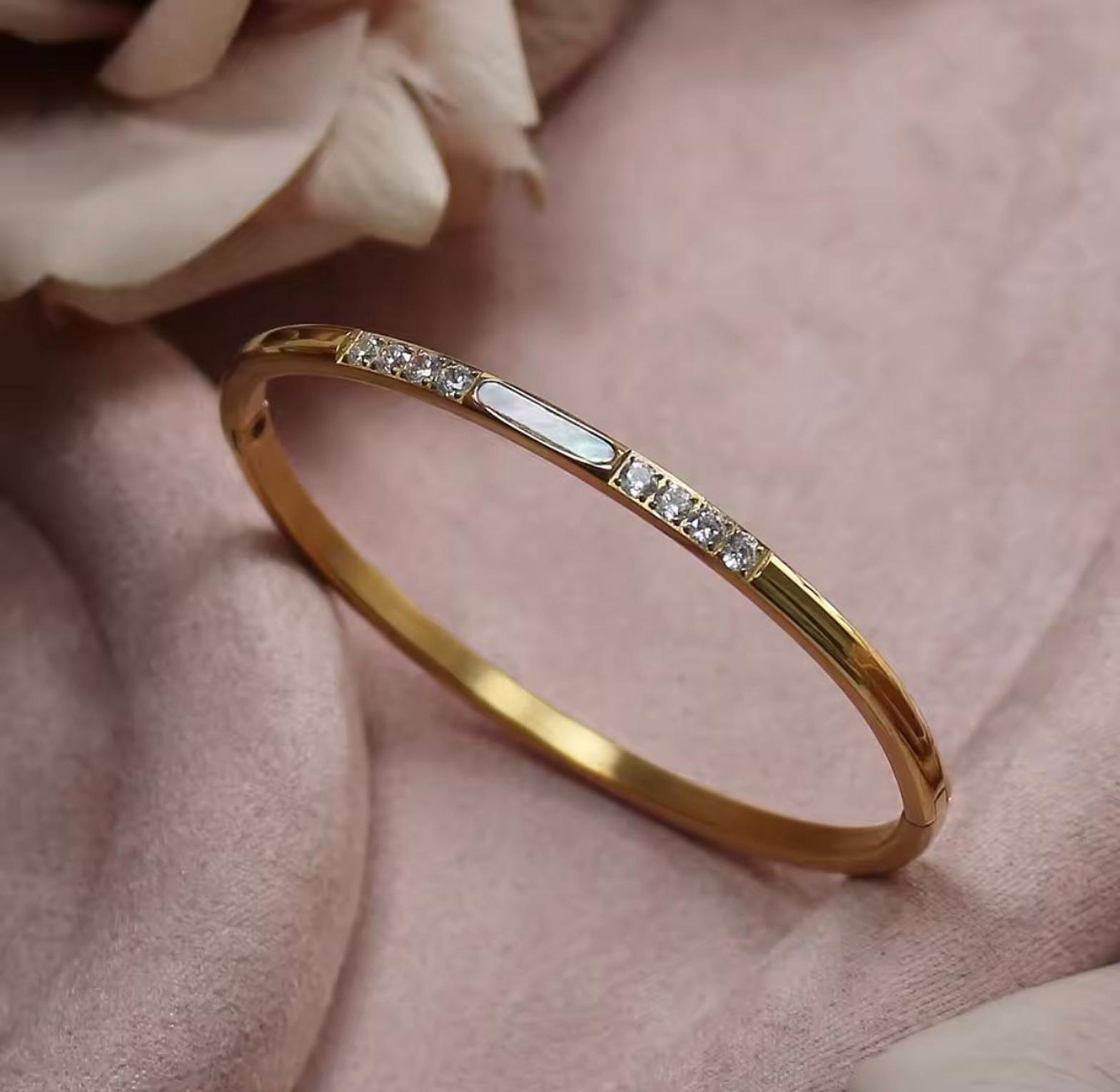 This elegant bangle seamlessly blends a polished gold-tone finish with a striking centerpiece of dazzling cubic zirconia stones. It is the perfect piece for adding a touch of brilliant, versatile luxury to any daily or evening ensemble.