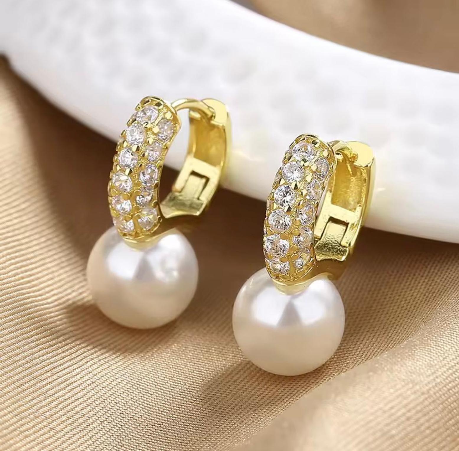 These glamorous huggie hoops feature a domed, gold-plated surface completely encrusted with brilliant micro-pave stones and finished with a dangling luminous faux pearl. They perfectly blend dazzling sparkle with classic, refined elegance.