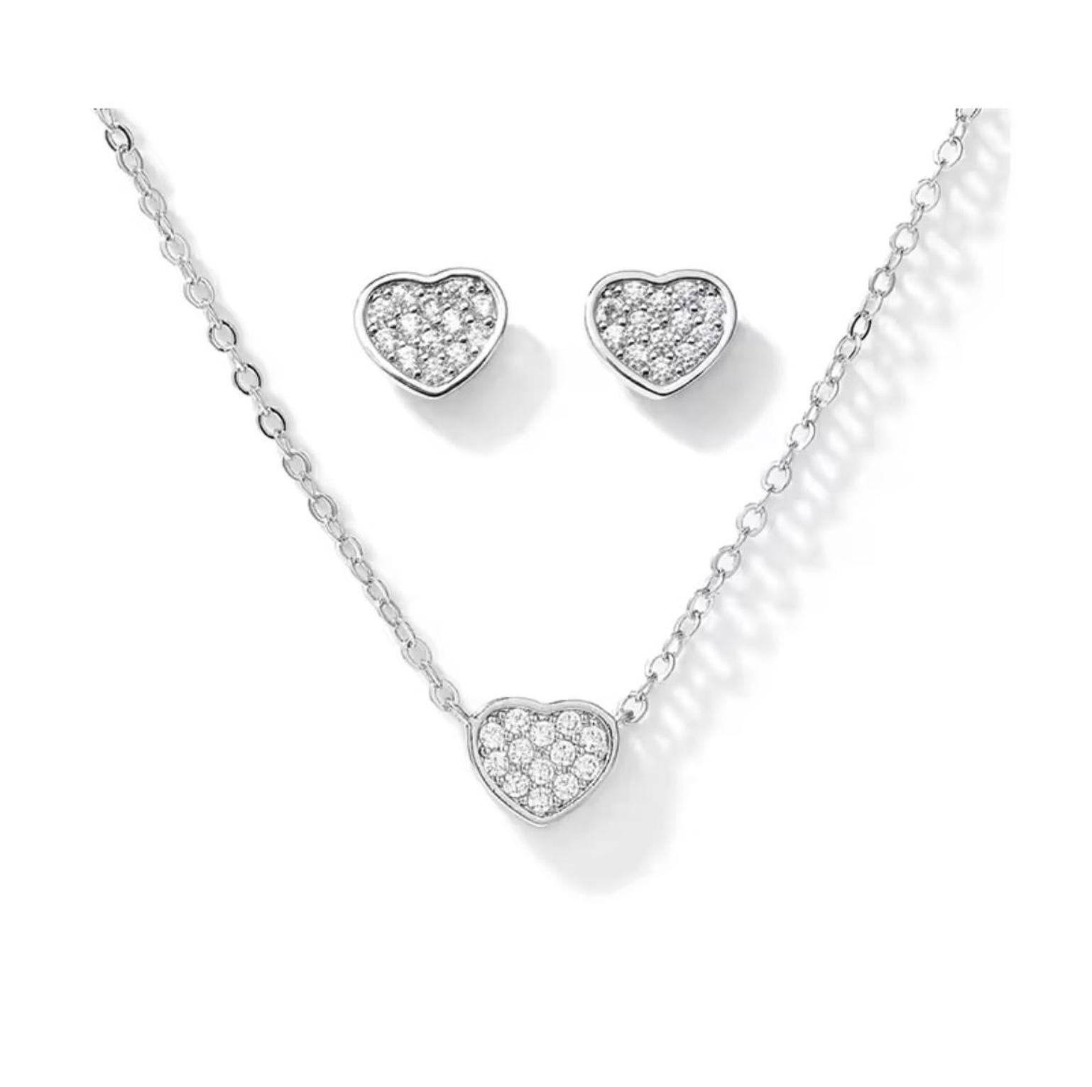 This charming jewelry set features a dainty necklace and matching stud earrings, each showcasing a small heart silhouette completely paved with brilliant stones. The classic silver-toned design offers a touch of enduring romance and subtle sparkle.