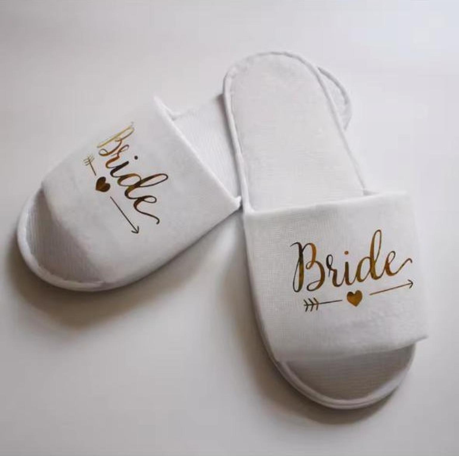 These soft, comfortable white slippers are personalized with shimmering gold foil accents identifying key roles like "Bride," "Maid of Honor," and "Bridesmaid." They offer a luxurious and coordinated touch for getting ready on the wedding day.
