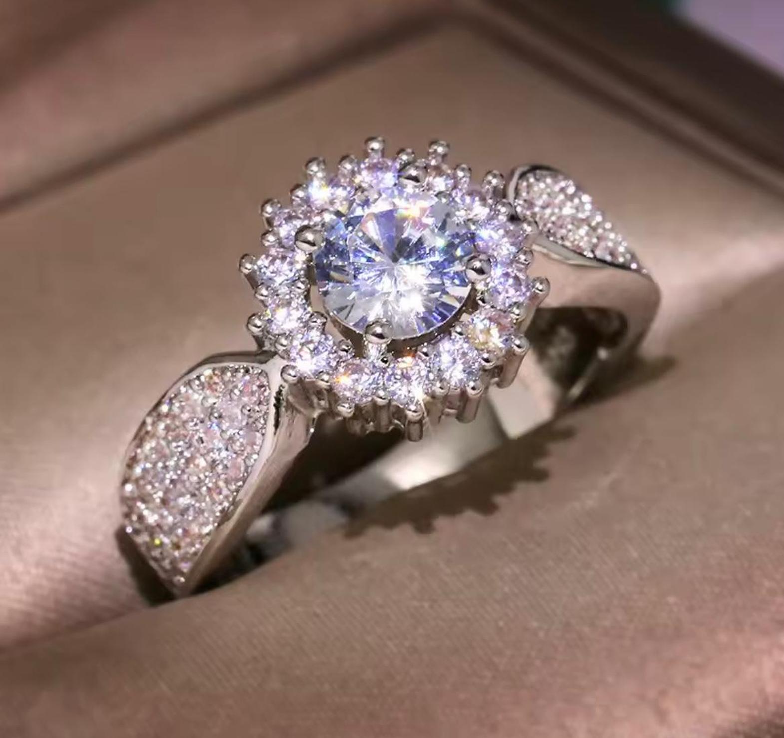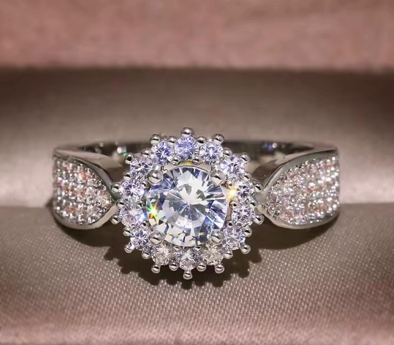 Captivate the room with this exquisite pure silver statement ring, featuring a brilliant round-cut center stone surrounded by a dazzling floral-inspired halo. Its intricate pavé-set shoulders and high-shine finish offer a luxurious, vintage-inspired aesthetic for any special occasion.