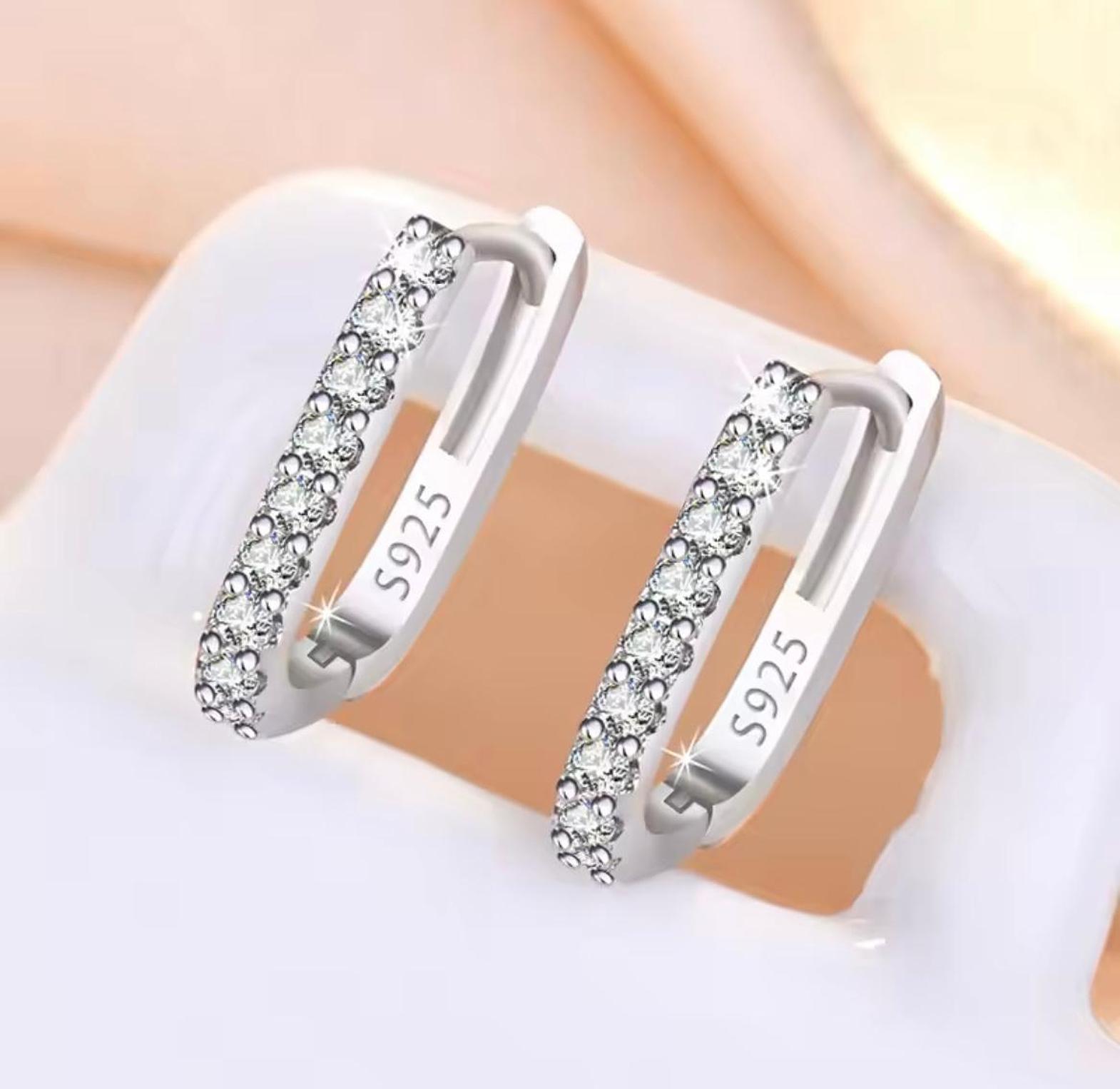 These sleek, uniquely shaped huggie hoops feature a modern rectangular profile entirely encrusted with dazzling pave-set cubic zirconia stones. They provide continuous, geometric sparkle and fit snugly for comfortable, everyday elegance.