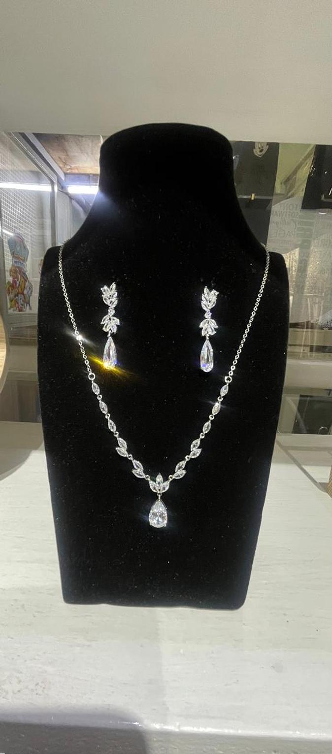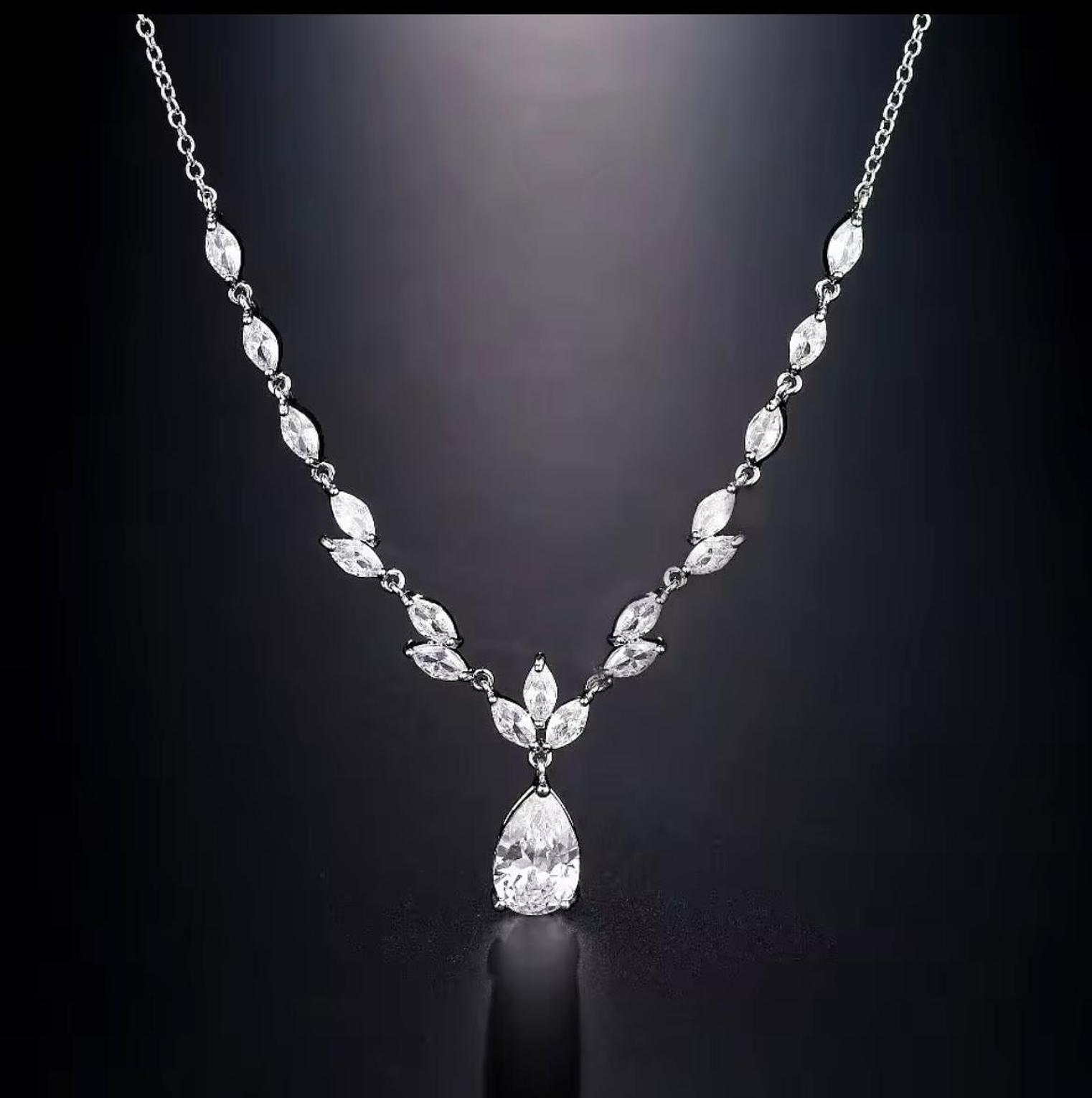 This stunning silver-tone set features delicate marquise-cut accents forming a graceful vine that culminates in a brilliant pear-shaped drop pendant. The perfectly coordinated necklace and earrings create a cohesive, show-stopping look for any formal event.