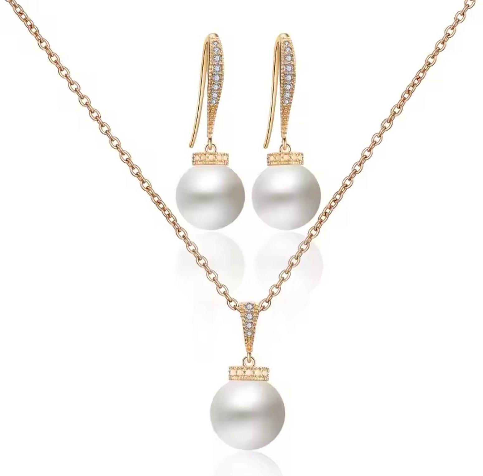 This elegant matching set features luminous simulated pearls suspended from shimmering, diamond-accented bails. The entire collection is crafted with hypoallergenic materials, ensuring comfortable, sophisticated wear for any occasion.