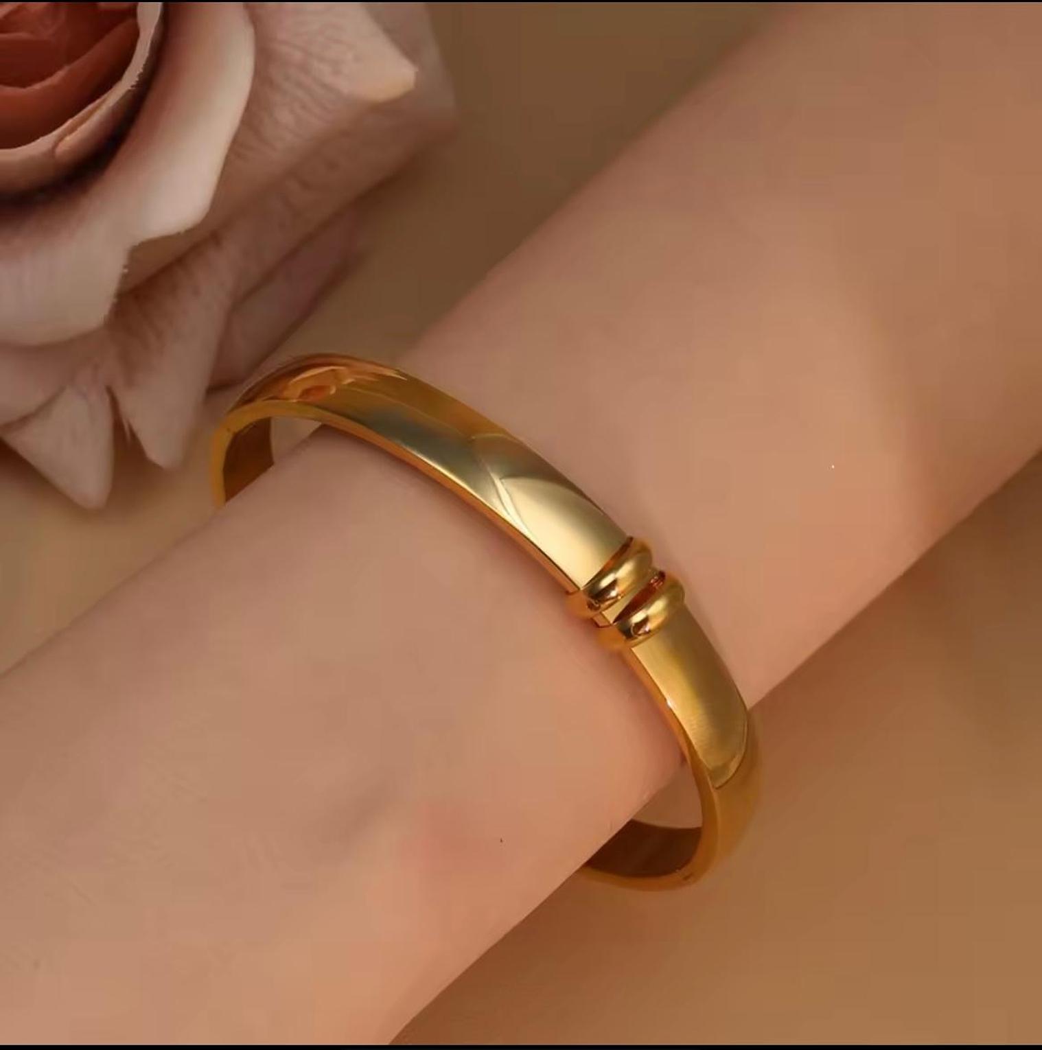 This timeless bangle features a luxurious gold plating and a polished, solid band accented by elegant etched details. Constructed with hypoallergenic properties, it offers both style and comfortable, irritation-free wear for sensitive skin.