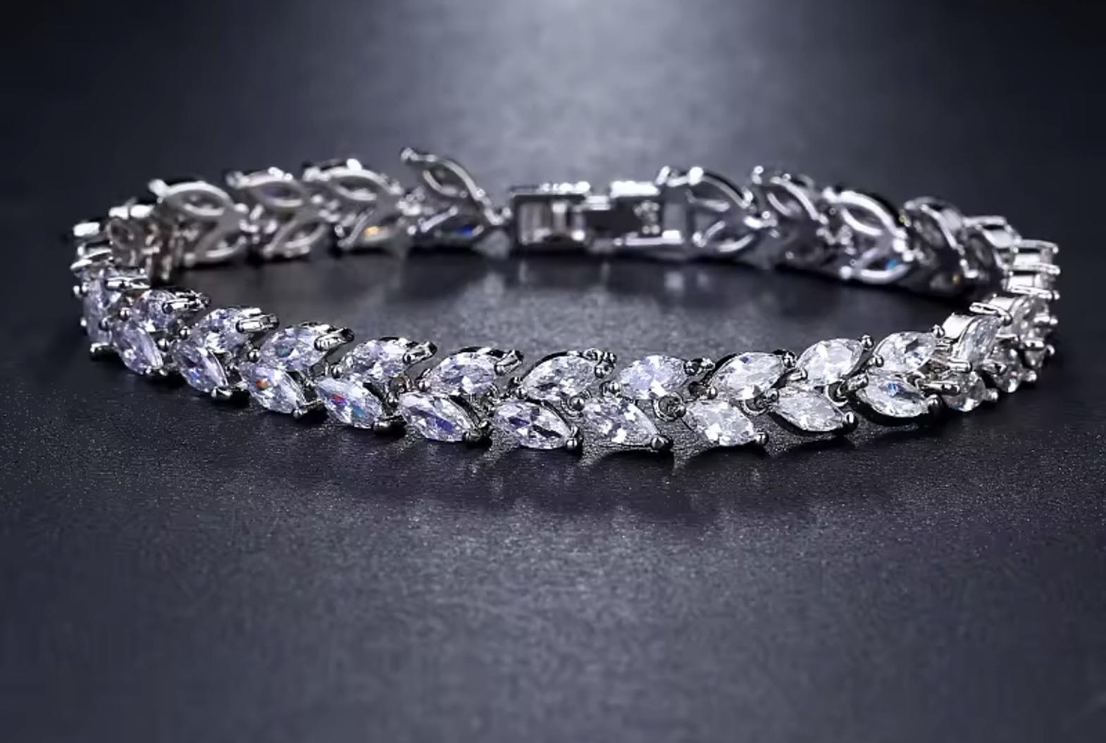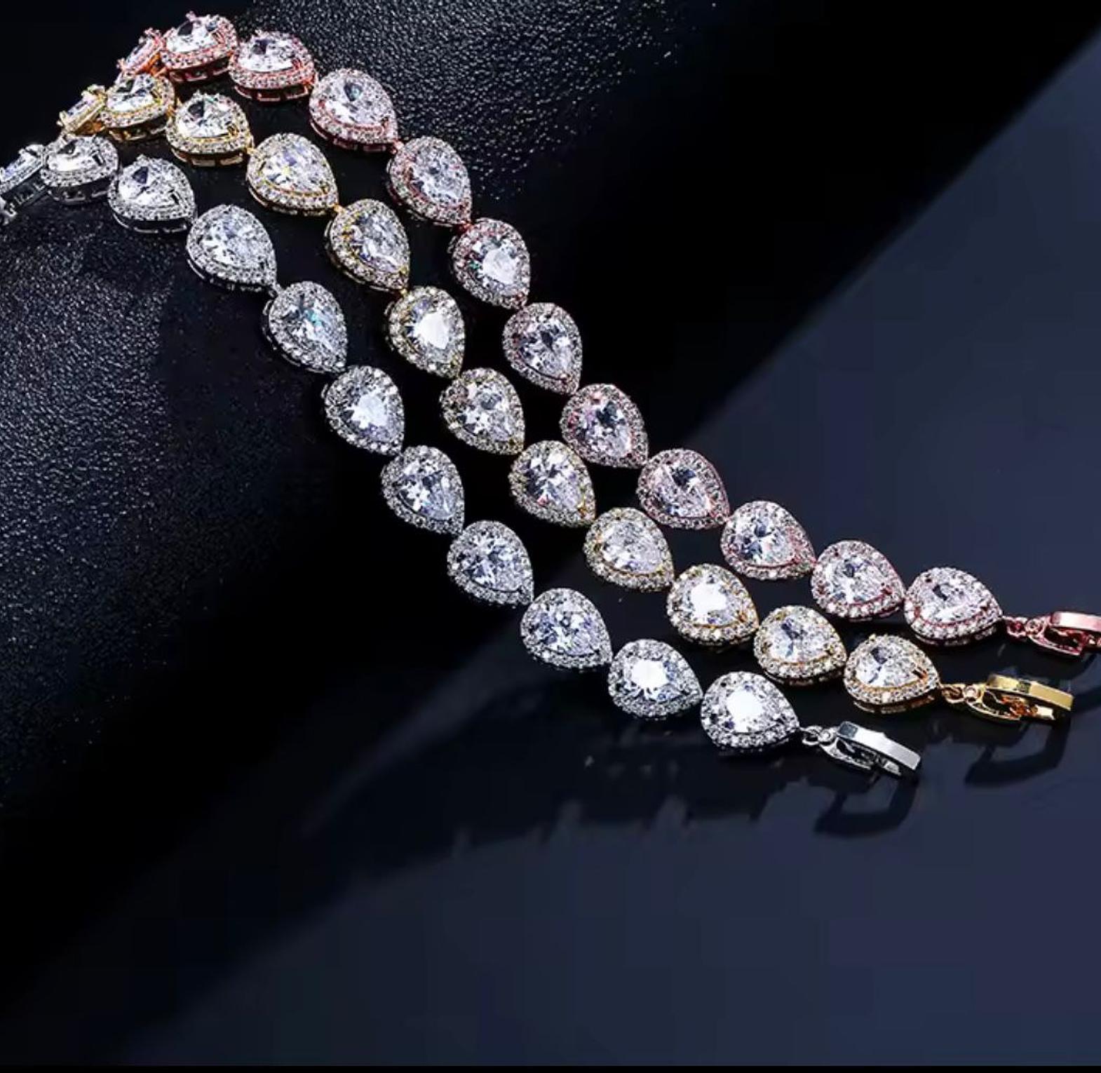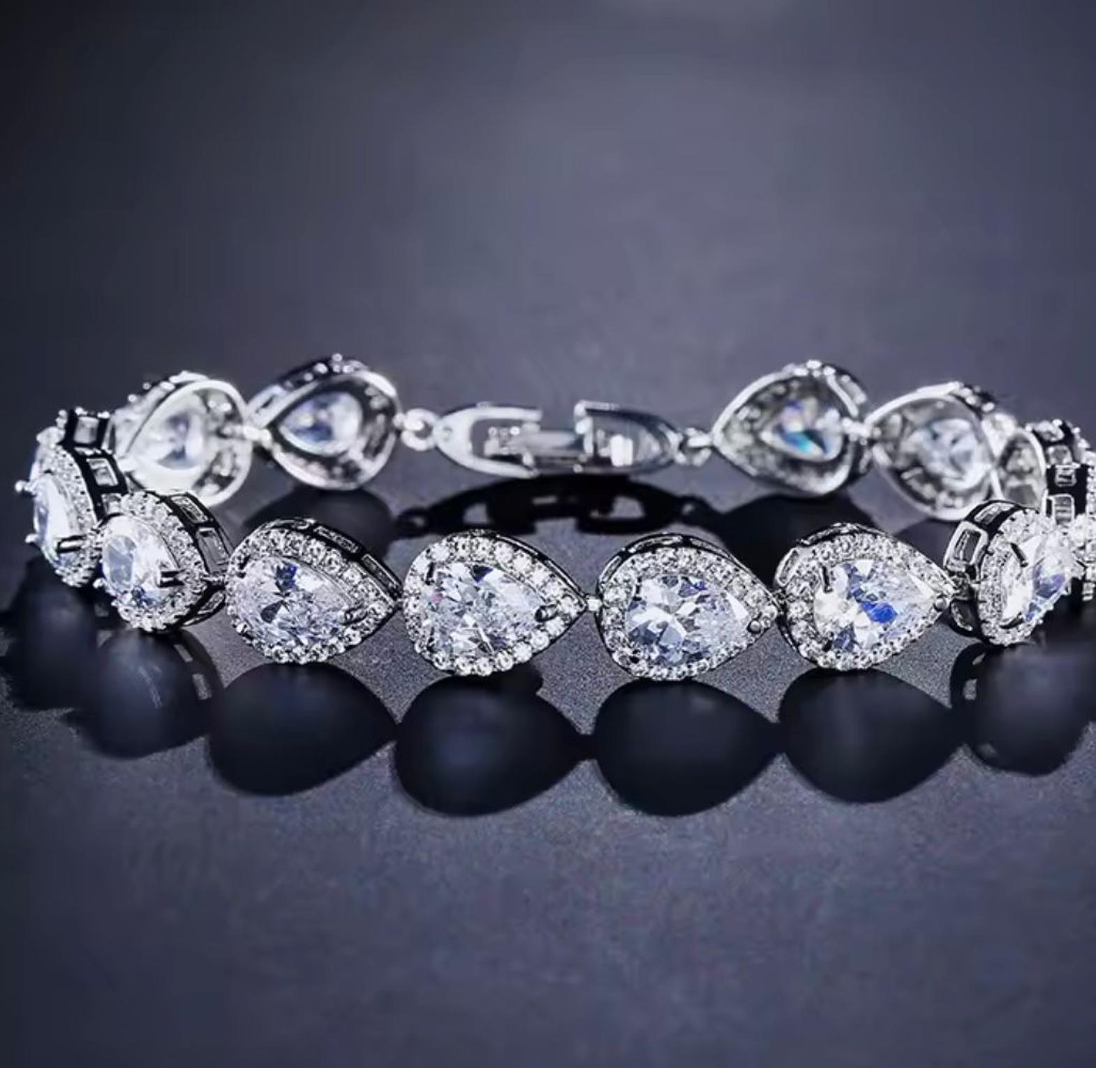 This elegant chain bracelet showcases a row of dazzling teardrop cubic zirconia stones encased in a delicate halo setting. Its superior craftsmanship ensures a comfortable, hypoallergenic fit, perfect for sensitive skin.