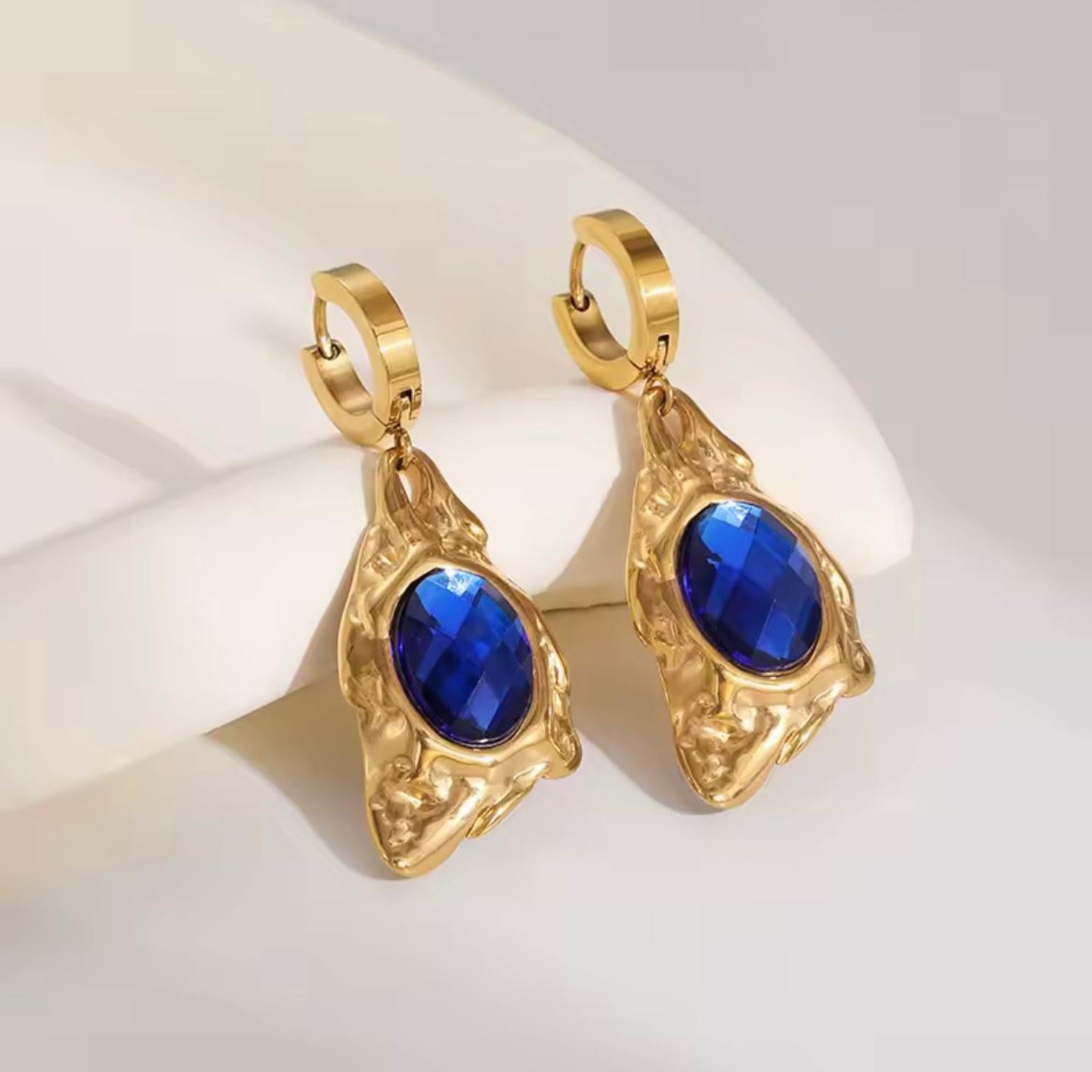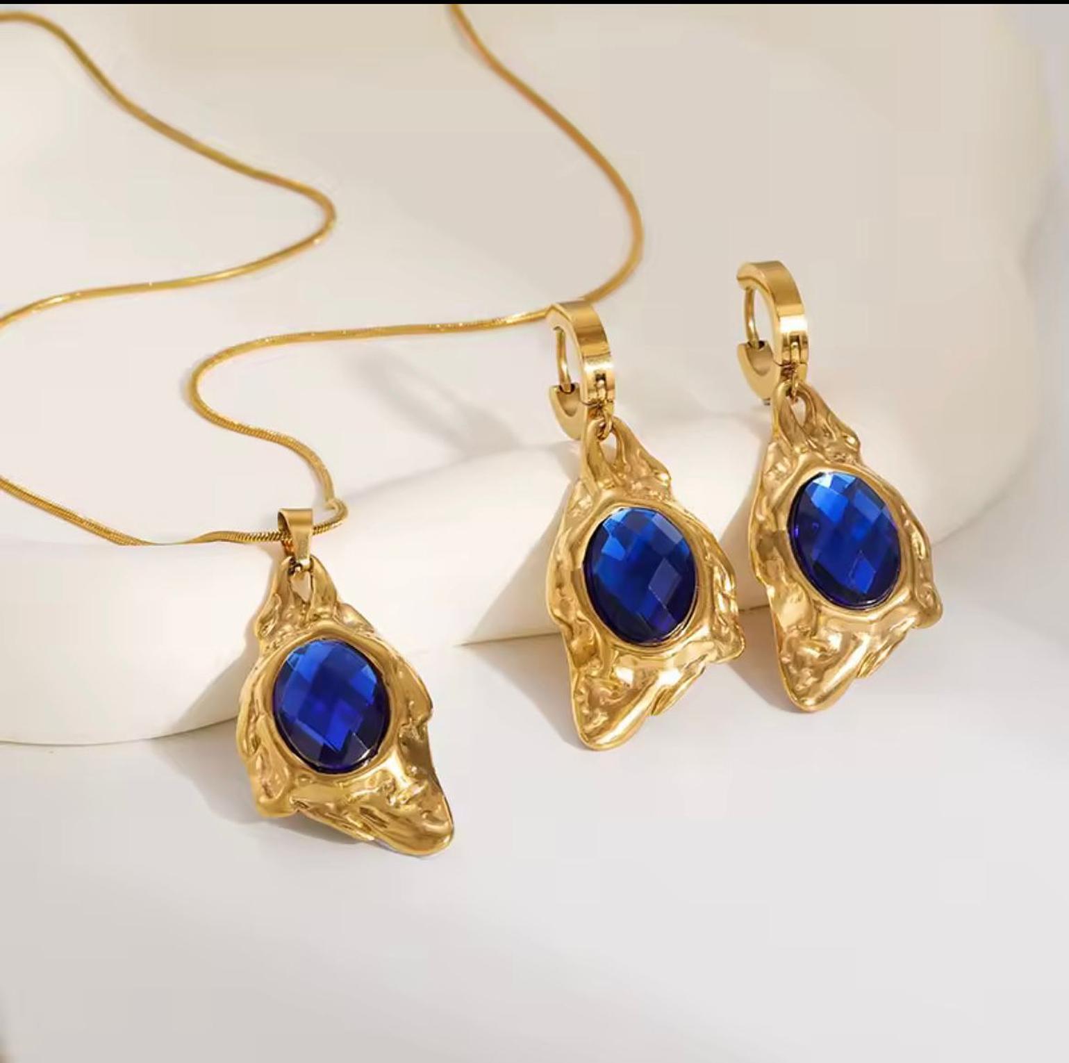 Radiate a majestic glow with this striking sapphire-inspired set, featuring deep cobalt crystals nestled in molten-textured gold. It is an opulent statement piece designed for those who command attention with a blend of vintage grandeur and modern artistry.
