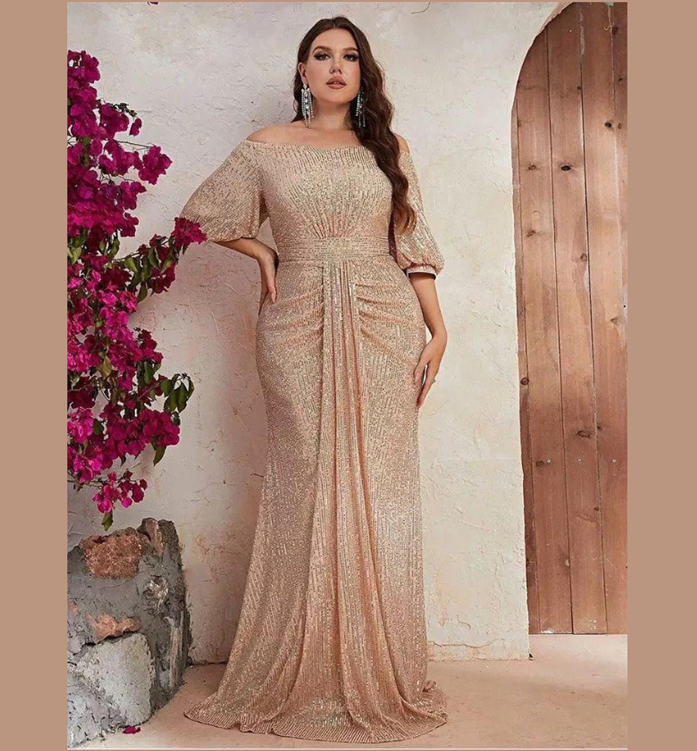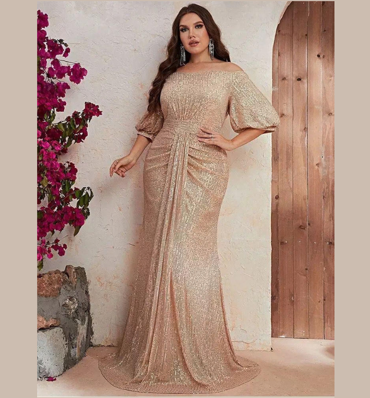 Step into the spotlight with the Seraphina Gown, a stylish dress designed for the woman who loves to shine. This elegant dress features a breathtaking off-the-shoulder neckline that beautifully frames the collarbone, while the puff sleeves add a touch of vintage-inspired romance. Crafted with intricate sequin detailing, this women’s dress catches the light from every angle, ensuring you remain the center of attention all night long. The gathered waist and floor-length skirt create a statuesque look that celebrates your natural curves with a high-fashion edge.