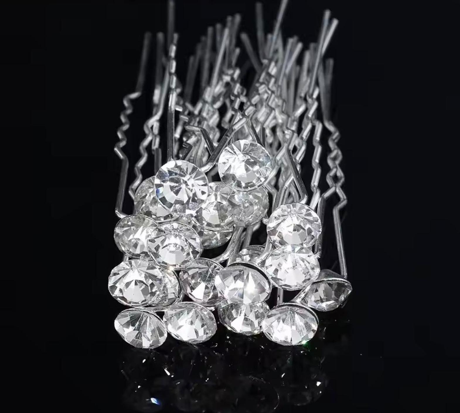 These brilliant hair pins each feature a large, multifaceted crystal that captures and reflects light with diamond-like intensity. They are the ultimate accessory for injecting concentrated sparkle and luxurious shimmer into any formal updo. 3 pins for 100