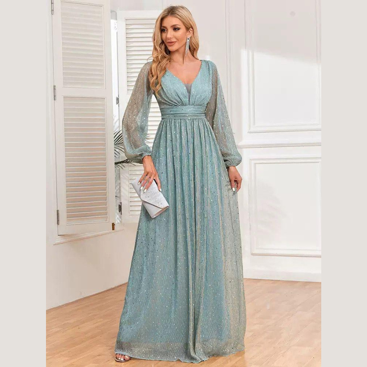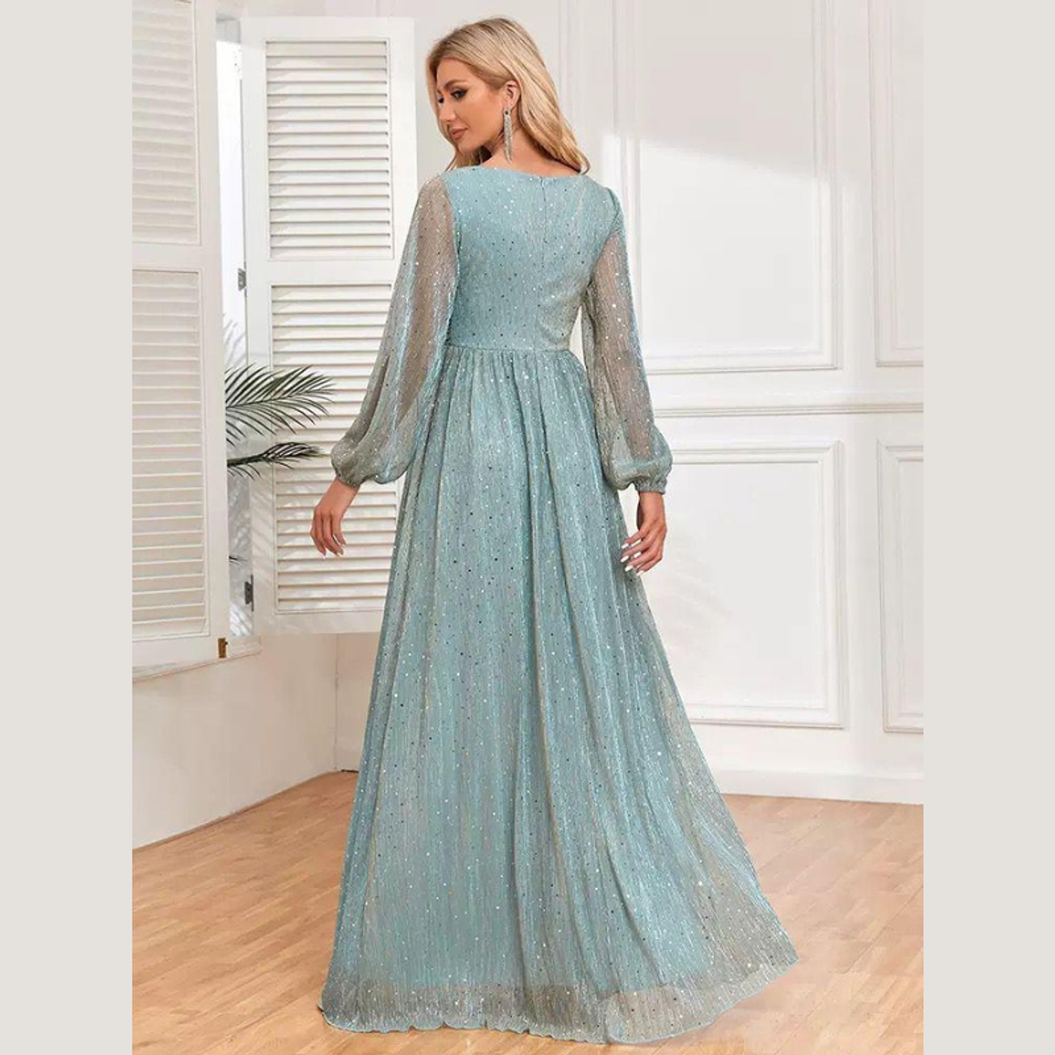 This ethereal maxi dress features a stunning A-line silhouette with sheer, voluminous balloon sleeves and a delicate overall glitter sparkle. The elegant, draped V-neck bodice and flowing skirt create a romantic, figure-flattering look perfect for evening wear.