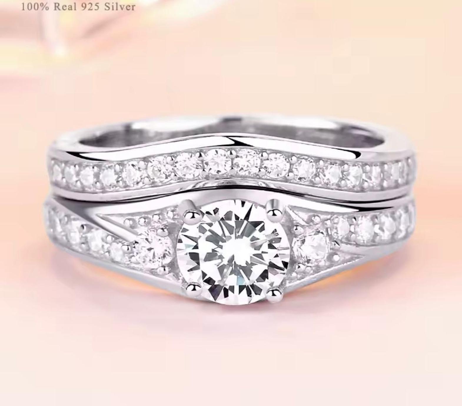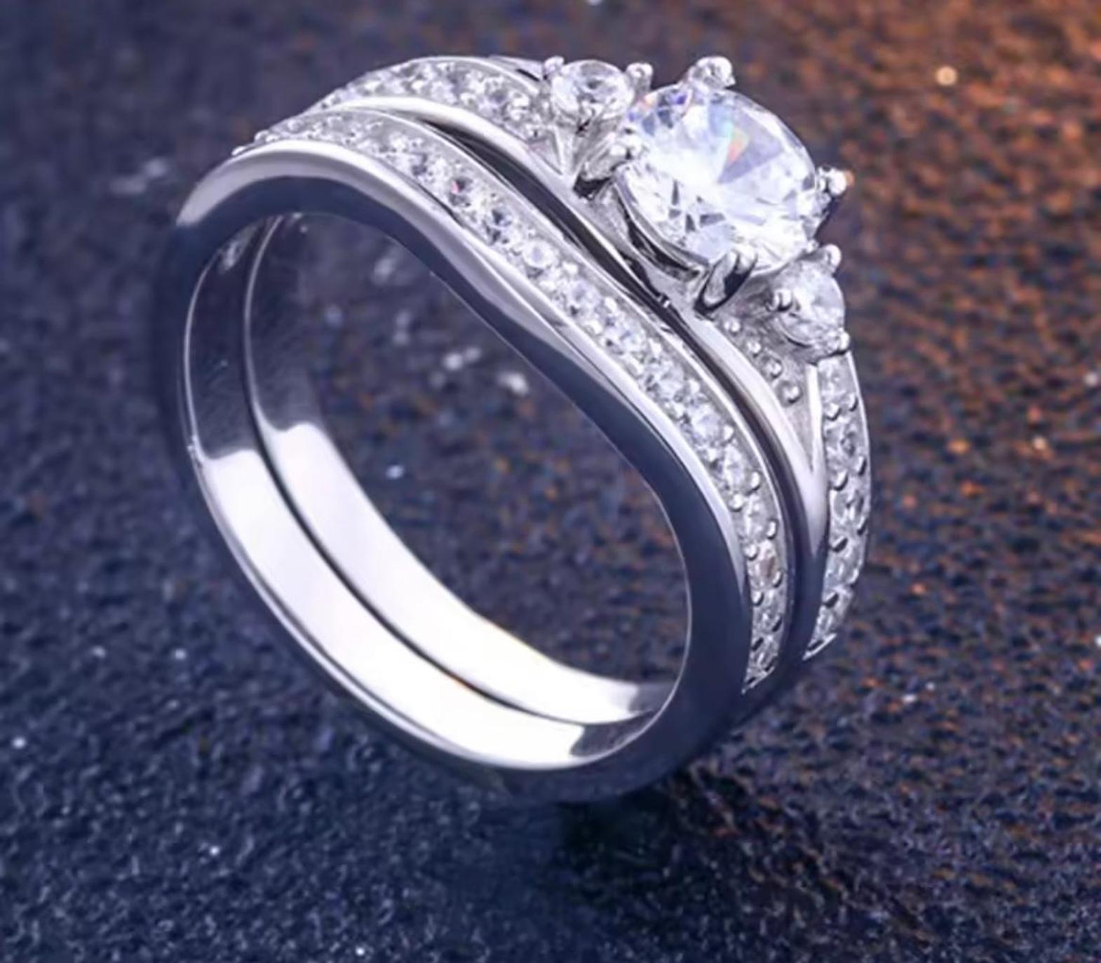 Radiate elegance with this stunning 2-in-1 pure silver bridal set, featuring a brilliant round-cut center stone and graceful, wave-inspired pavé bands. This high-shine duo offers a fluid, romantic design that captures the essence of modern luxury.