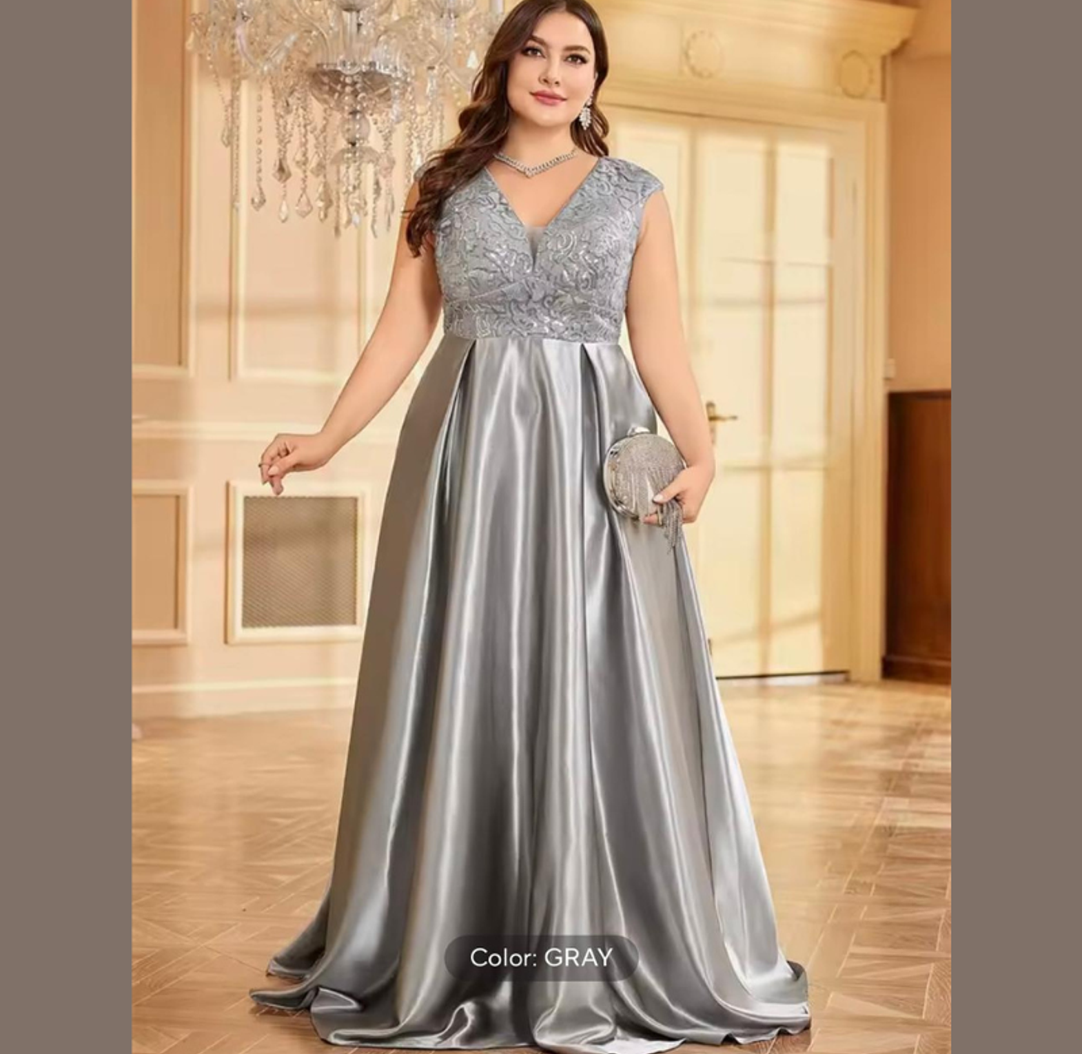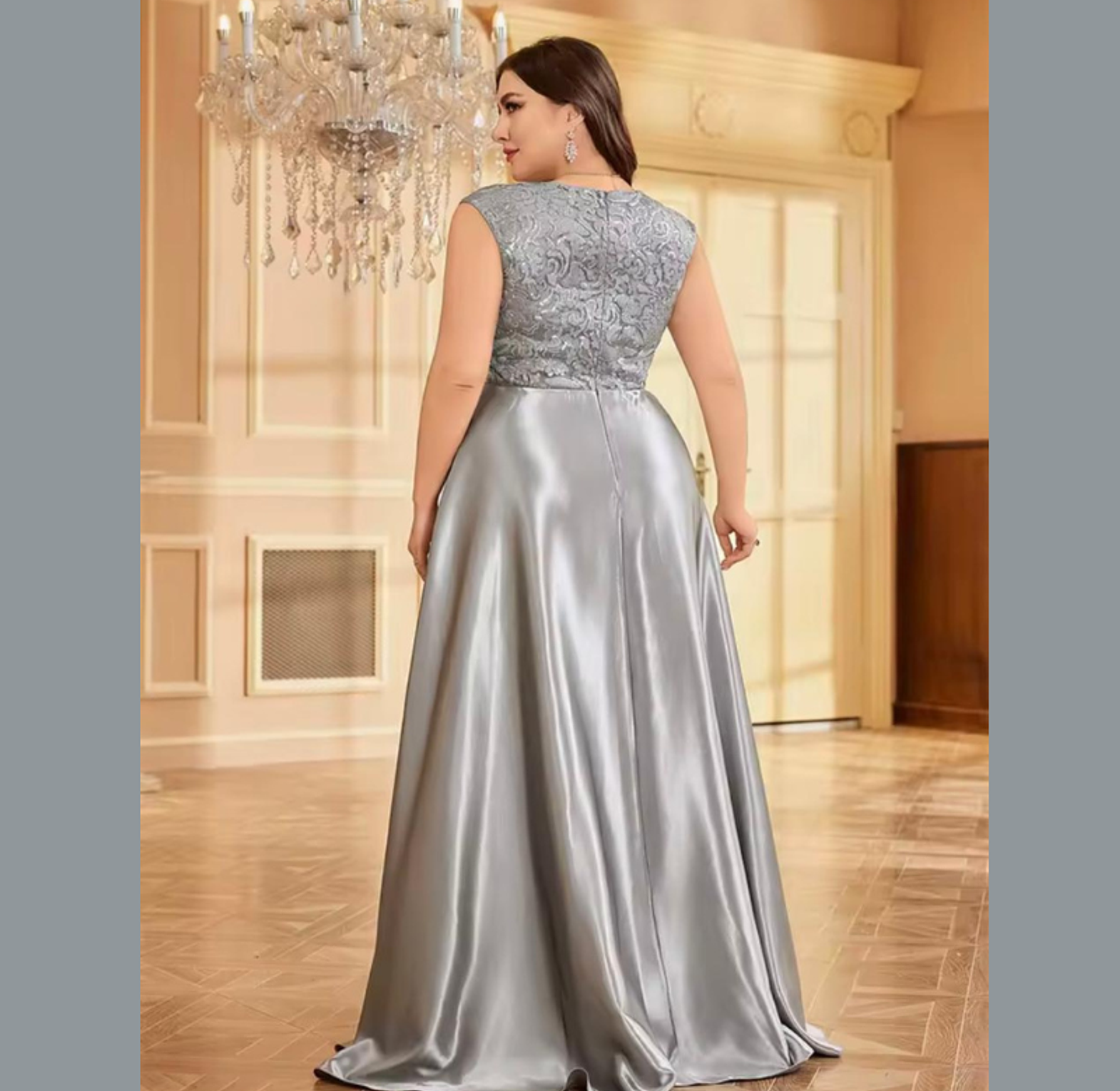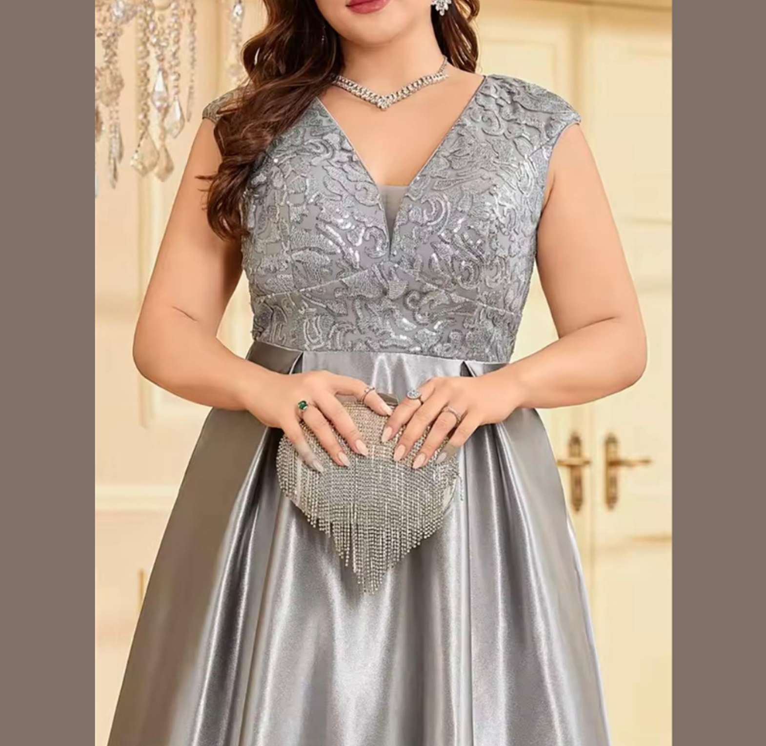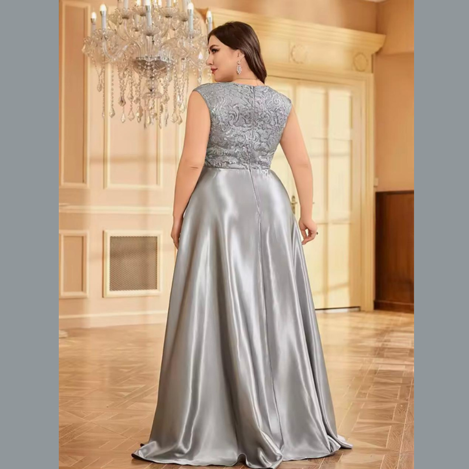 This magnificent gown features a luxurious, high-sheen satin A-line skirt perfectly contrasted with a finely textured lace-effect bodice. The classic V-neck silhouette offers a timeless, sophisticated glamour for any formal event.