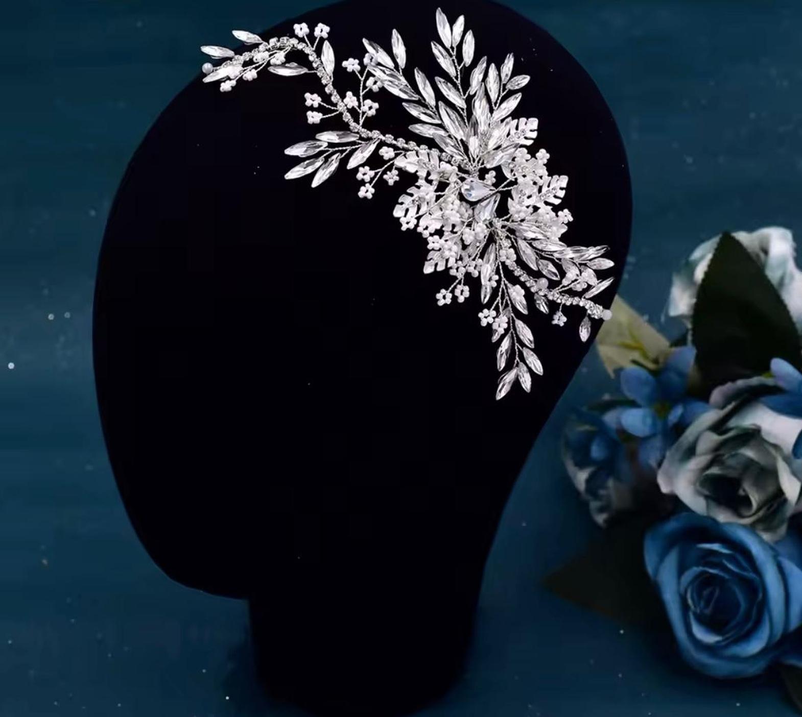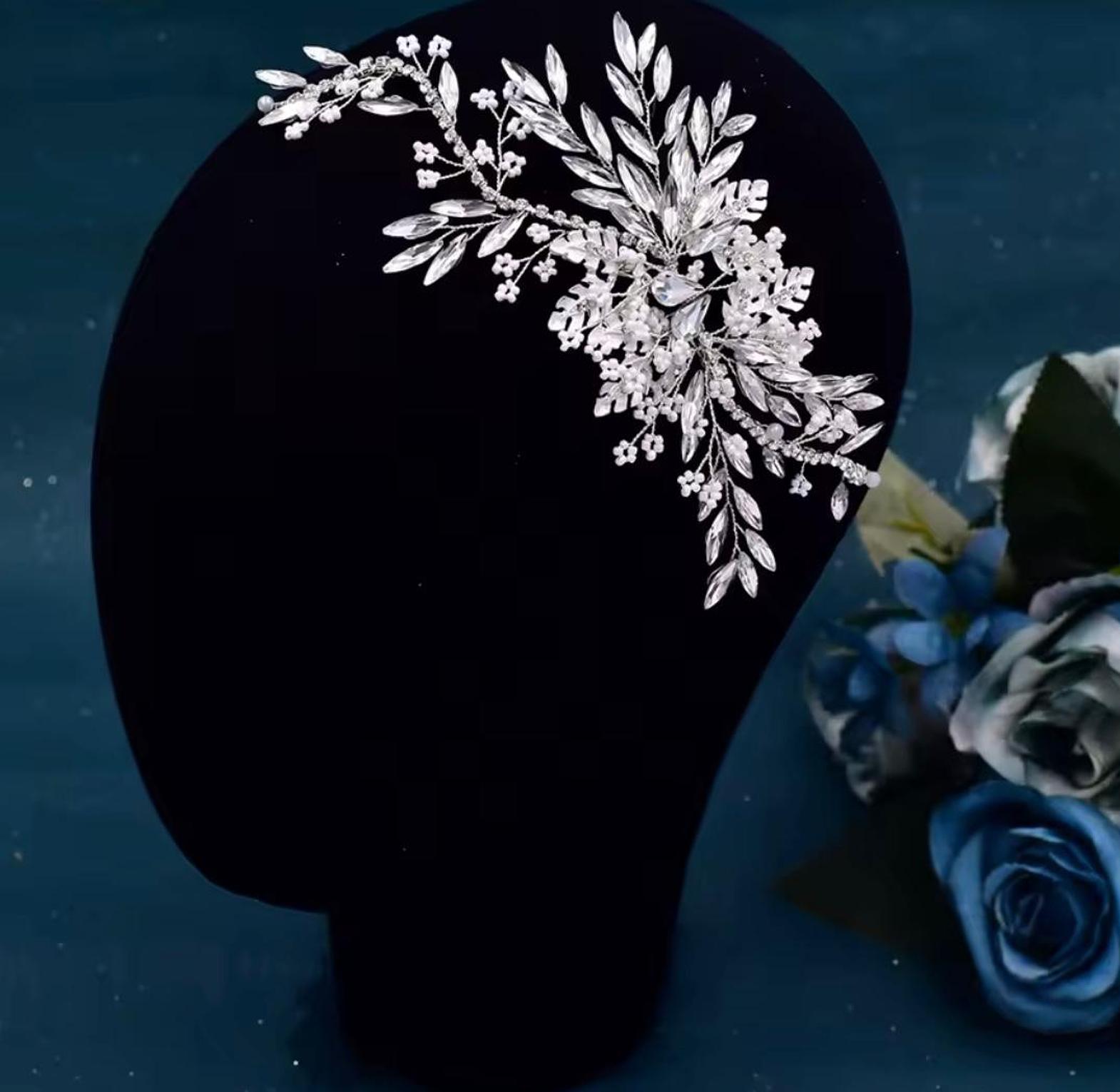 This elegant, asymmetrical flower based hair vine features a beautiful mix of brilliant crystal leaves and petite floral clusters. Finished in a luminous white colour setting, it is designed to sweep gracefully along the side of the head or an updo.