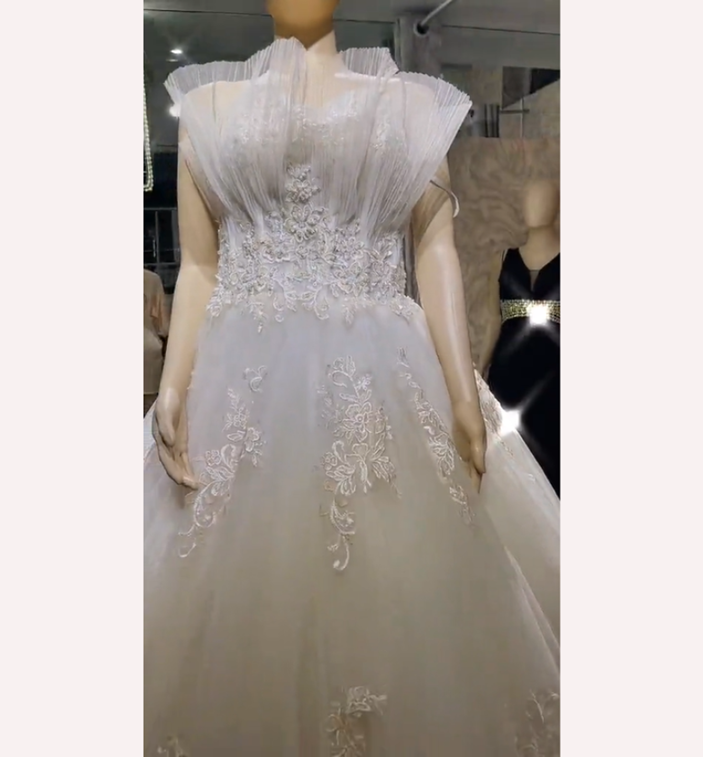 This dramatic ballgown makes an artistic statement with its unique, voluminous pleated ruffle neckline and elegantly fitted waist. Delicate floral lace appliqués cascade down the full skirt, adding texture and sophisticated romance to the design.
