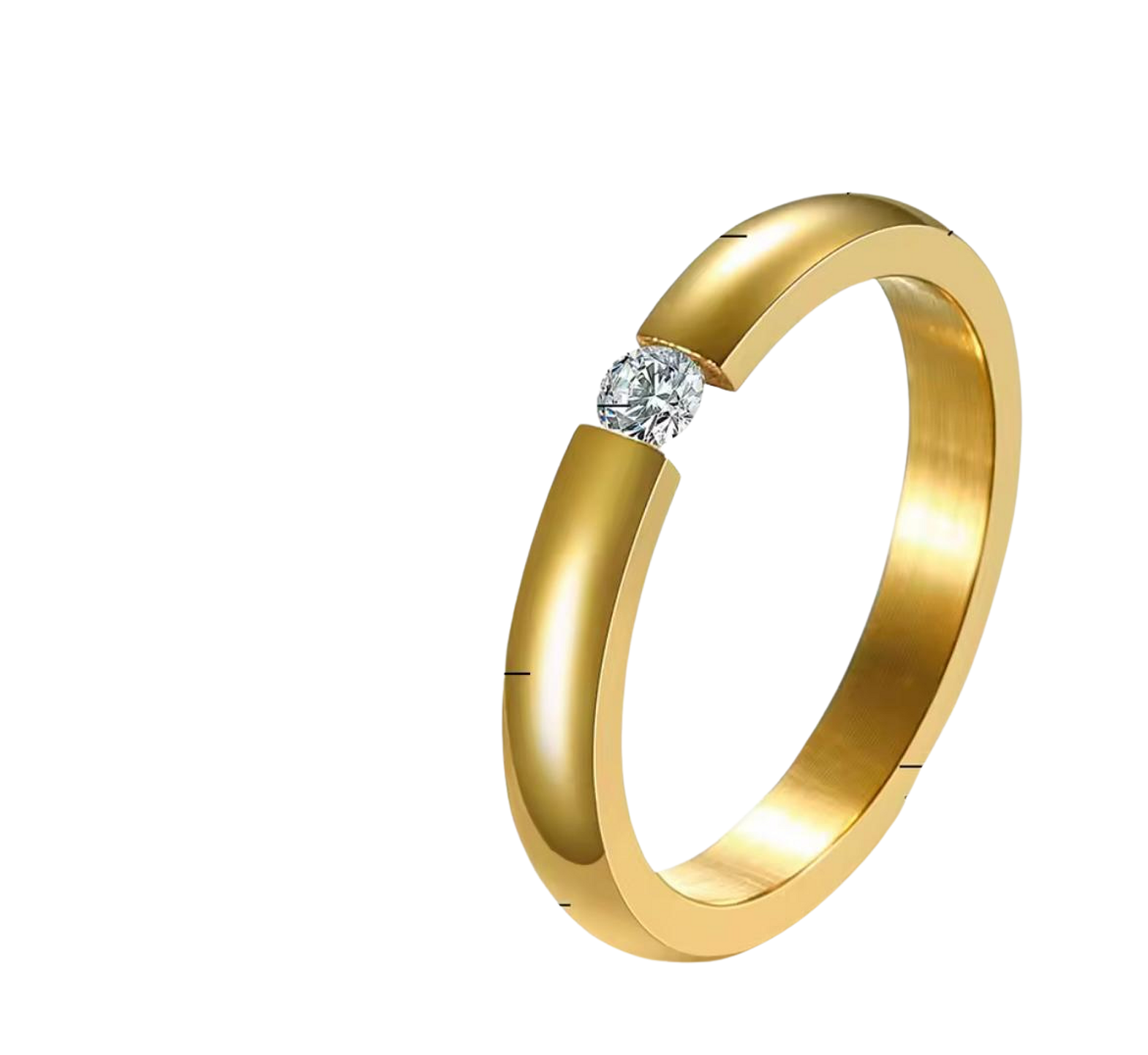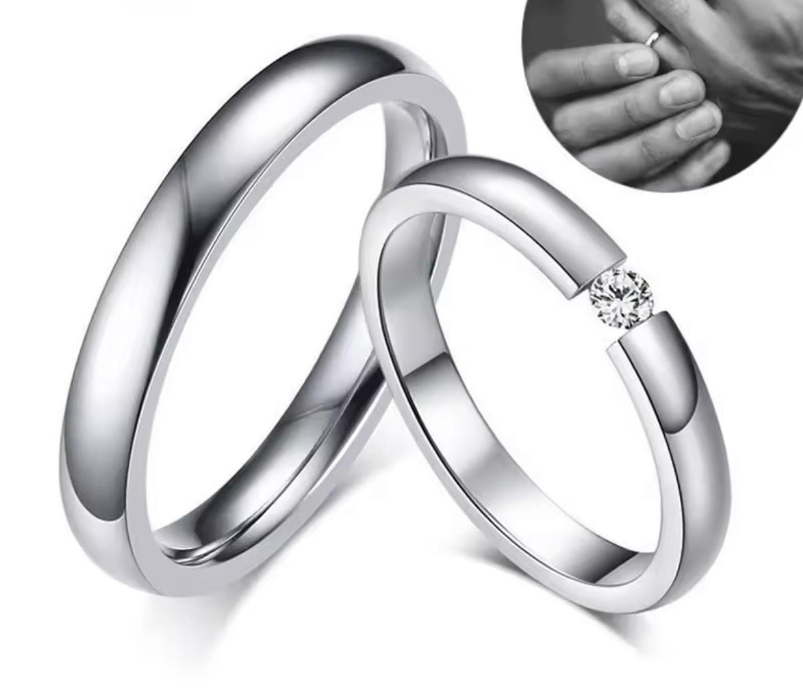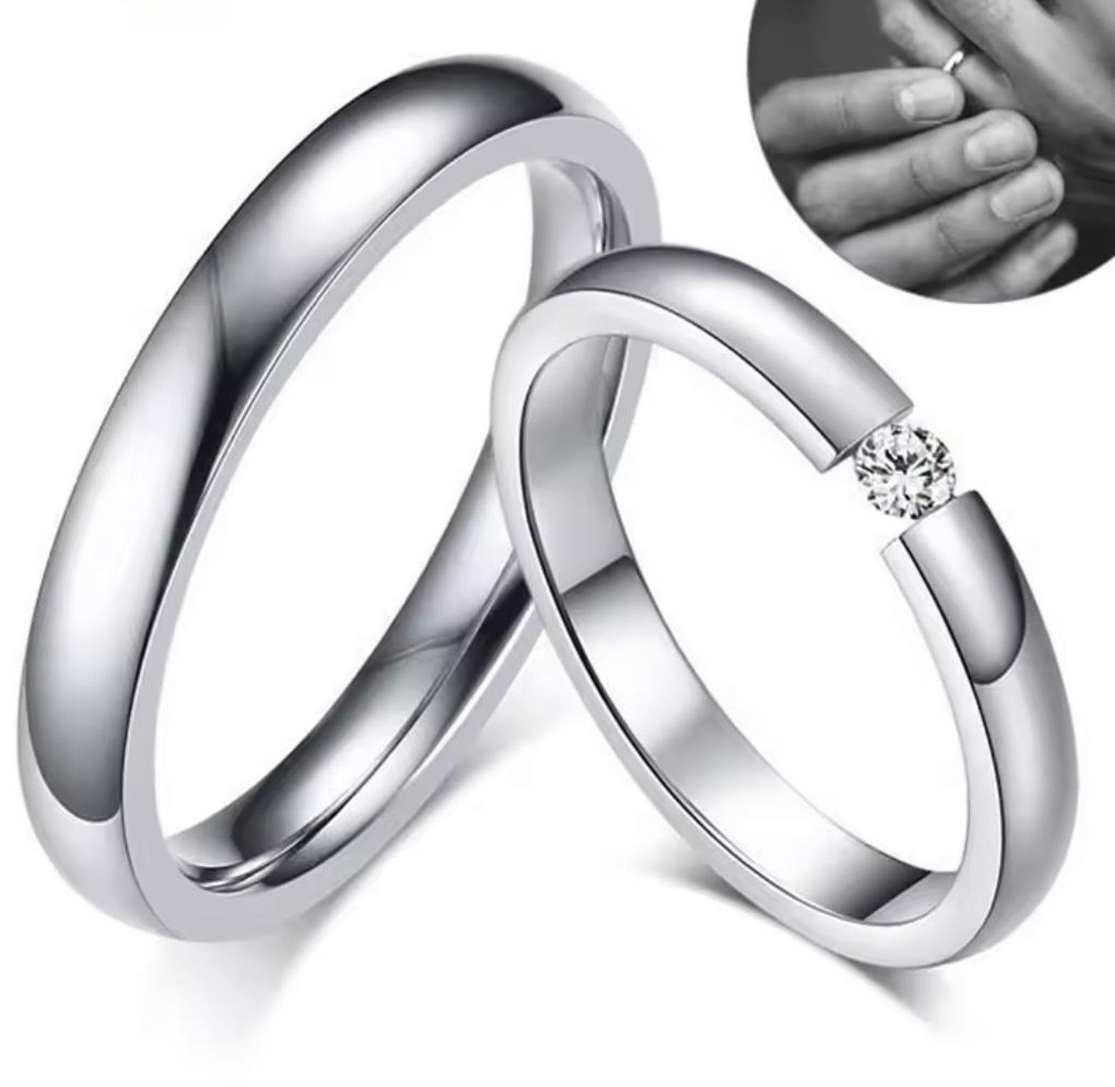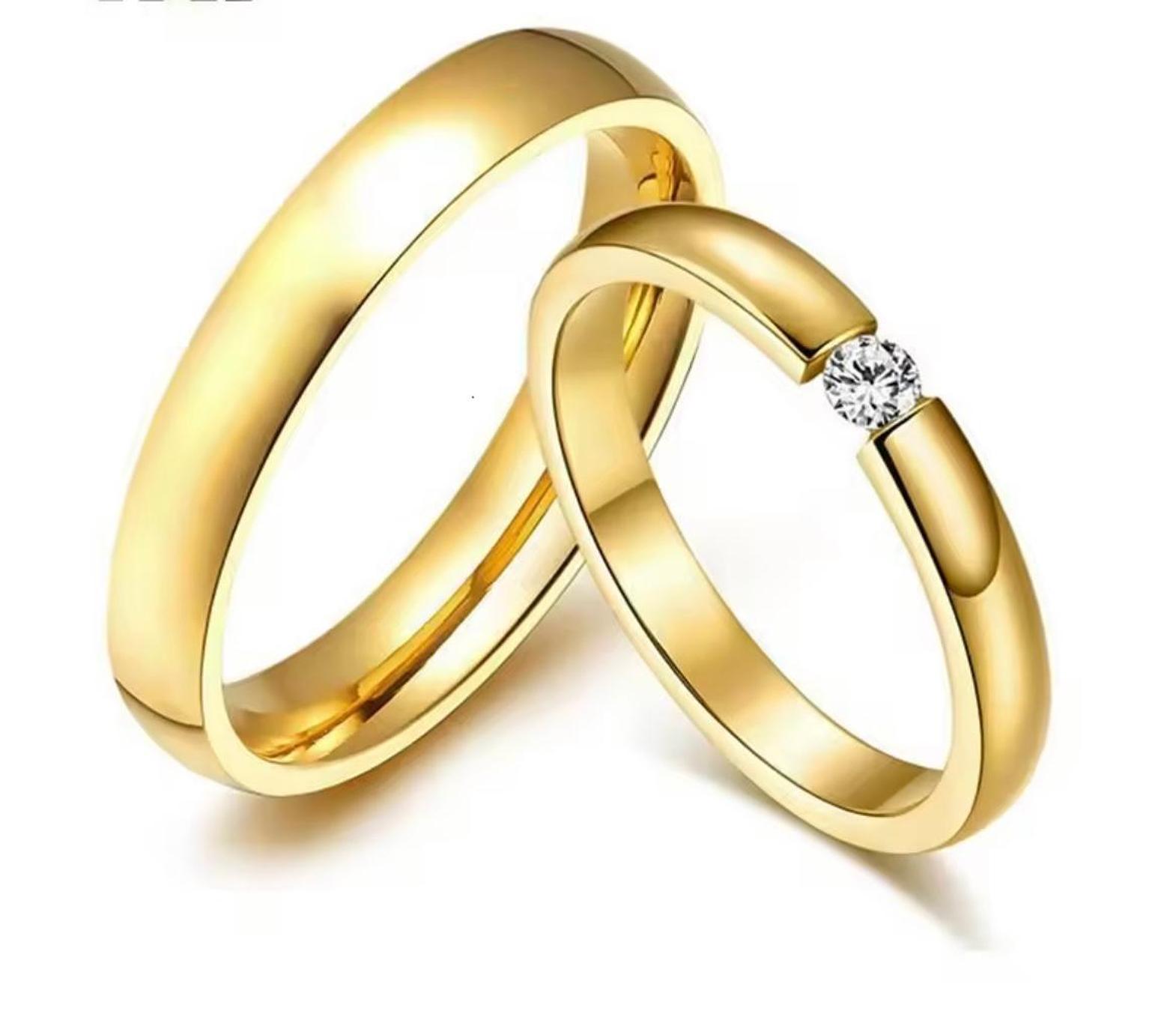 This stunning set is crafted from highly polished stainless steel and finished with a rich gold color, featuring subtly different widths for him and her. The woman's 3mm band showcases a single, bezel-set AAA cubic zirconia stone, while the man's 4mm band is characterized by a sleek, uninterrupted high-polish finish.
