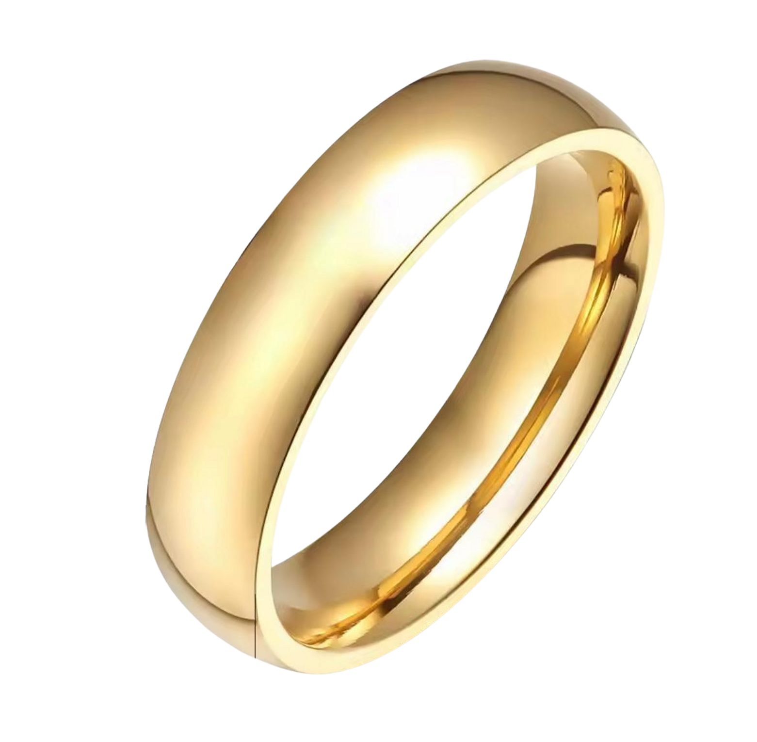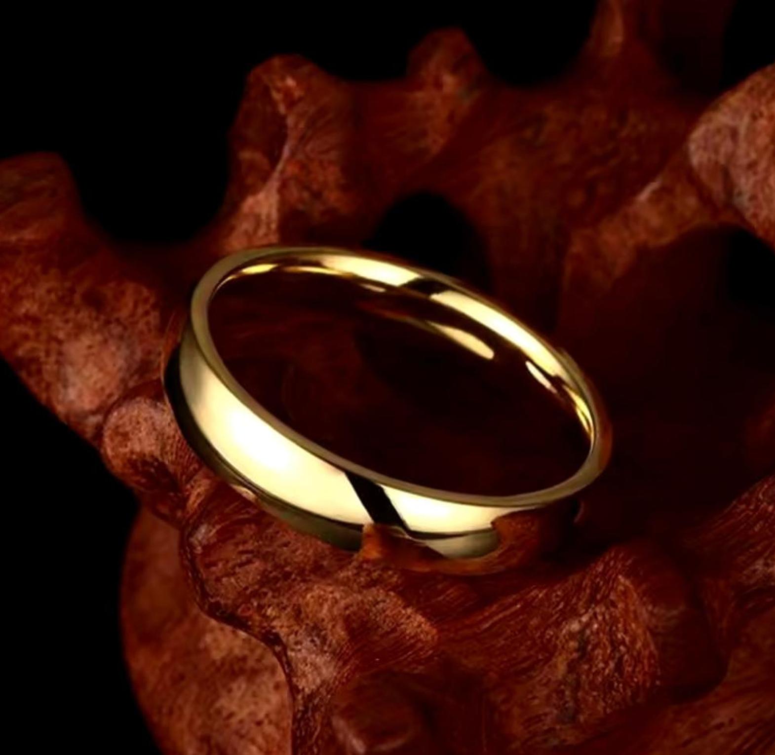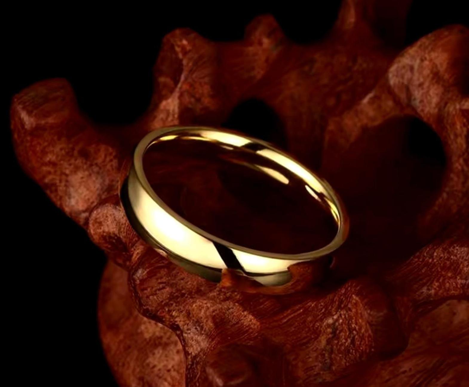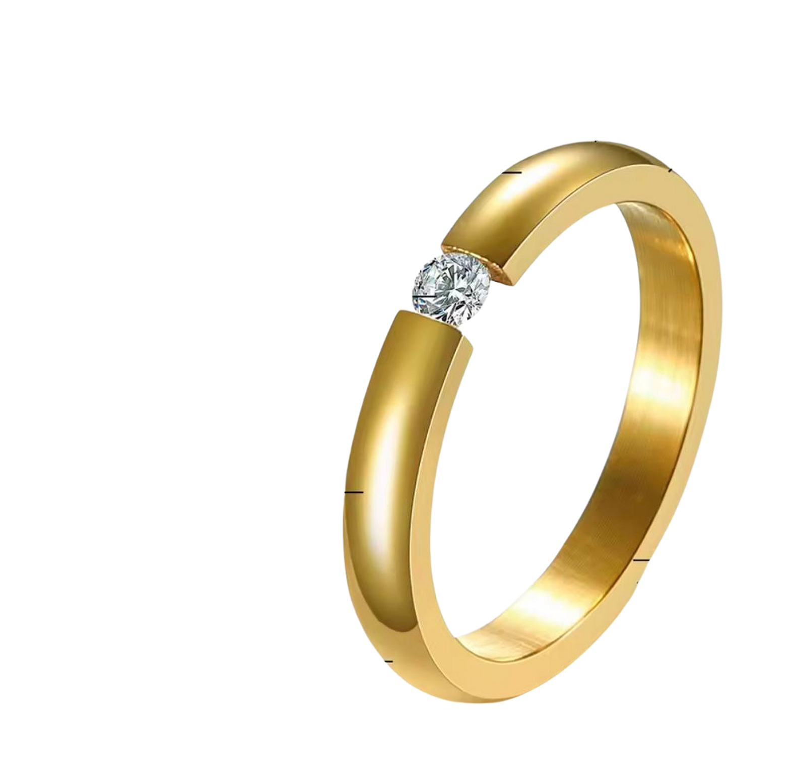 This stunning set is crafted from highly polished stainless steel and finished with a rich gold color, featuring subtly different widths for him and her. The woman's 3mm band showcases a single, bezel-set AAA cubic zirconia stone, while the man's 4mm band is characterized by a sleek, uninterrupted high-polish finish.