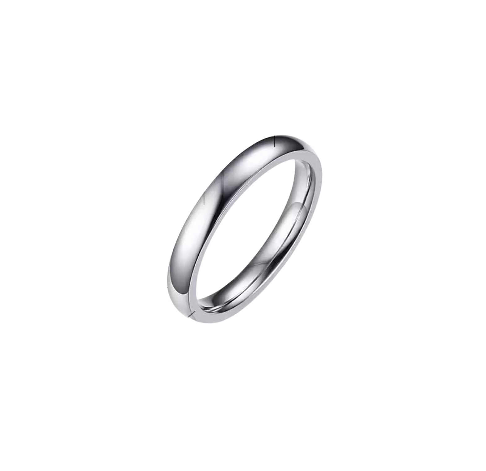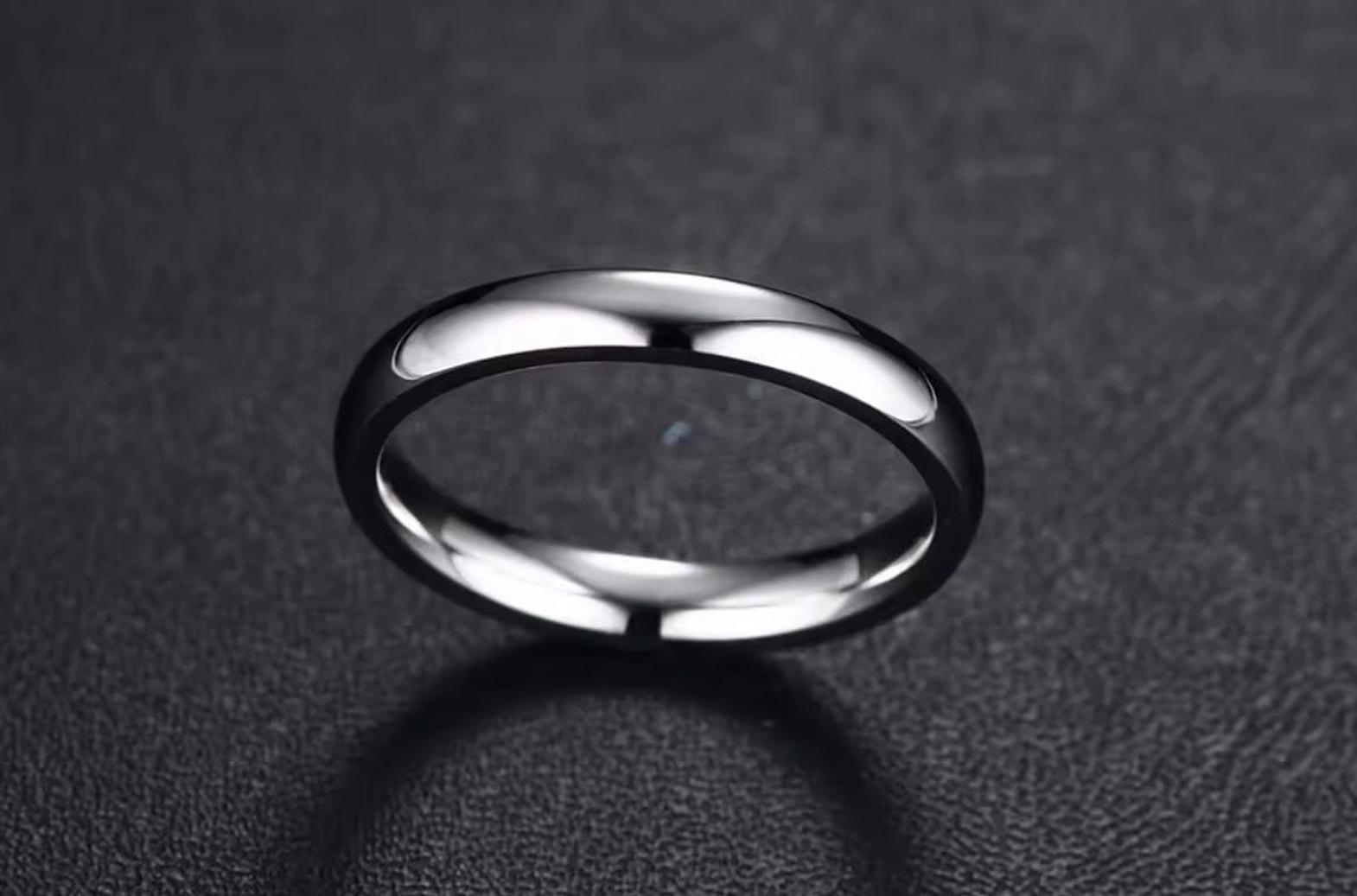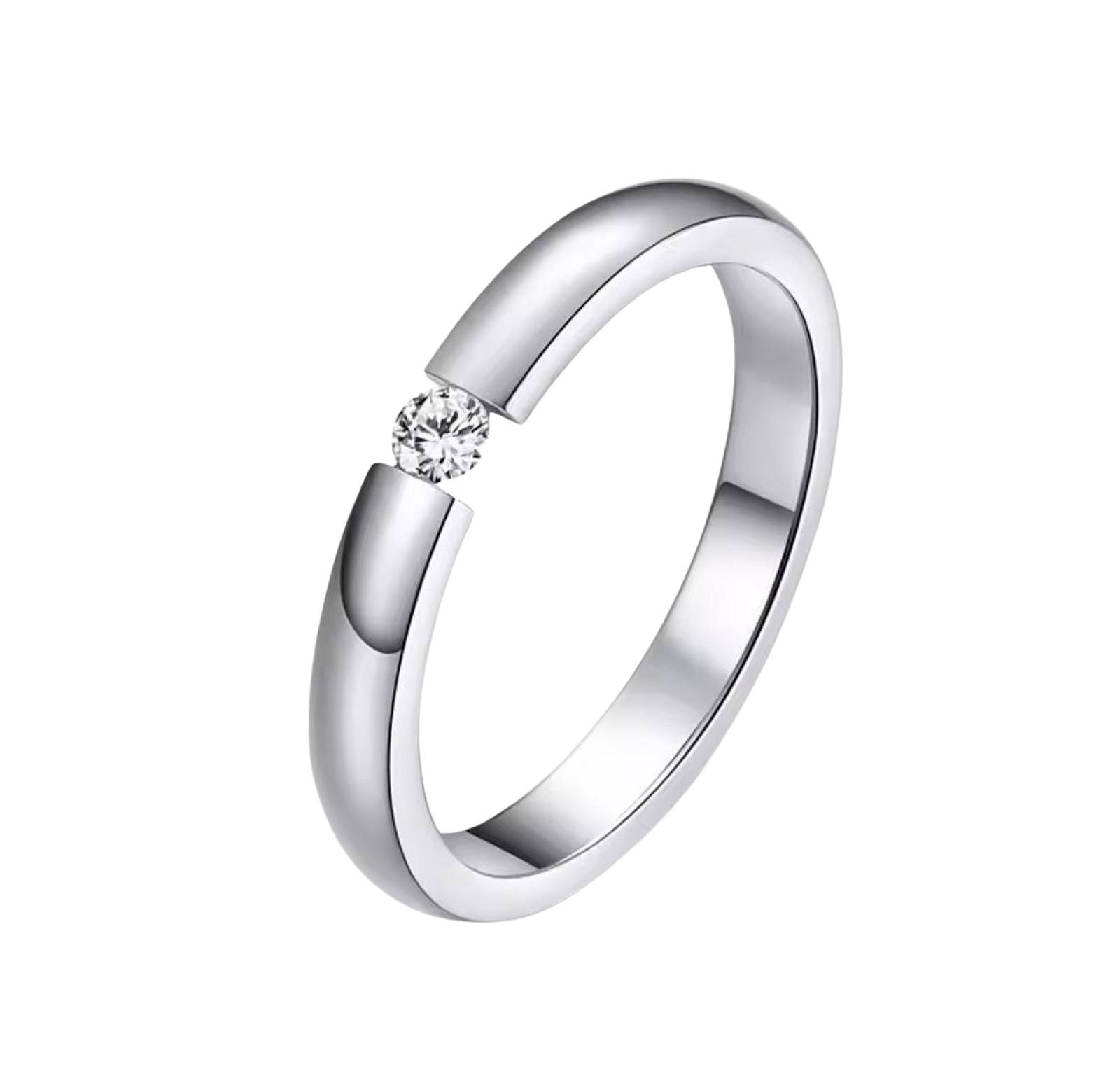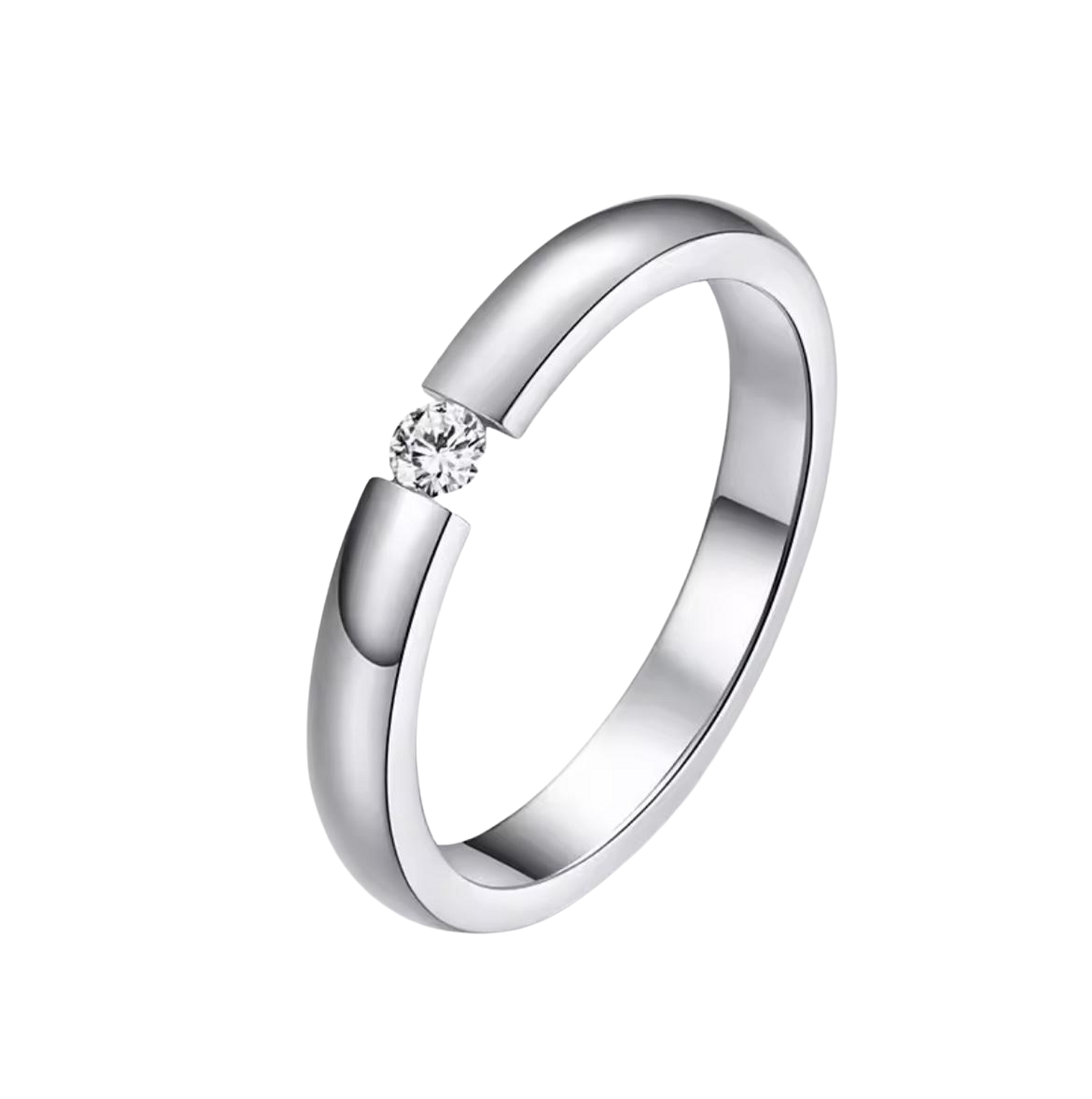 This stunning set is crafted from highly polished stainless steel and finished with a rich gold color, featuring subtly different widths for him and her. The woman's 3mm band showcases a single, bezel-set AAA cubic zirconia stone, while the man's 4mm band is characterized by a sleek, uninterrupted high-polish finish.
