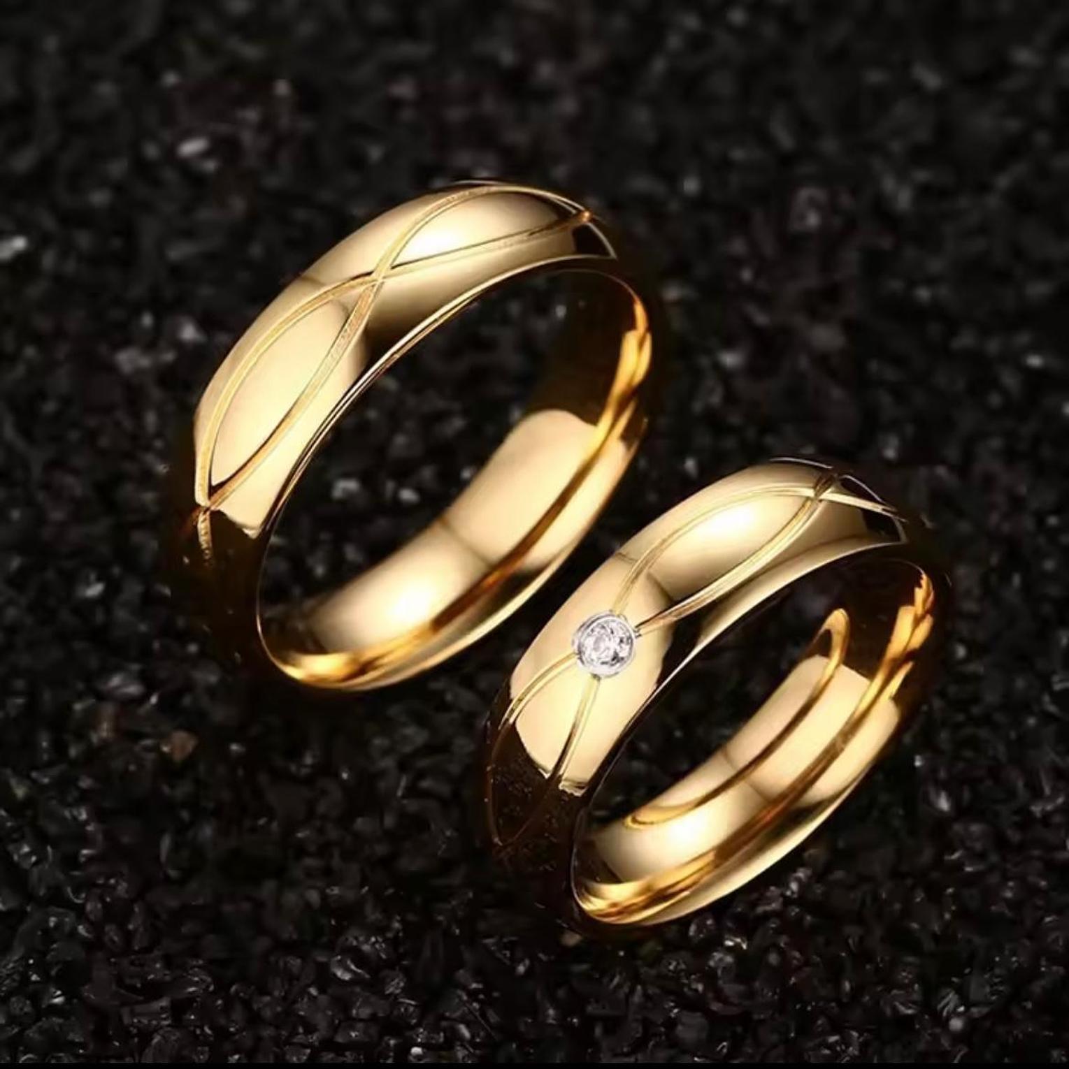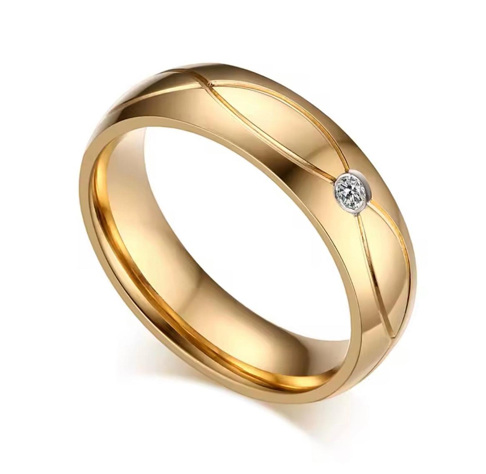 Crafted from durable stainless steel with a rich IP gold plating, this $5\text{mm}$ band is designed to be purchased individually. The male style features subtle groove patterns, while the female style is elegantly set with a single, dazzling AAA cubic zirconia stone. Men sizes 6-12, Ladies sizes 5-13