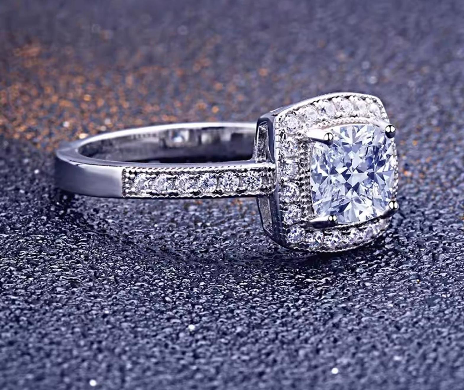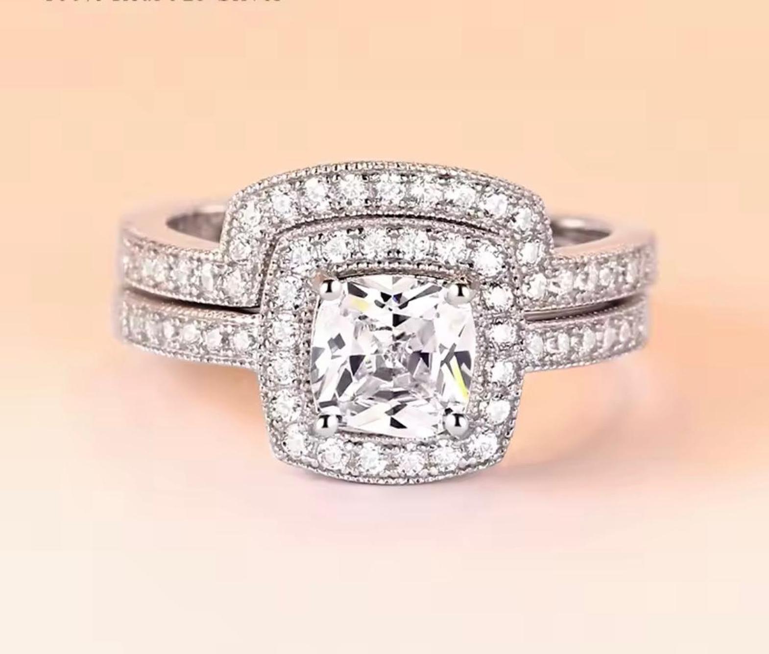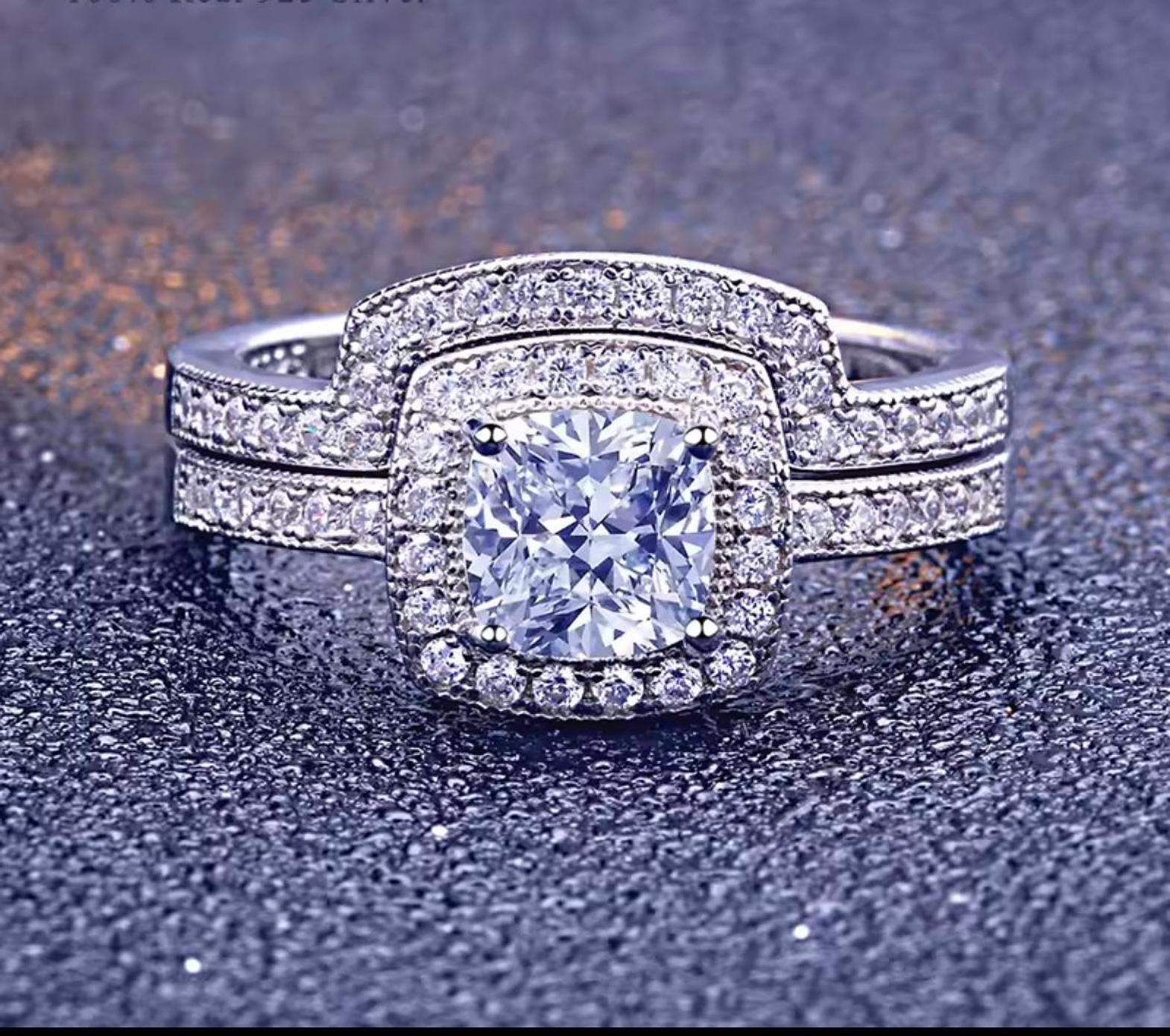 This magnificent two-piece bridal set features a bold, square-shaped center cubic zirconia gems surrounded by a double halo of brilliance. Crafted from 100% Real S925 Silver, this set is designed to be hypoallergenic and promises stunning, light-catching sparkle. Size 5-10
