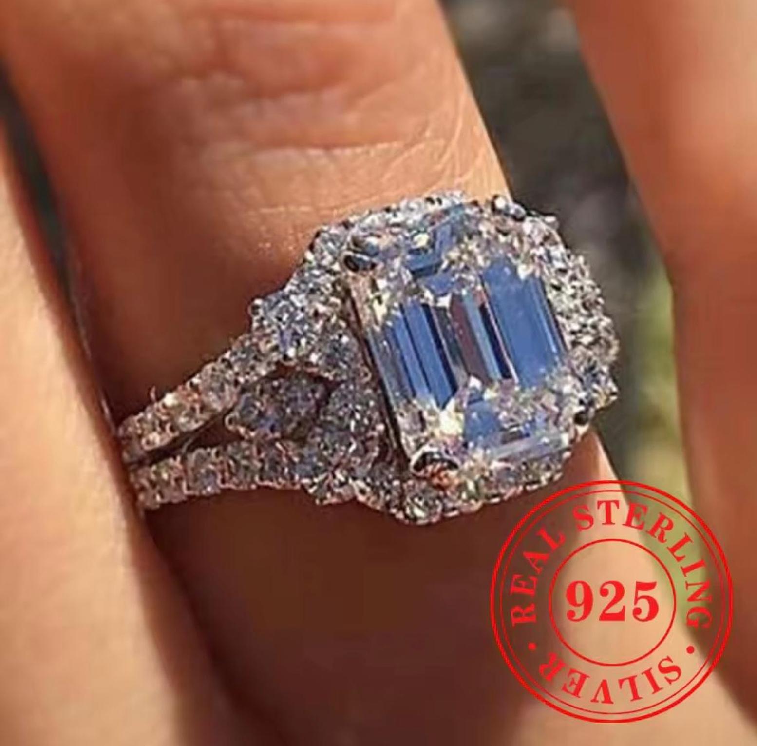 This breathtaking set features a prominent Emerald-Cut center crystal surrounded by a glittering halo and side crystals. It is crafted from authentic Real Sterling Silver S925, providing a bright, durable white metal foundation for maximum light performance.