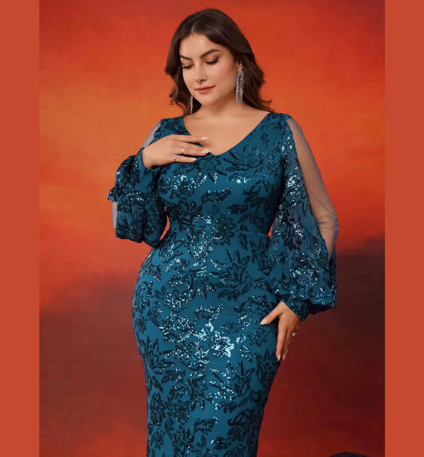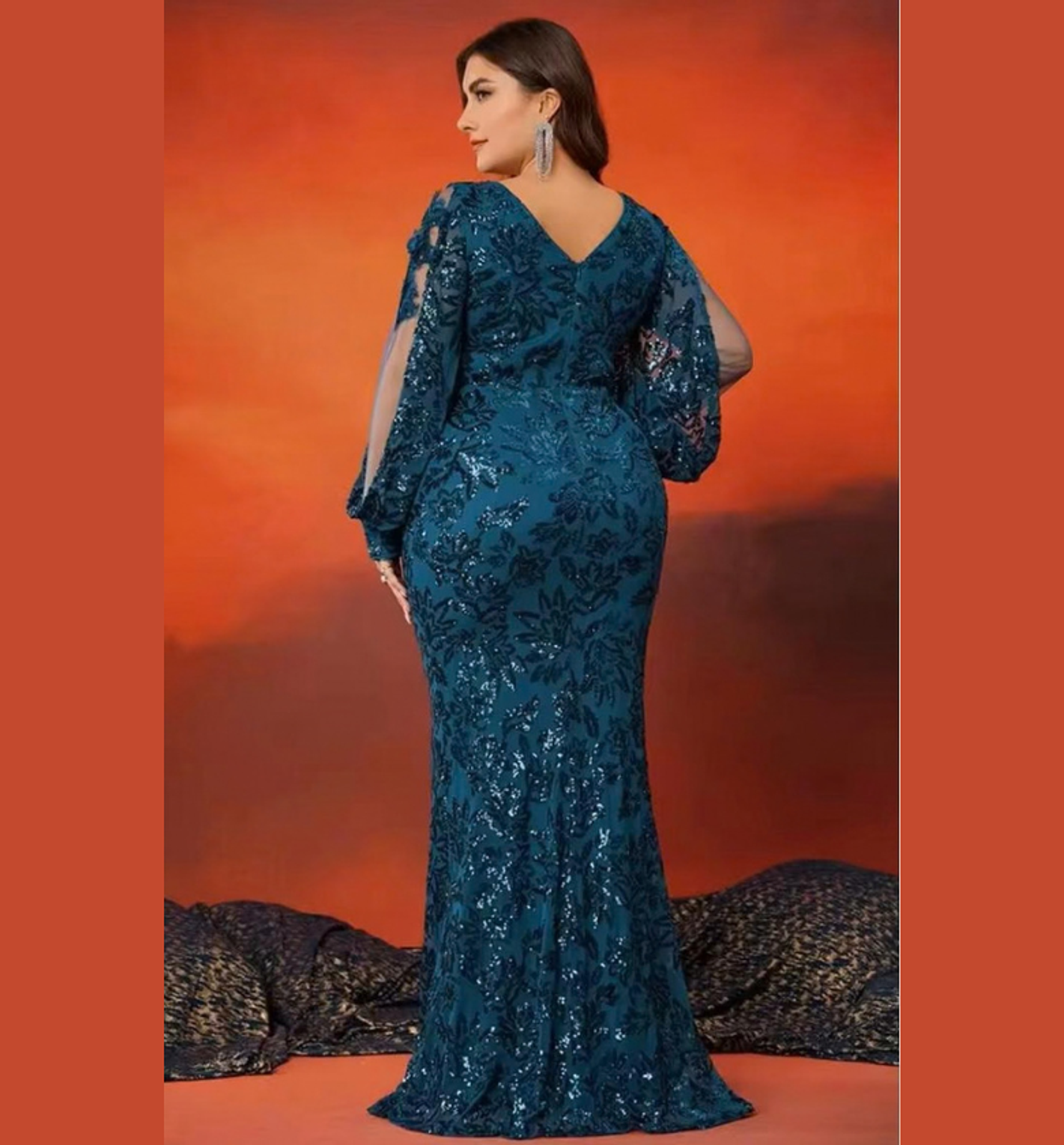 Command the room in the Elara Gown, a stylish dress that masterfully combines texture and light. This elegant dress is defined by its stunning all-over floral sequin embroidery, which creates a multidimensional shimmer against the deep teal backdrop. As a premium women’s dress, it features a sophisticated V-neckline and sheer, voluminous bishop sleeves that add an air of ethereal romance to the structured mermaid silhouette. Every inch of this fashion dress is designed to celebrate your figure, tapering elegantly through the bodice before flaring into a graceful floor-length hem.