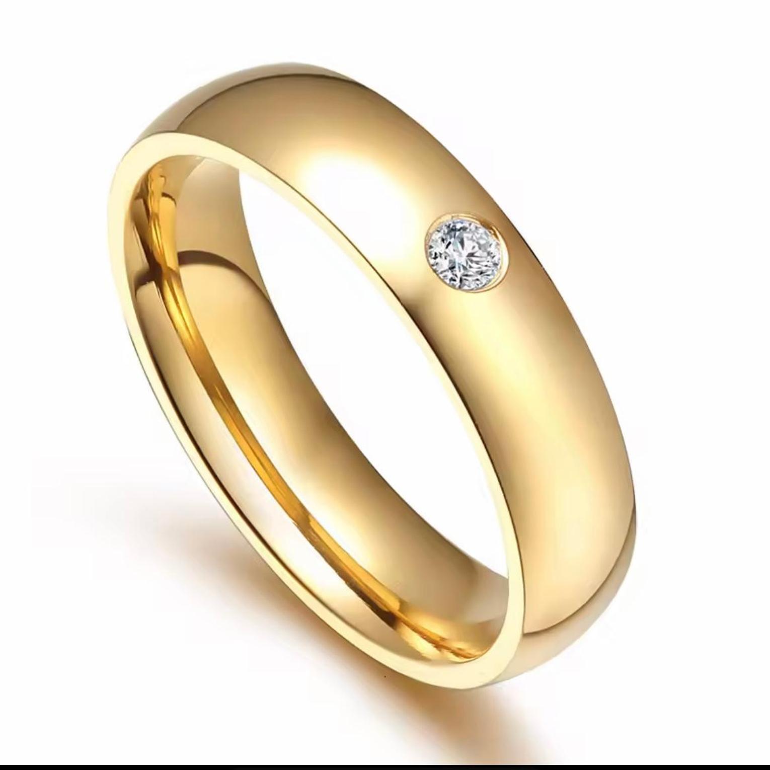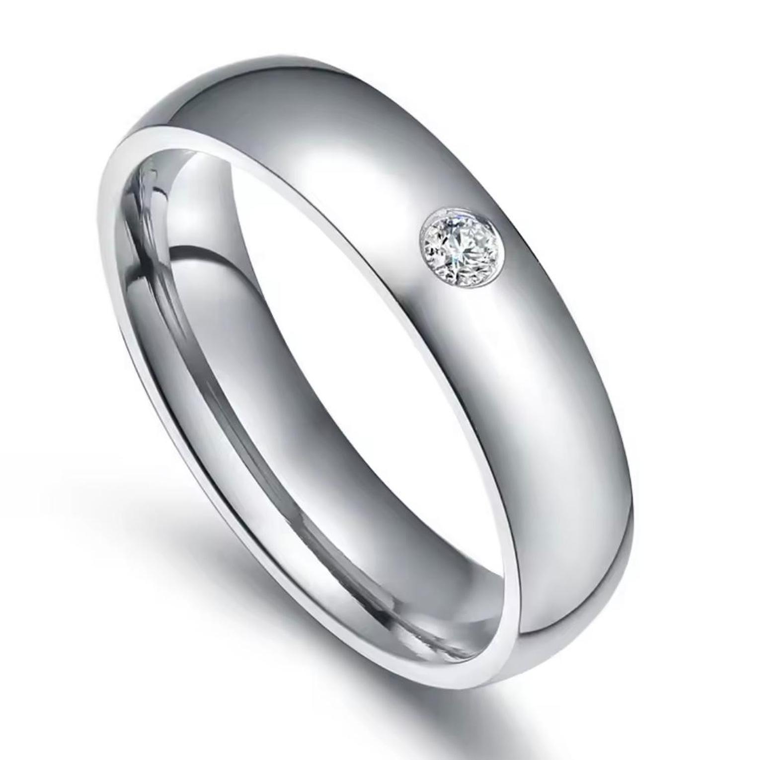 This 4 mm band, crafted from resilient stainless steel, is available in both radiant gold color and sleek silver plated finishes, offering versatile style for both genders. The female version features a delicate cubic zirconia stone, while the male band maintains a simple, high-polished elegance.