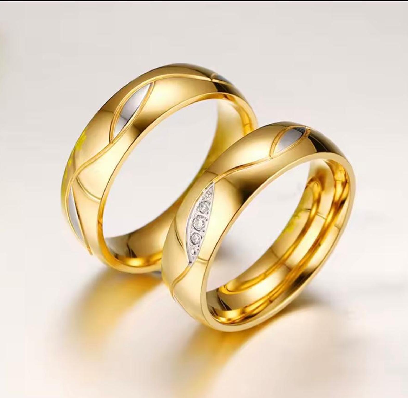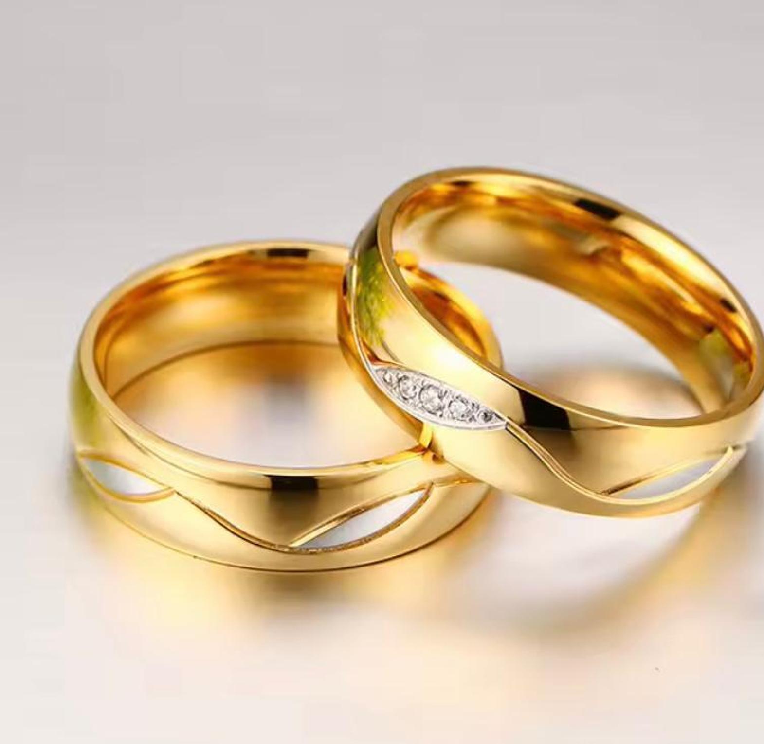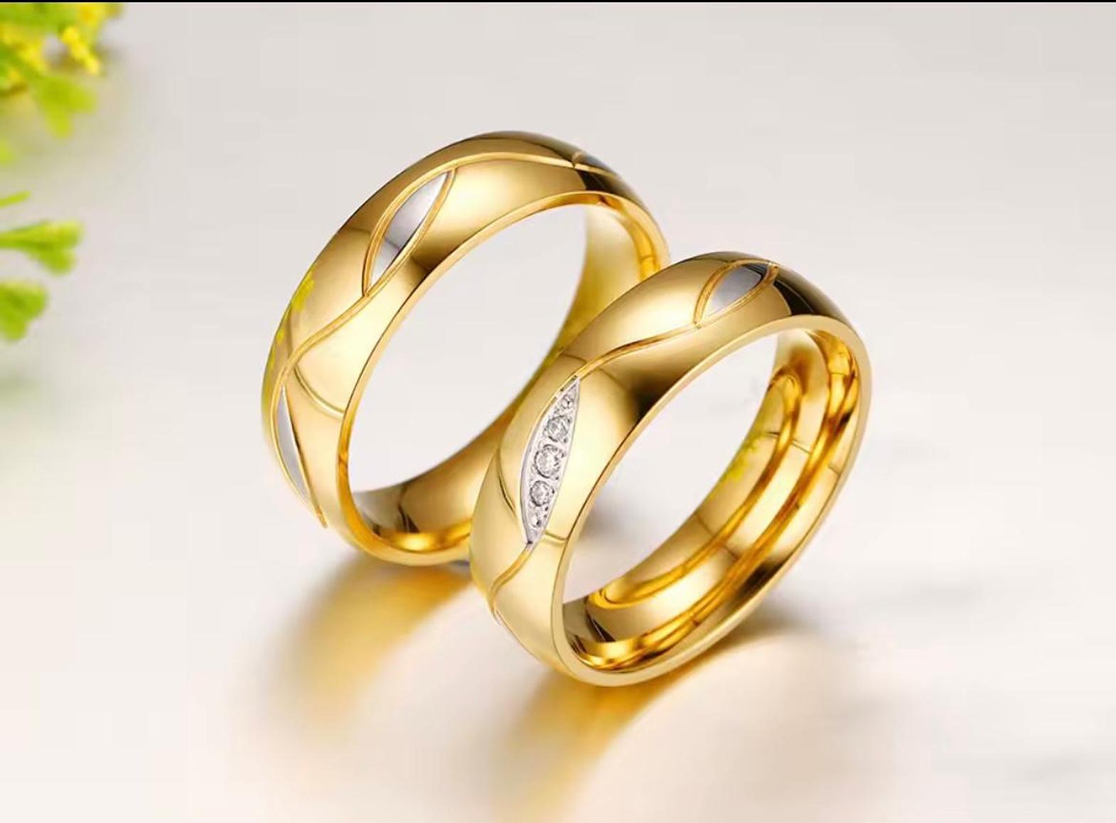 These striking 4 mm bands are crafted from stainless steel with a rich gold color and a sophisticated wave design. The female ring features an elegant inset of cubic zirconia stones, while the male band is distinguished by a clean, geometric pattern.