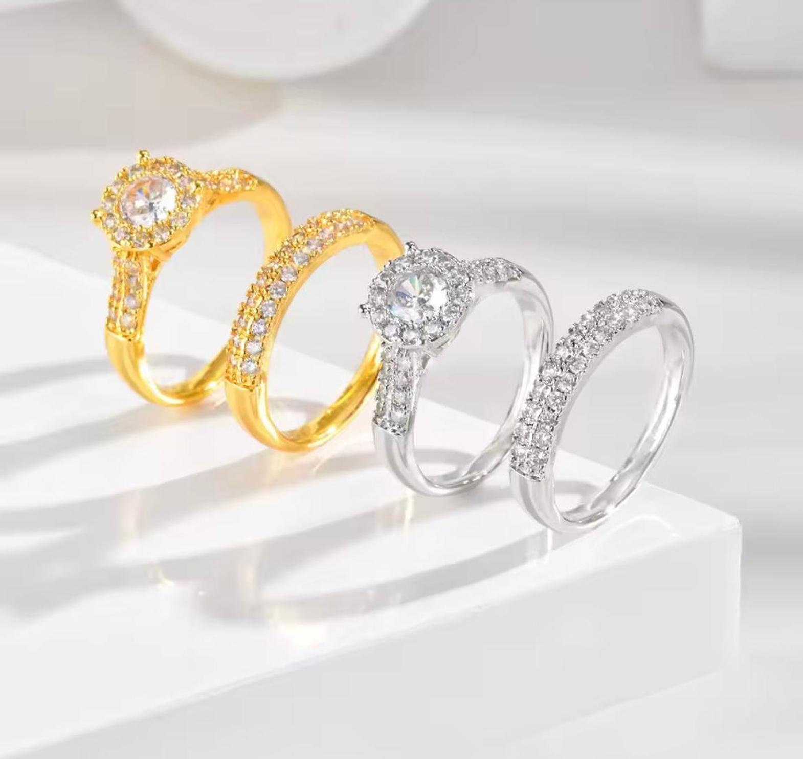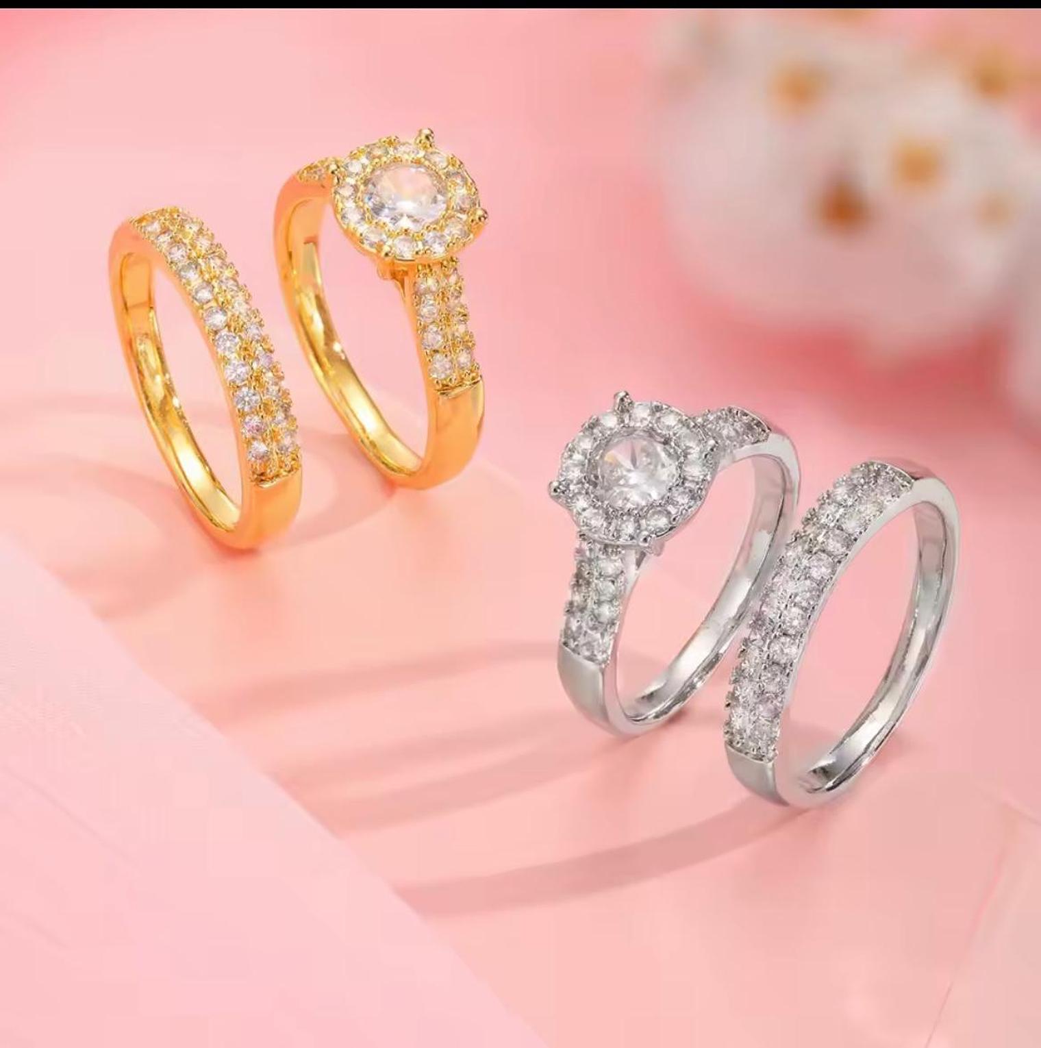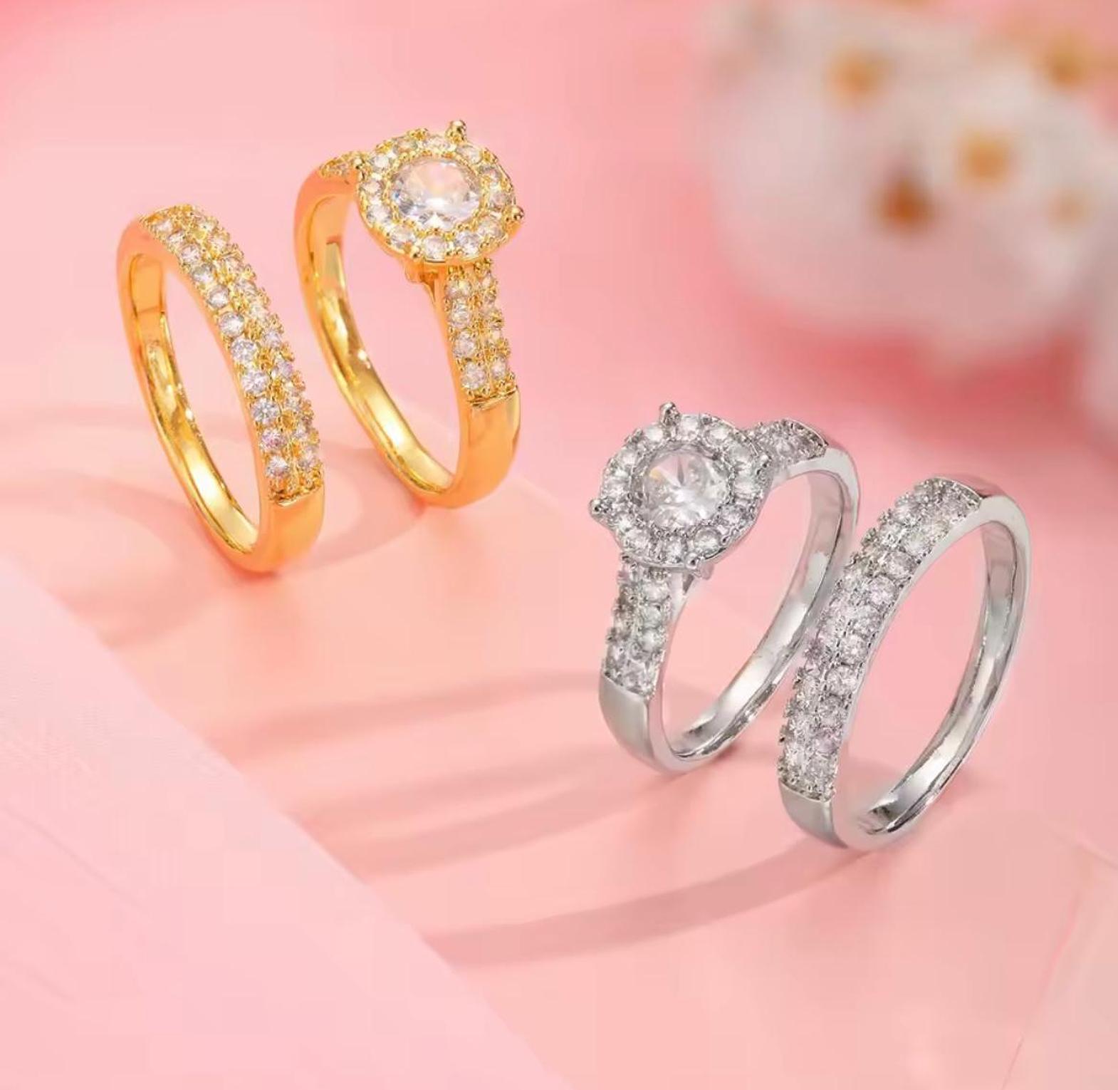 This stunning double ring set is crafted from resilient stainless steel, available in both radiant gold and classic silver platings. Each piece is meticulously engraved and adorned with brilliant cubic zirconia stones, offering exceptional sparkle and elegance.
