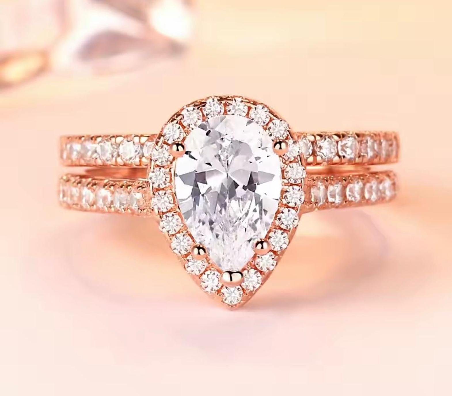 This romantic two-piece bridal set features a brilliant S925 Pure Silver base, available in both a delicate rose gold plating and a classic silver color. The main ring showcases a dazzling pear-shaped cubic zirconia center stone encircled by a halo of micro-pave gems. Sizes 4-10