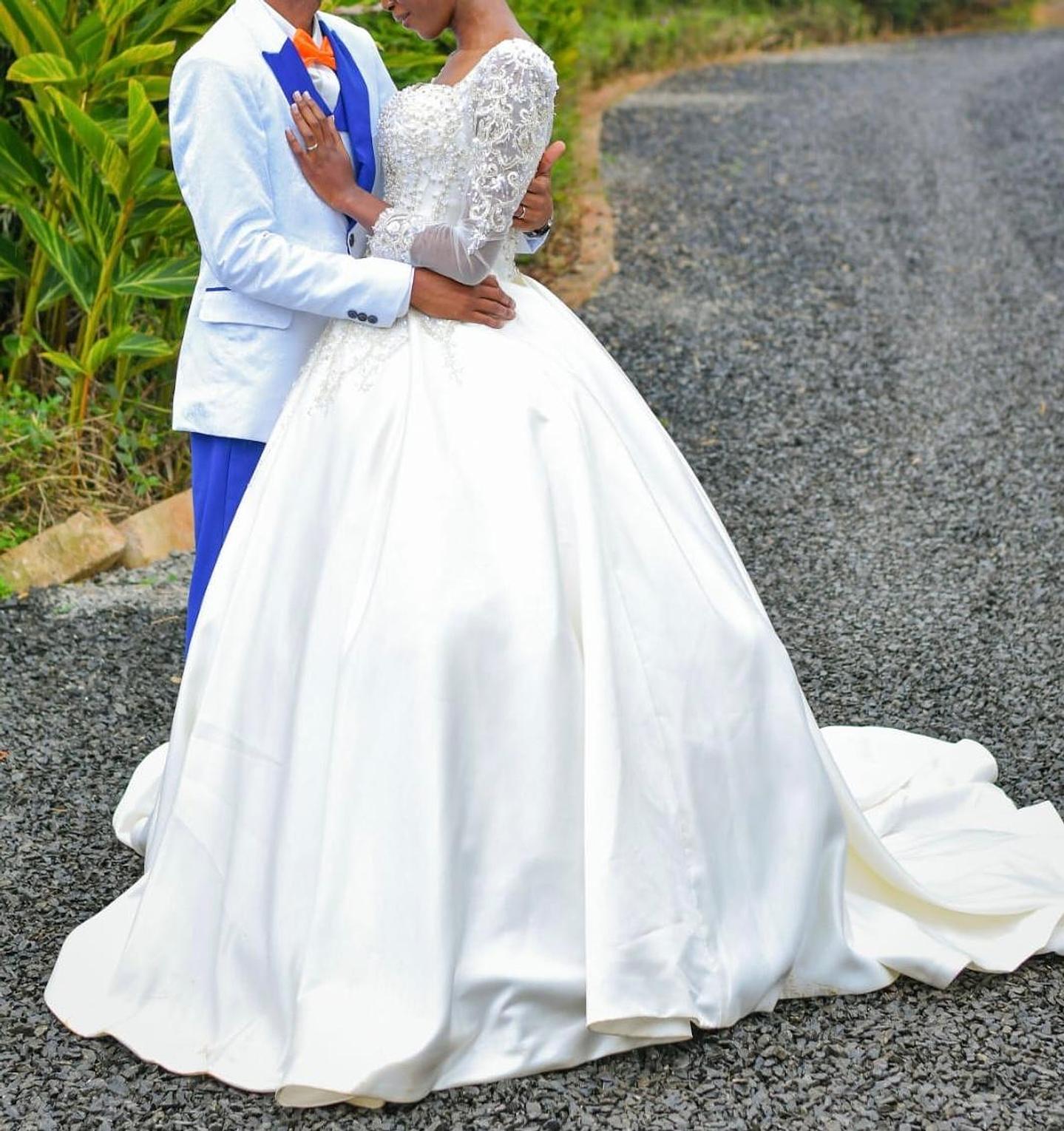 This breathtaking voluminous ballgown features a luxurious, structured satin skirt that flows into a regal train for maximum impact. The fitted bodice and sheer long sleeves are beautifully adorned with intricate hand-placed lace and beading for a touch of refined elegance.