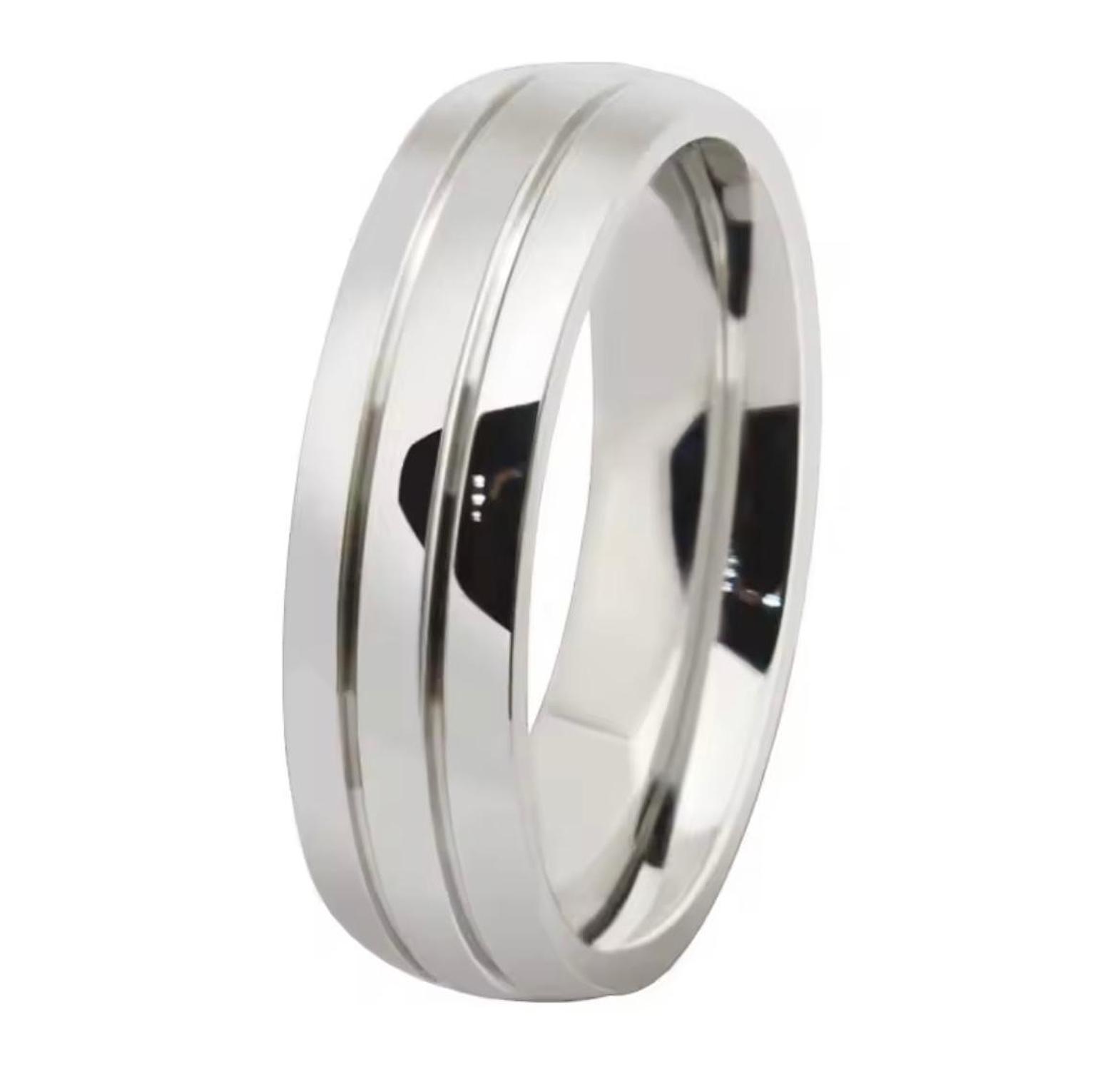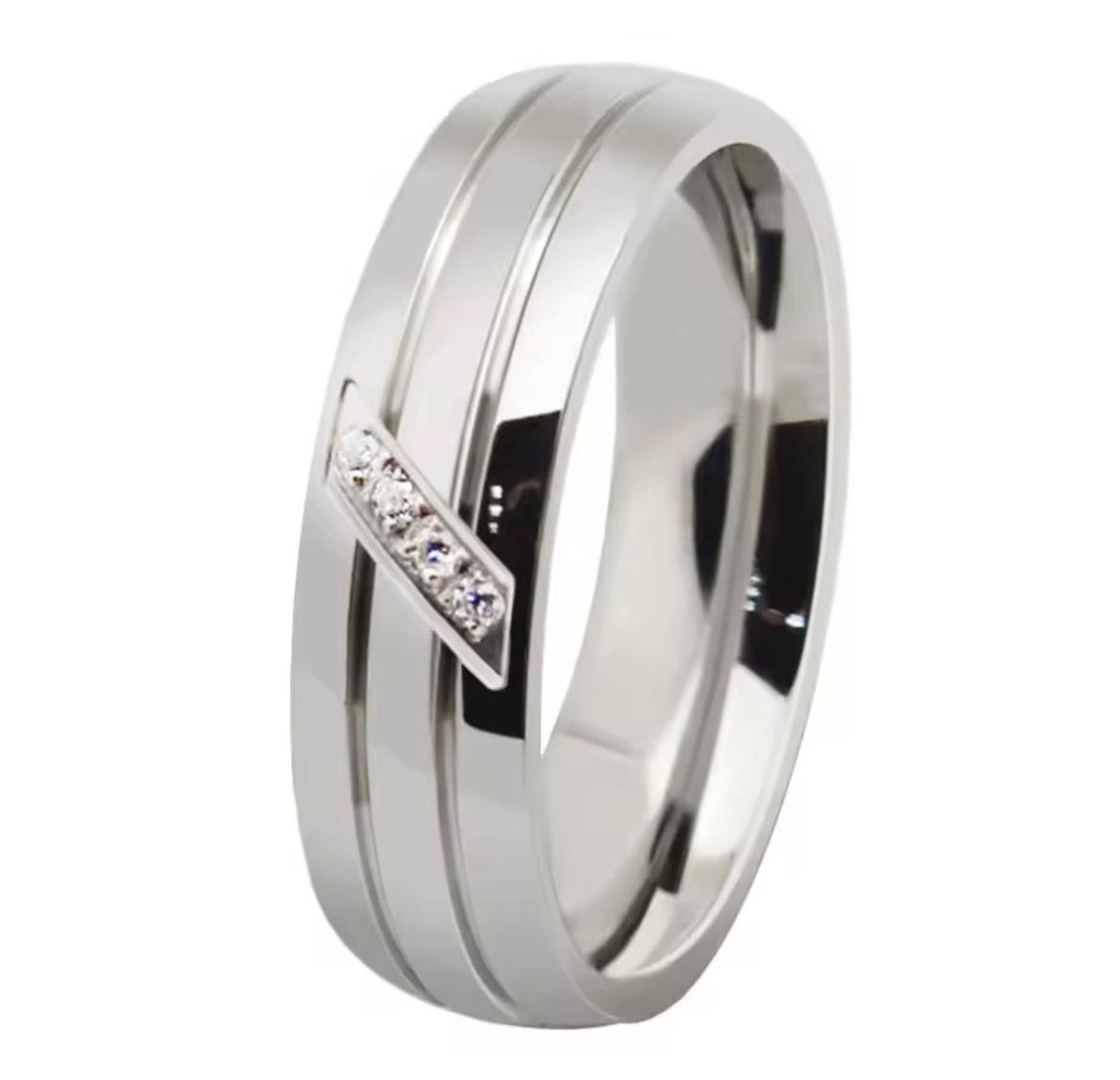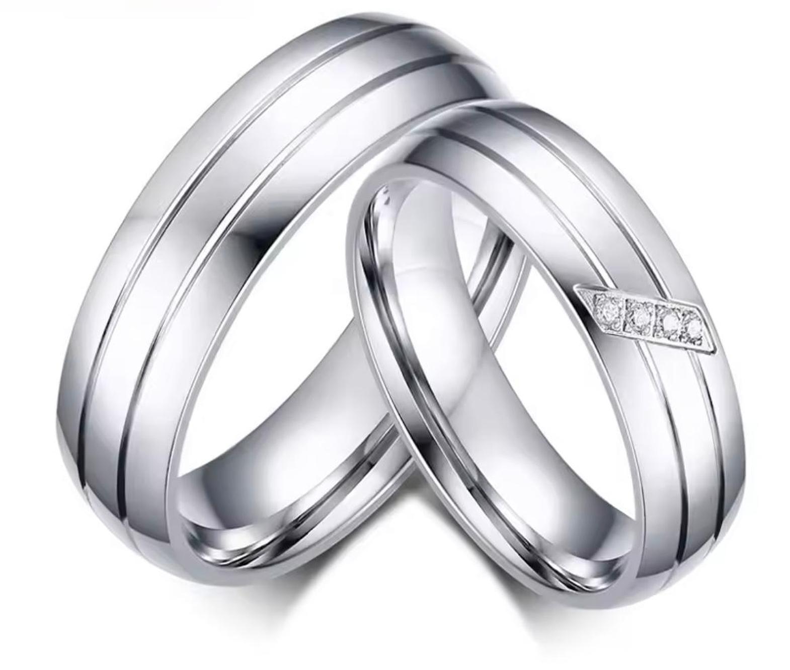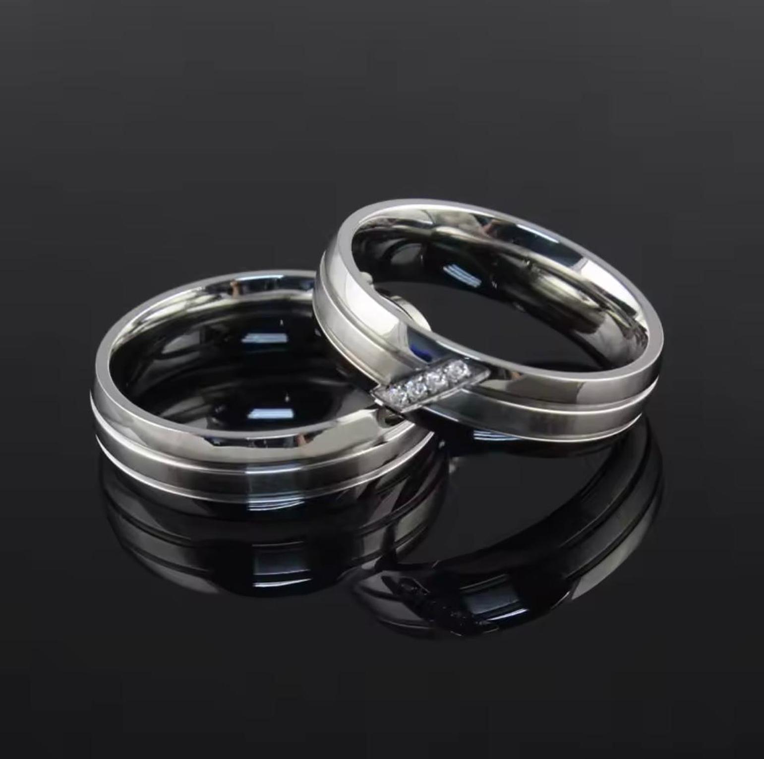 These matching stainless steel rings feature a distinctive satin-brushed finish with parallel, polished grooves that circle the band for modern dimension. The woman’s ring is uniquely enhanced by a diamond-shaped accent set with four brilliant cubic zirconia stones. Men sizes 5-13, Ladies sizes 5-13